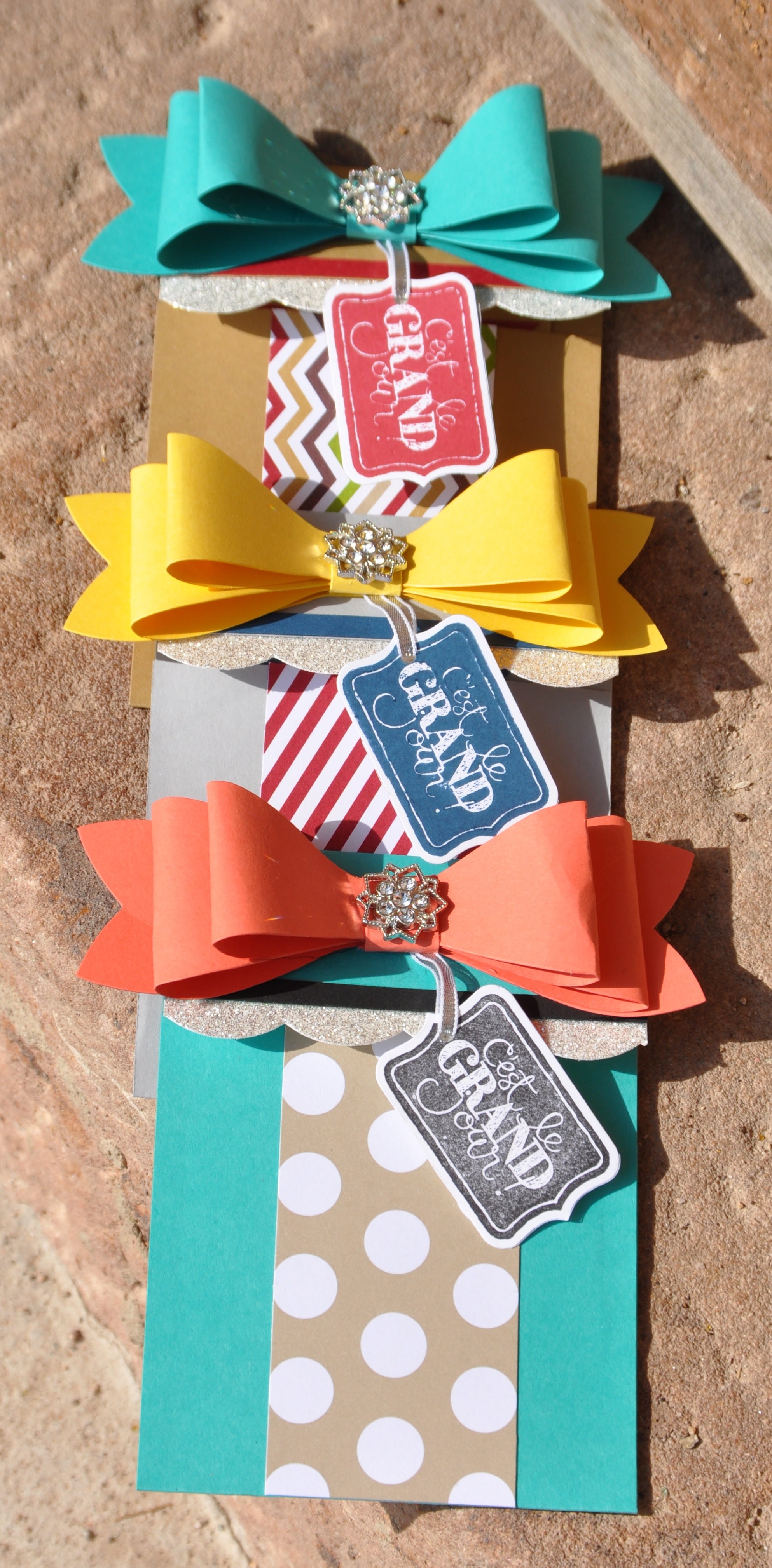 Les créations que je vous propose sont des cartes cadeaux avec un zolie noeud fait avec la découpe « Noeud parfait », du papier « du style à revendre » ainsi qu’un joli embellissements « touche de givre ». J’ai eu le plaisir d’en offrir une à ma future recrue et sa soeur avec qui j’ai passé une très agréable après-midi !!!!!