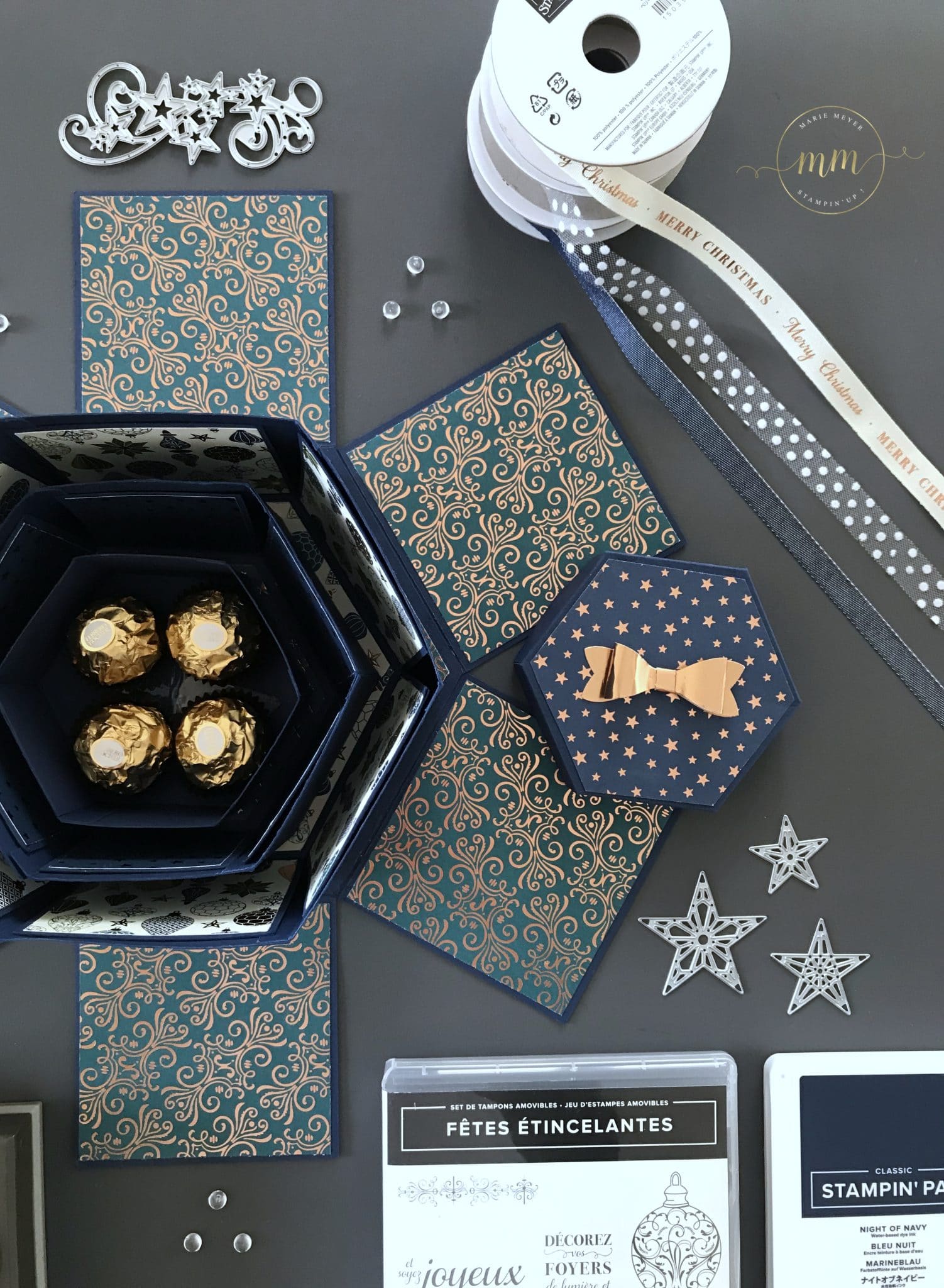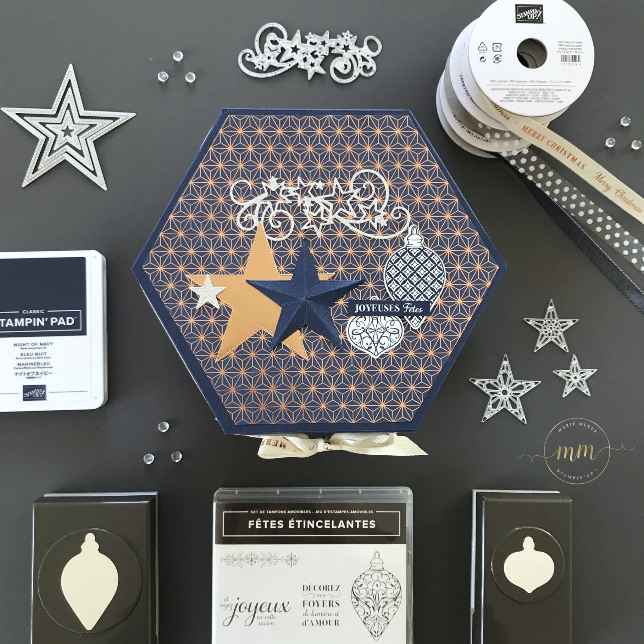 Pour se faire j’ai utilisé du papier bleu nuit, papier cuivre et également notre magnifique Papier Design Spécialité Lumière Etincelante qui n’est malheureusement plus disponible à la vente, vu le succès de ce catalogue Automne Hiver 2019 ! Pour les embellissements, j’ai usé des Poinçons Etoiles à coudre et du Set de tampons Fêtes Etincelantes avec ses Perforatrices assorties Ornements Etincelants. Enfin, une superbe colle qui ne gondole pas et énormément de patience lol !
