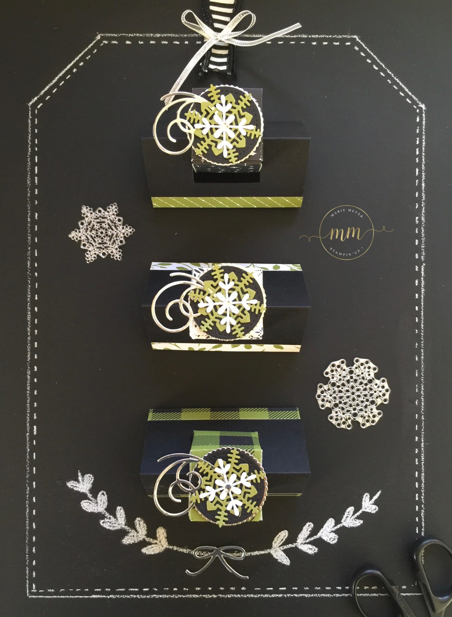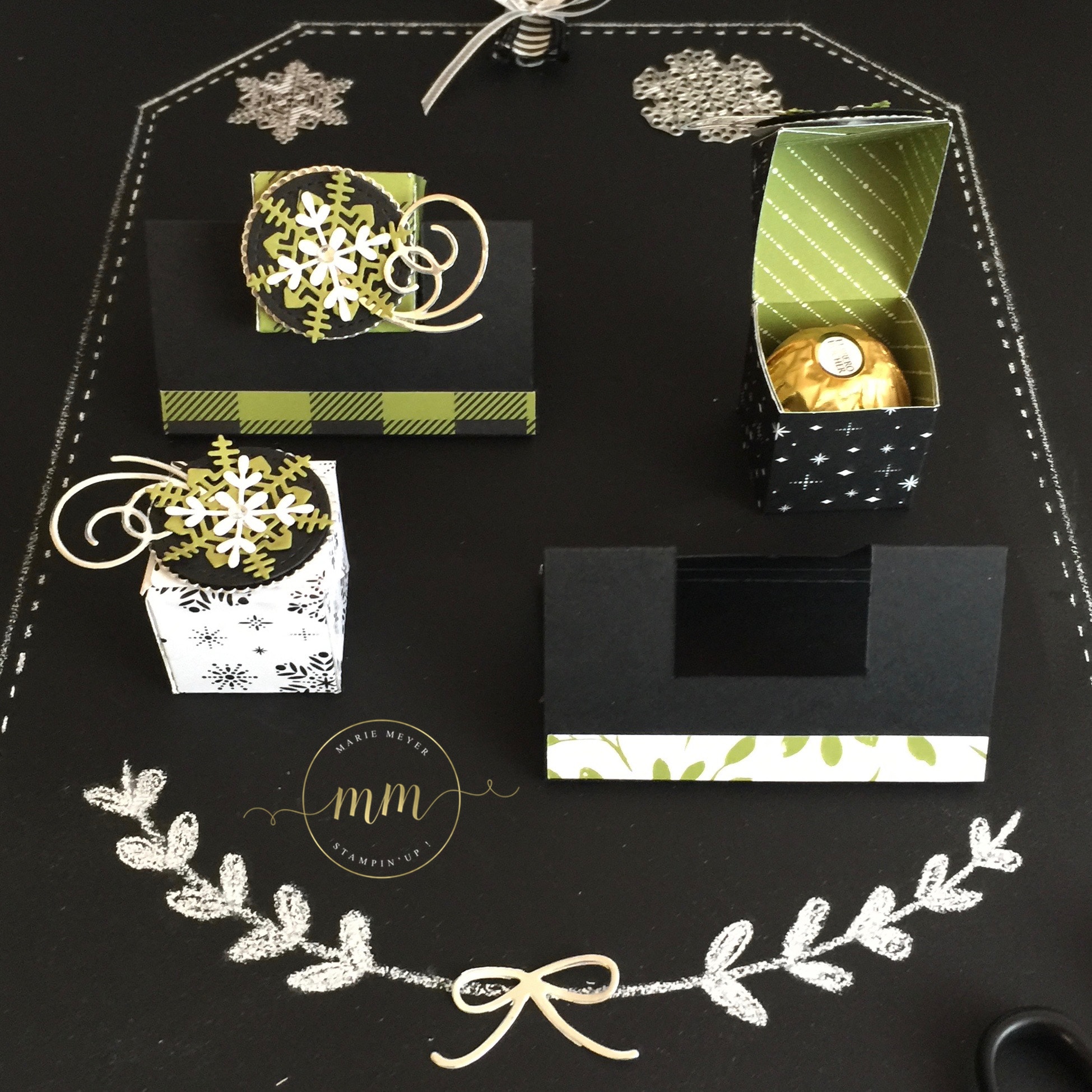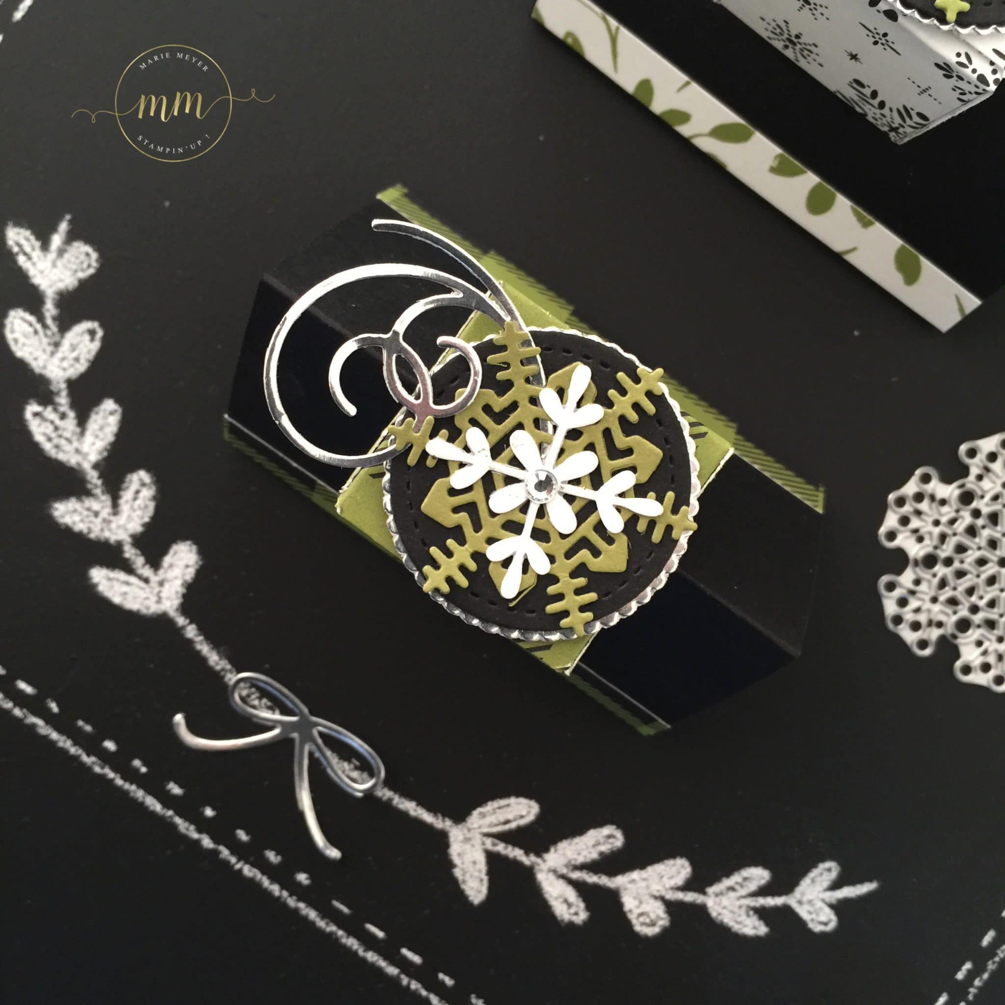 En ce qui concerne le papier utilisé, c’est une de mes clientes, Brigitte ;-), pour ne pas la citer, qui m’a « obligée » à sortir de ma zone de confort des couleurs de Noël que j’utilisent habituellement (rouge et vert). En effet, pour son atelier à domicile, elle souhaitait que je présente un projet avec le papier de la série Design Jolies Fêtes, dans des teintes noir et vert olive. Du coup, je la remerciement grandement !
