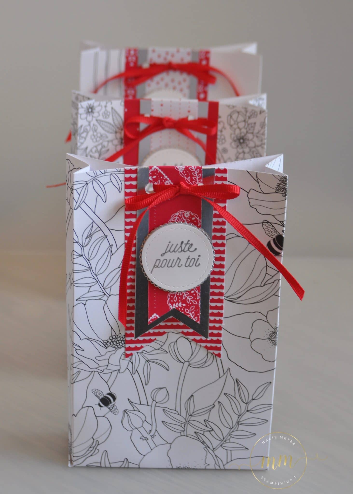 Il s’agit de boîtes que j’ai réalisé avec la planche insta pochette et le superbe papier de la série Design Coloriez-moi qui vous est offert dès 60 € d’achat (hors frais de port) durant la période de la sale a bration, qui se termine demain soir. Elles sont très faciles et rapides à faire avec la planche insta pochette et surtout grâce à cette planche, les formats et les longueurs sont variables à l’infini. Si vous ne l’avez pas encore dans votre scraproom, je vous conseille de vous l’offrir. C’est un achat que vous ne regretterez pas.