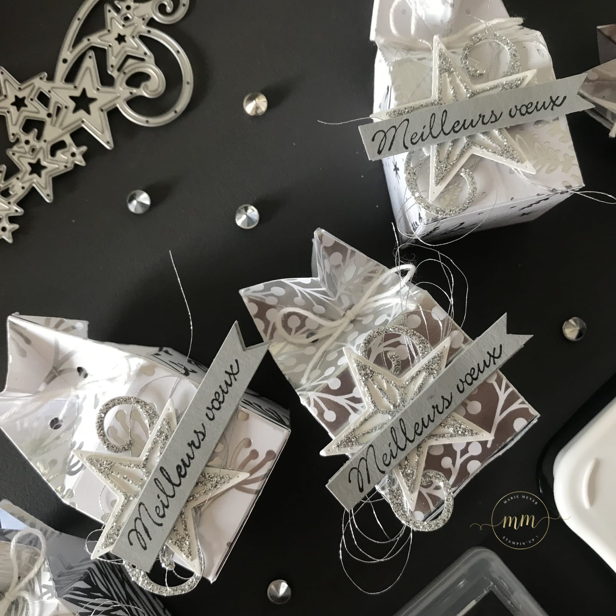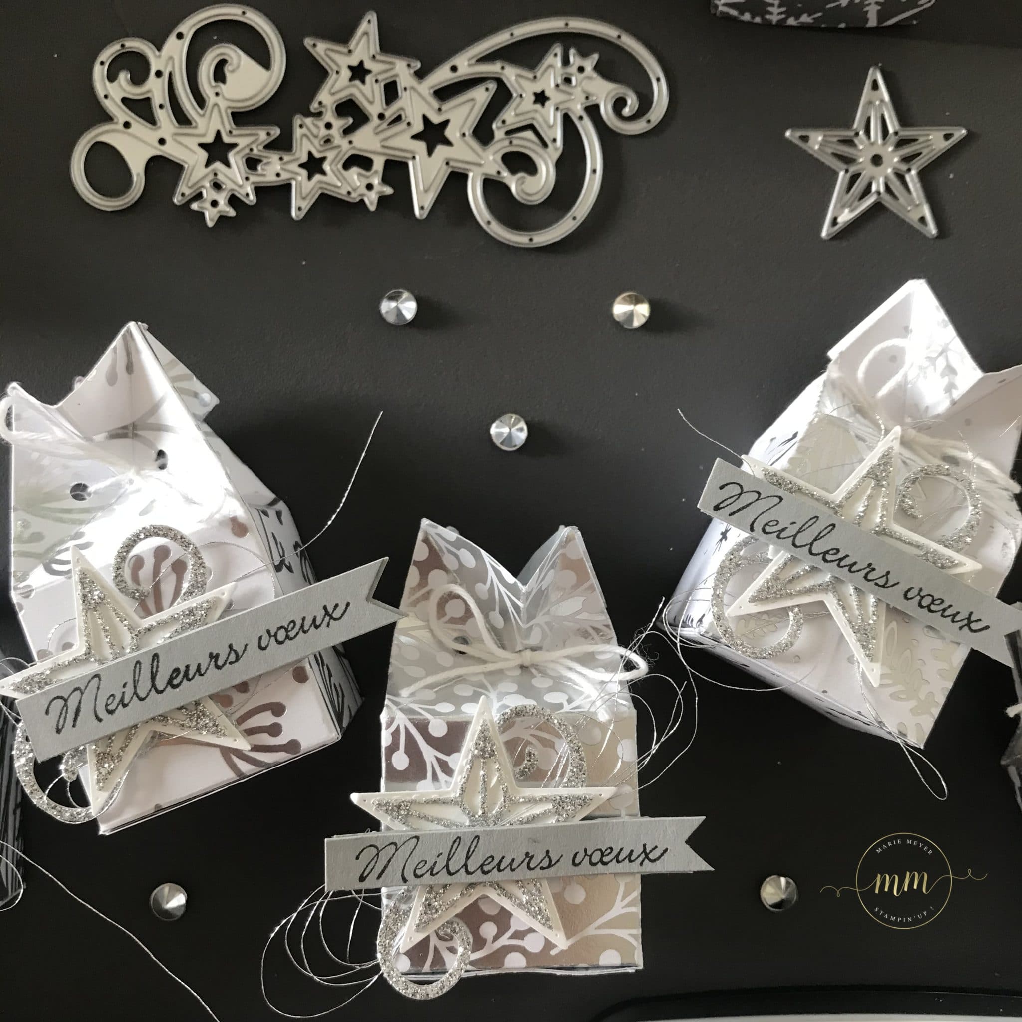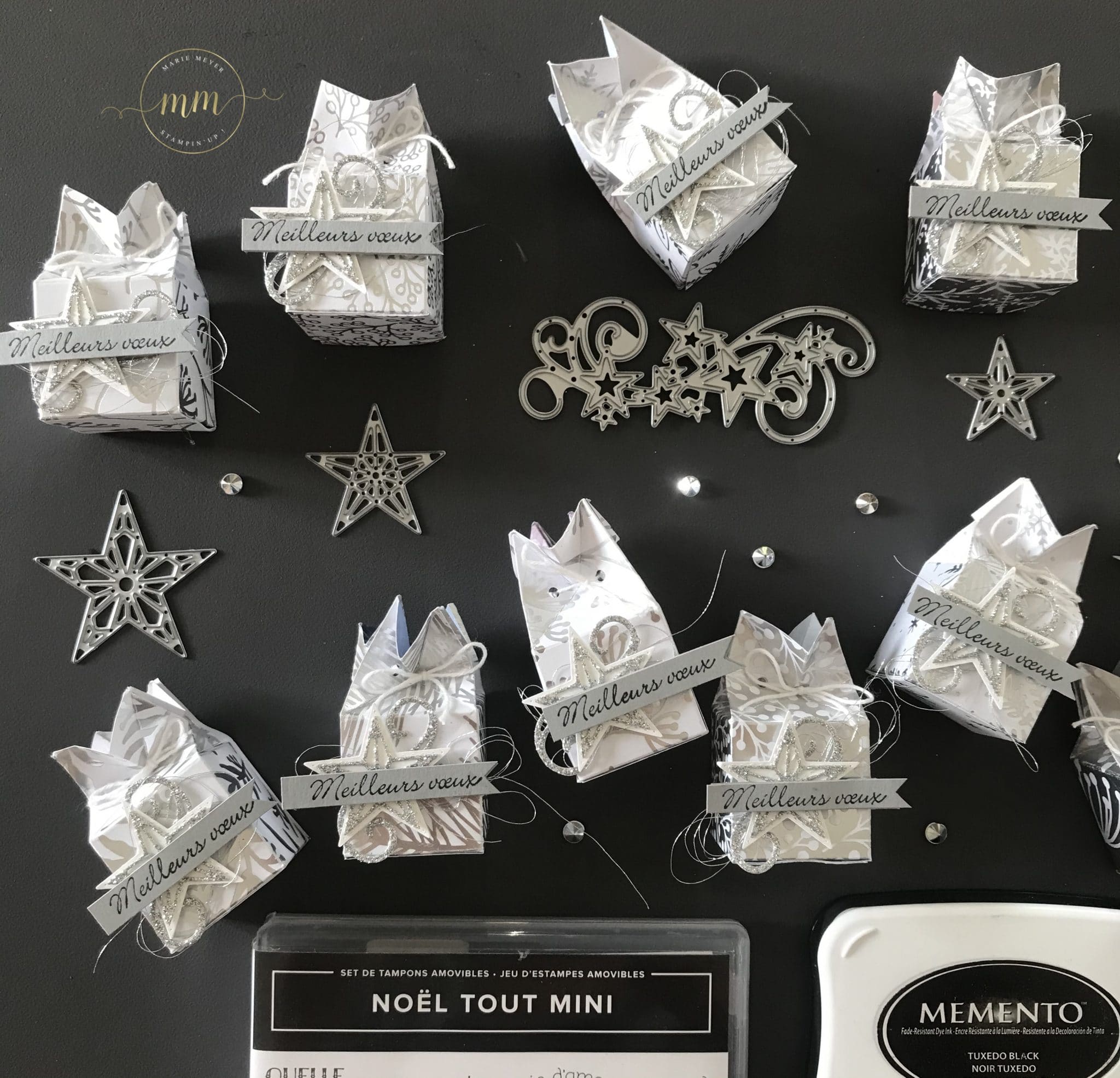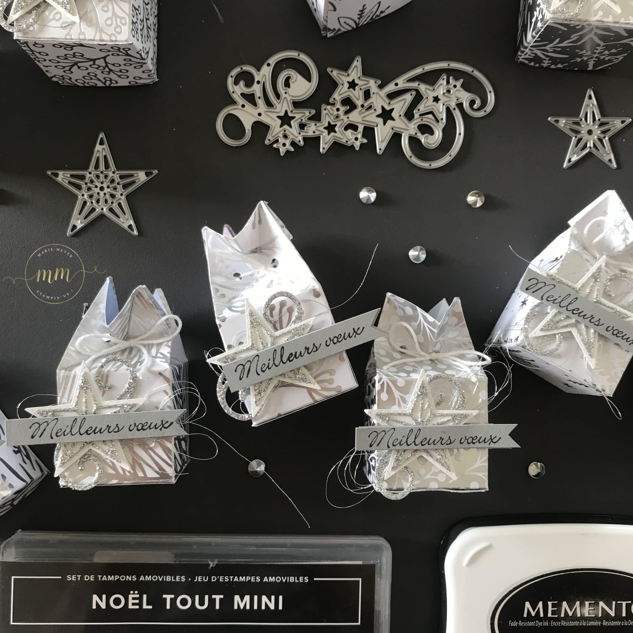 Ces Boites couronnes à Ferrero Rocher ont été réalisées avec le superbe Papier de la Série Design Spécialité Manteau de Givre, du Papier argenté, le Set de tampons Noël tout mini, le Set de tampons Tant d’Etoiles et ses Poinçons Etoiles à coudre et de l’encre Mémento.