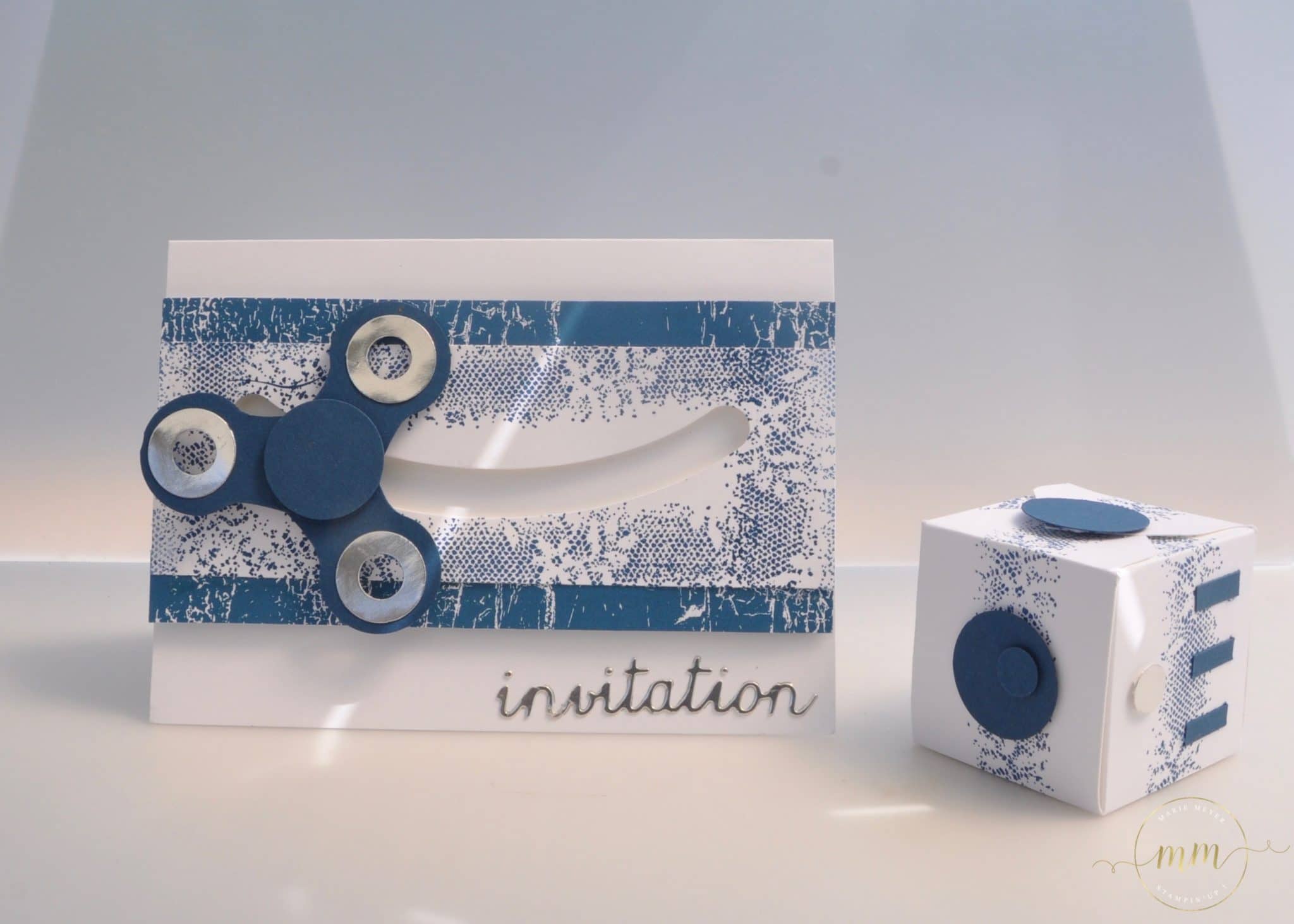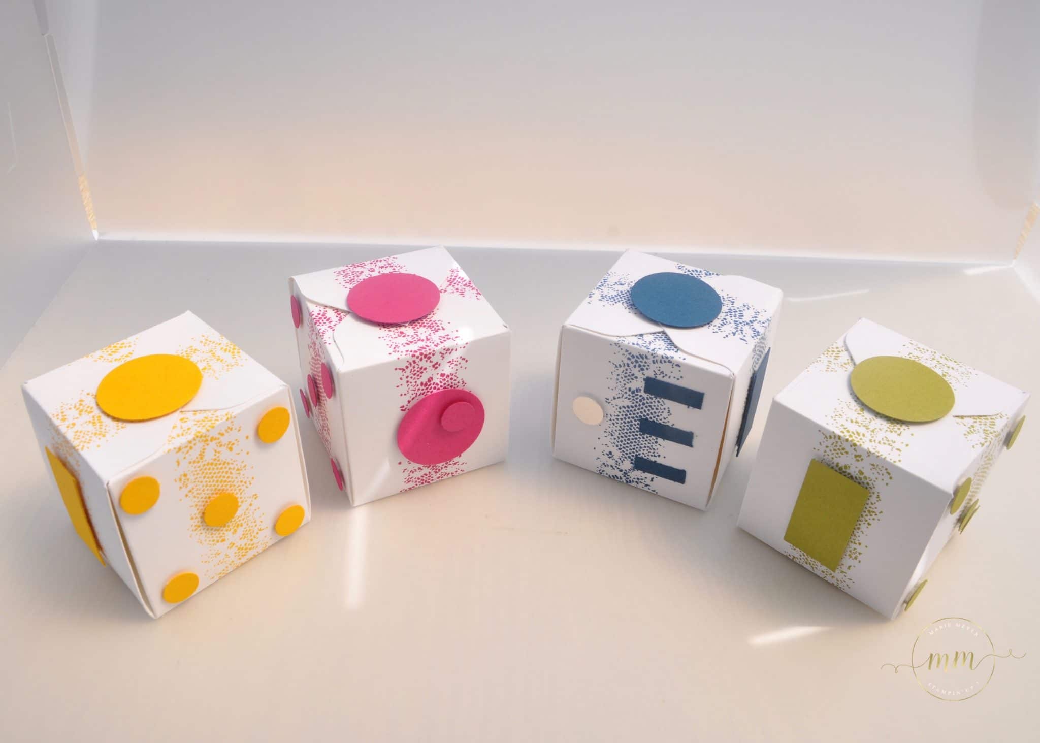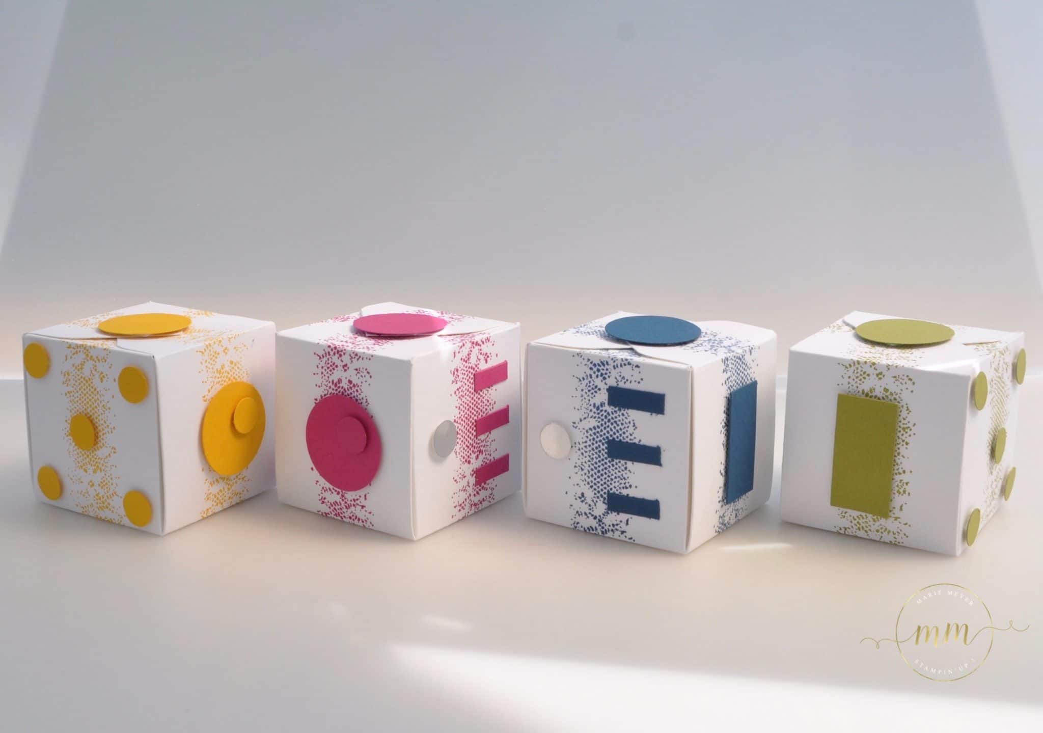 Donc voici mes boîtes fidget cube (version scrap tout en papier) décorées avec le set de tampons Touches of texture dans des teintes cari moulu, explosion de baies, denim dandy et vert olive :