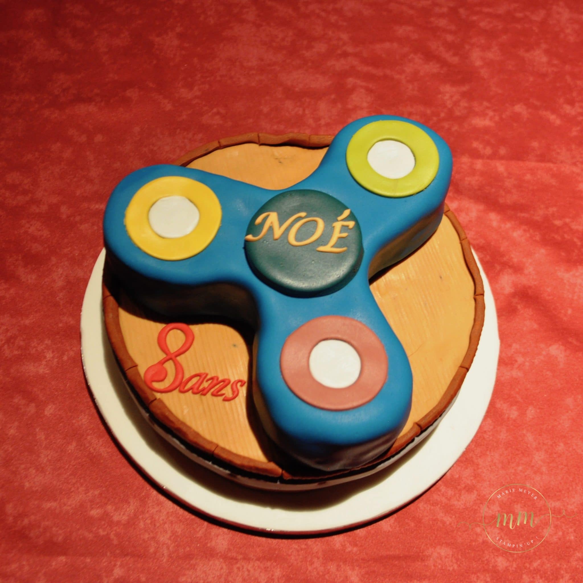Enfin, la fête n’aurait pas été à son comble, si le gâteau n’avait pas été à la hauteur de mes projets en scrap. Pour se faire, j’ai fait appel à un pâtissier, il s’agit des Milles Folies de Papou, qui a accepté le défi ! Je vous invite à visiter son blog ou sa page facebook ! Il fait des gâteaux absolument délicieux et « à tomber ». Il a réalisé tout spécialement pour Noé, son tout premier gâteau hand spinner !
