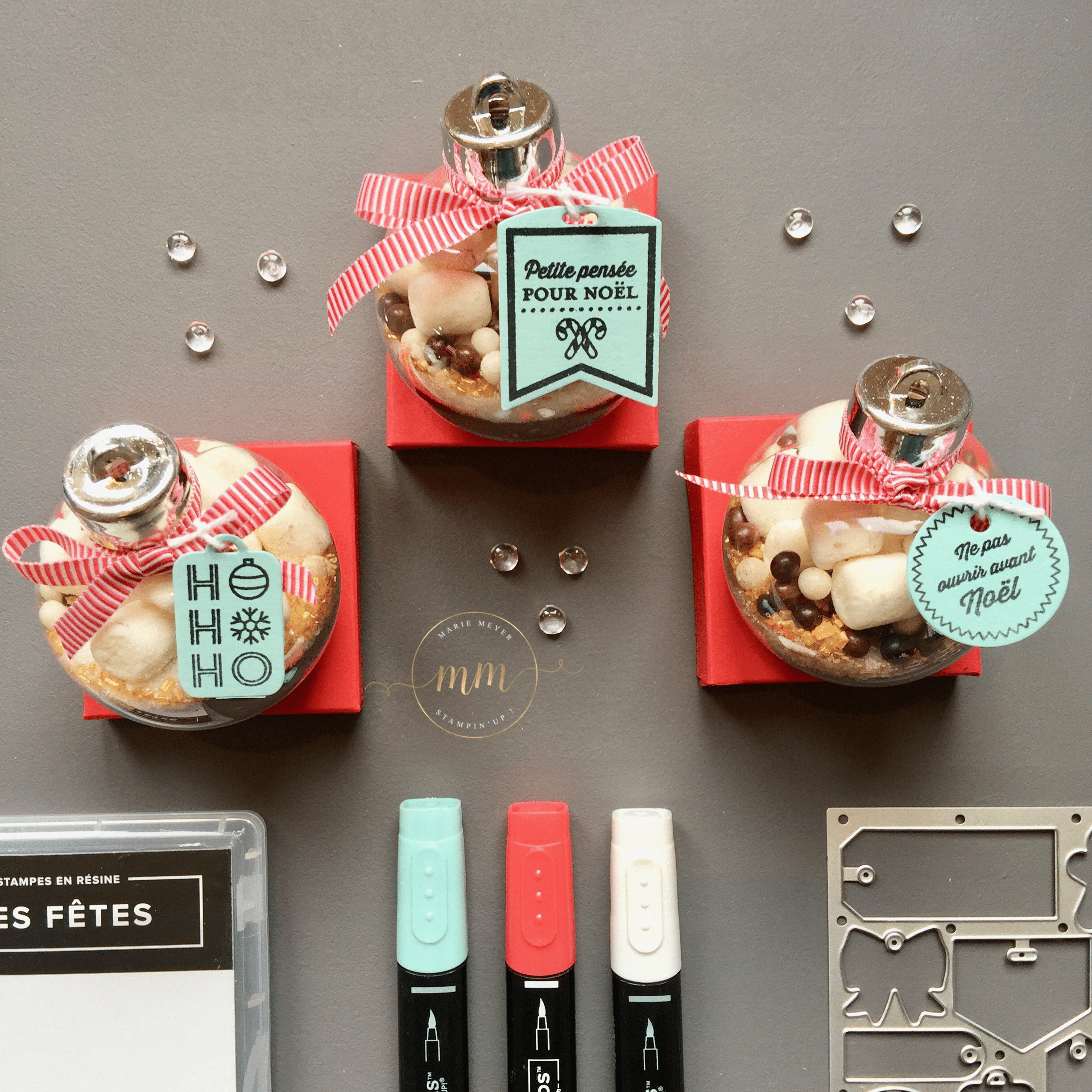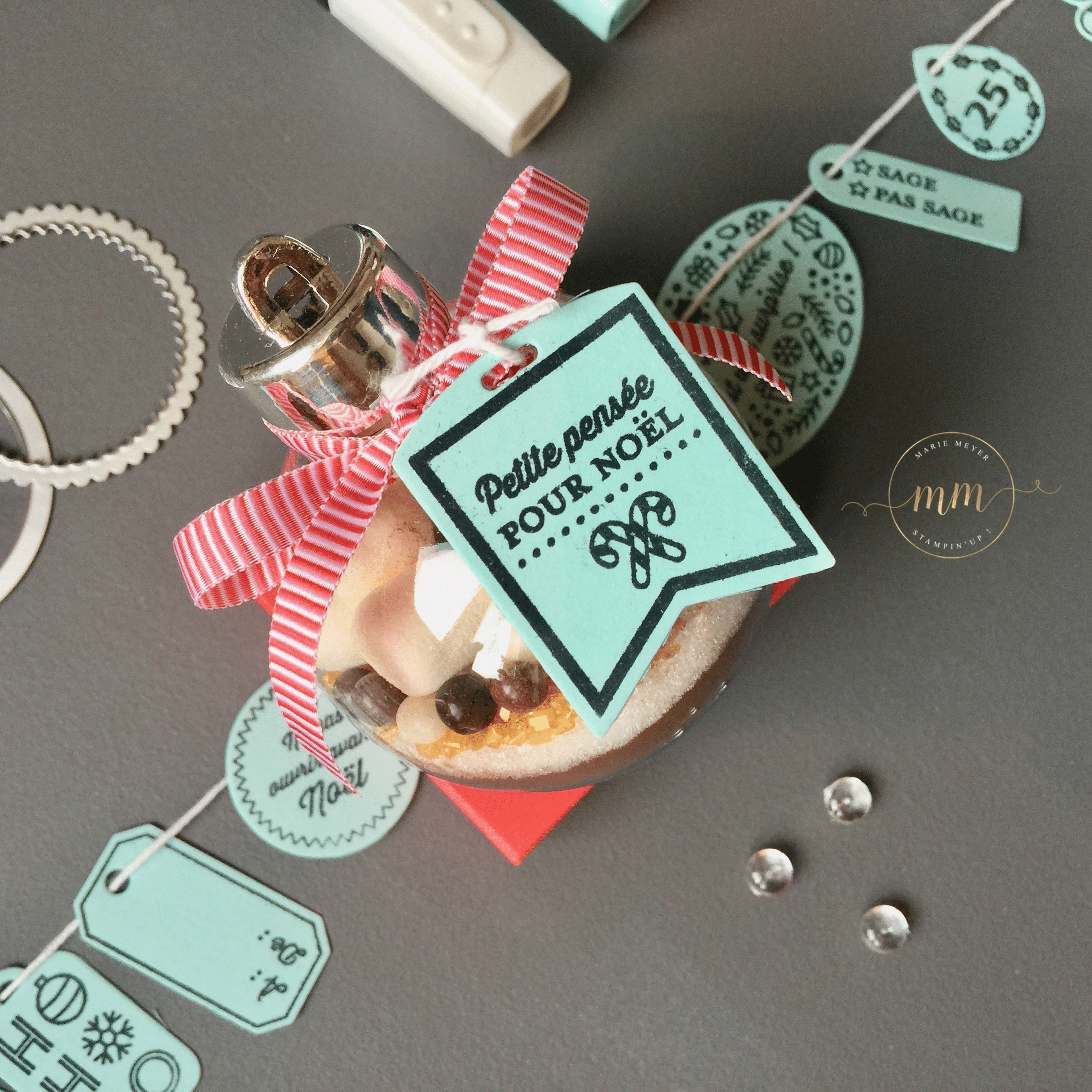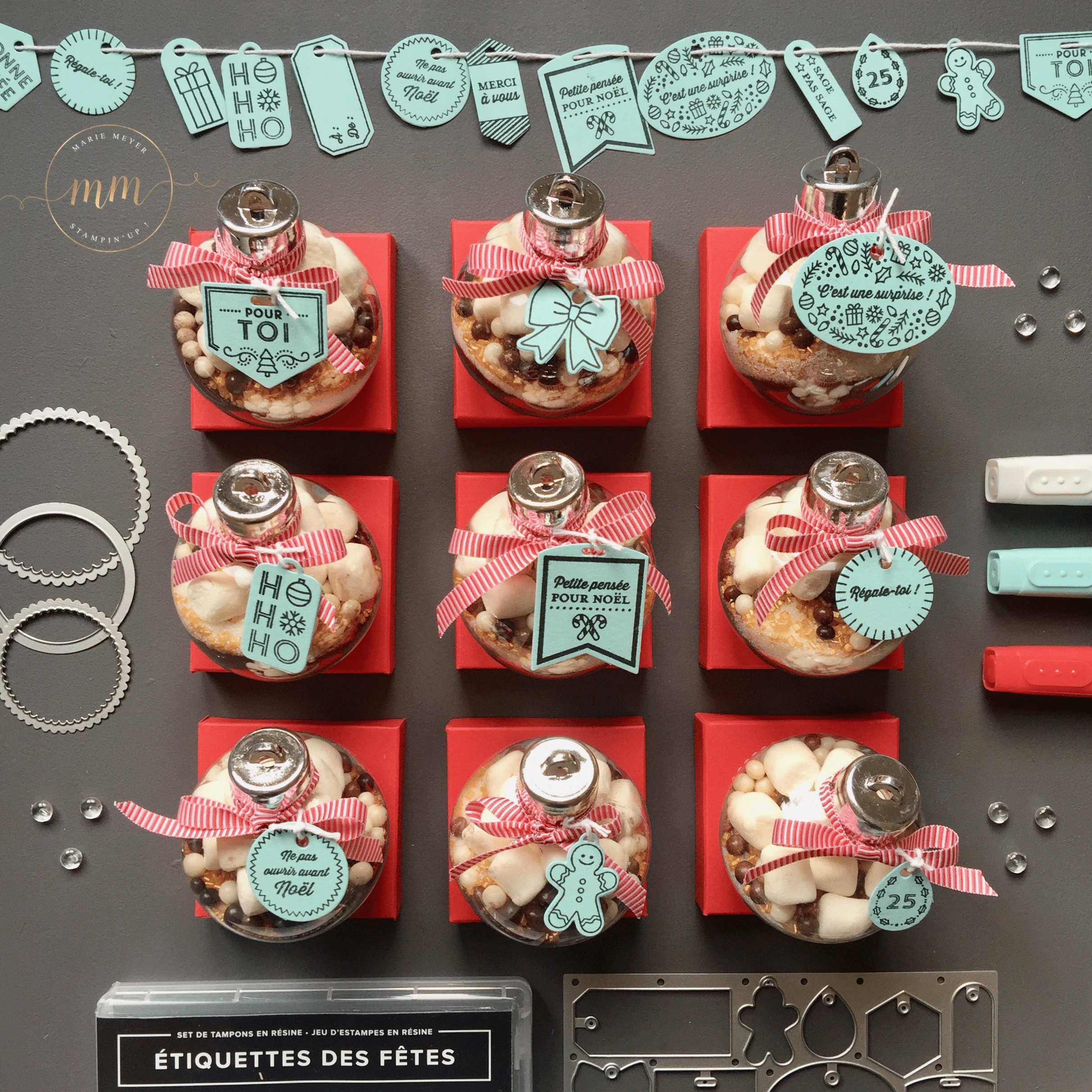 Pour se faire, j’ai acheté sur le commerce, C… j’adoreeeee (pour ne pas le cité), des boules en plastique de 6 cm de diamètre et j’ai utilisé la recette du chocolat chaud de chez Au pays de Candice. Pour la partie scrapbooking, j’ai utilisé le set de tampon Etiquettes des fêtes avec son Thinlits Etiquettes de Noël dans des teintes Caliquot coquelicot et Piscine party.