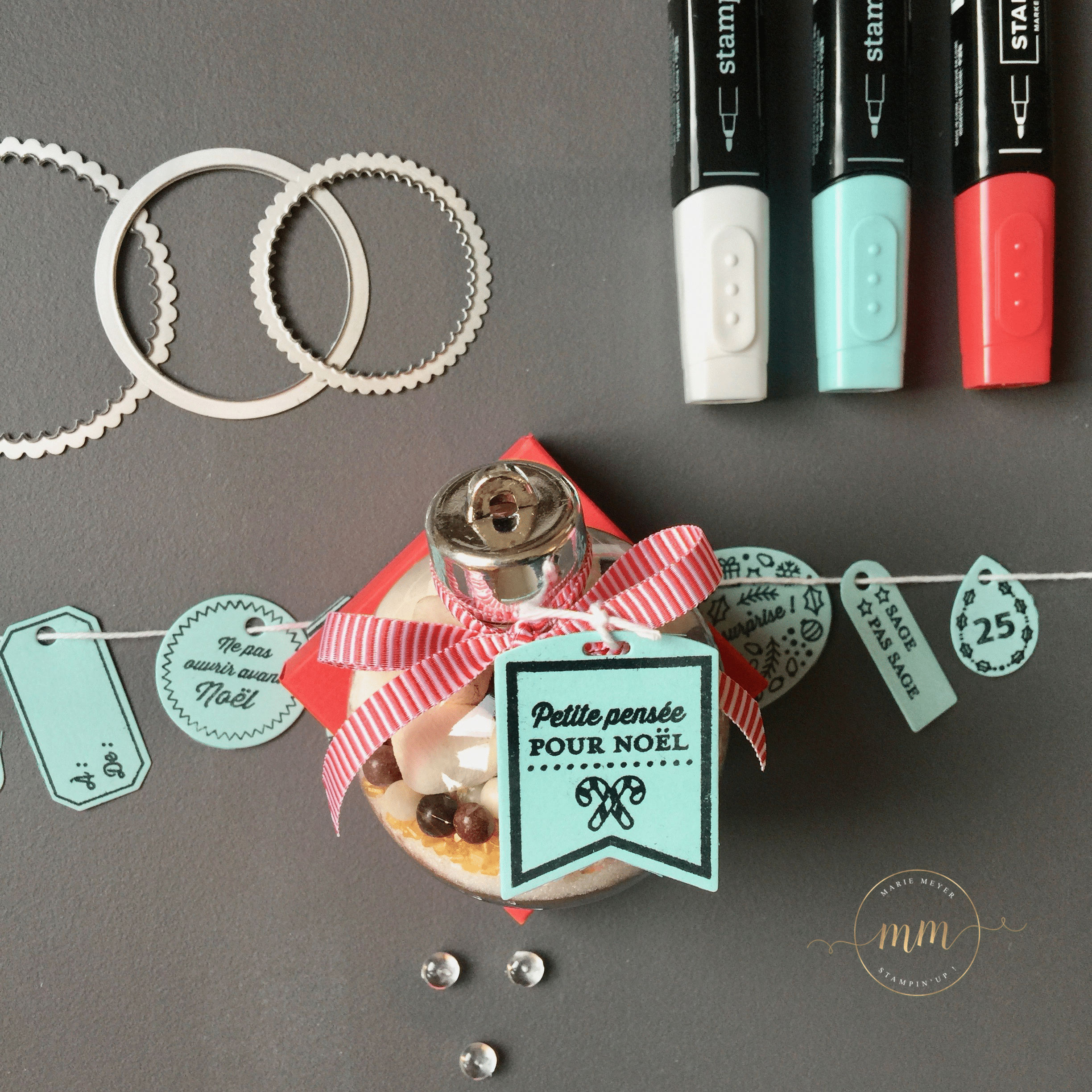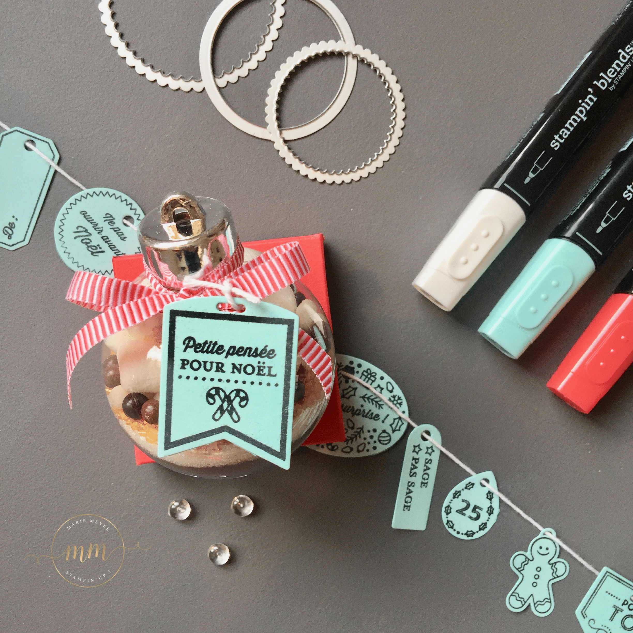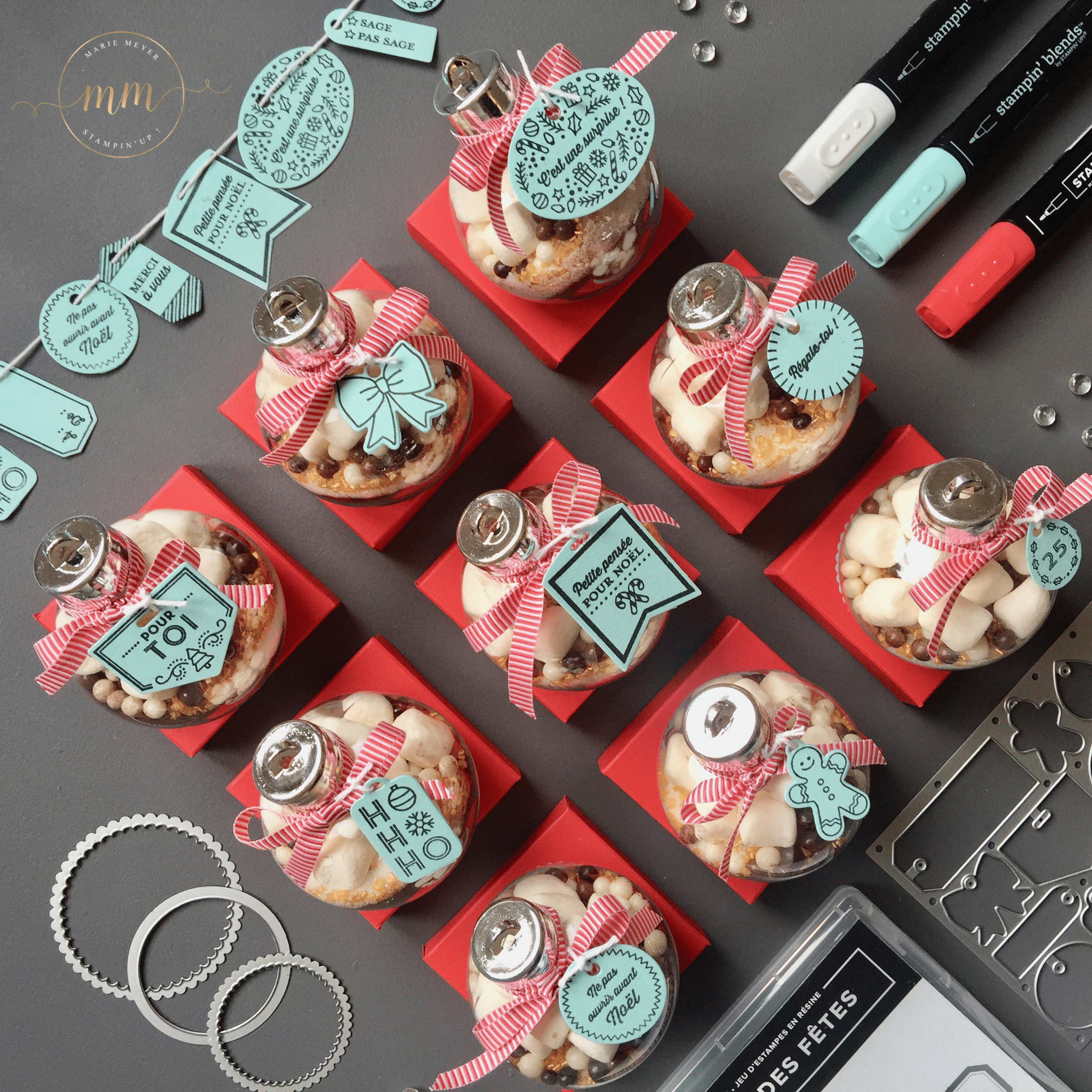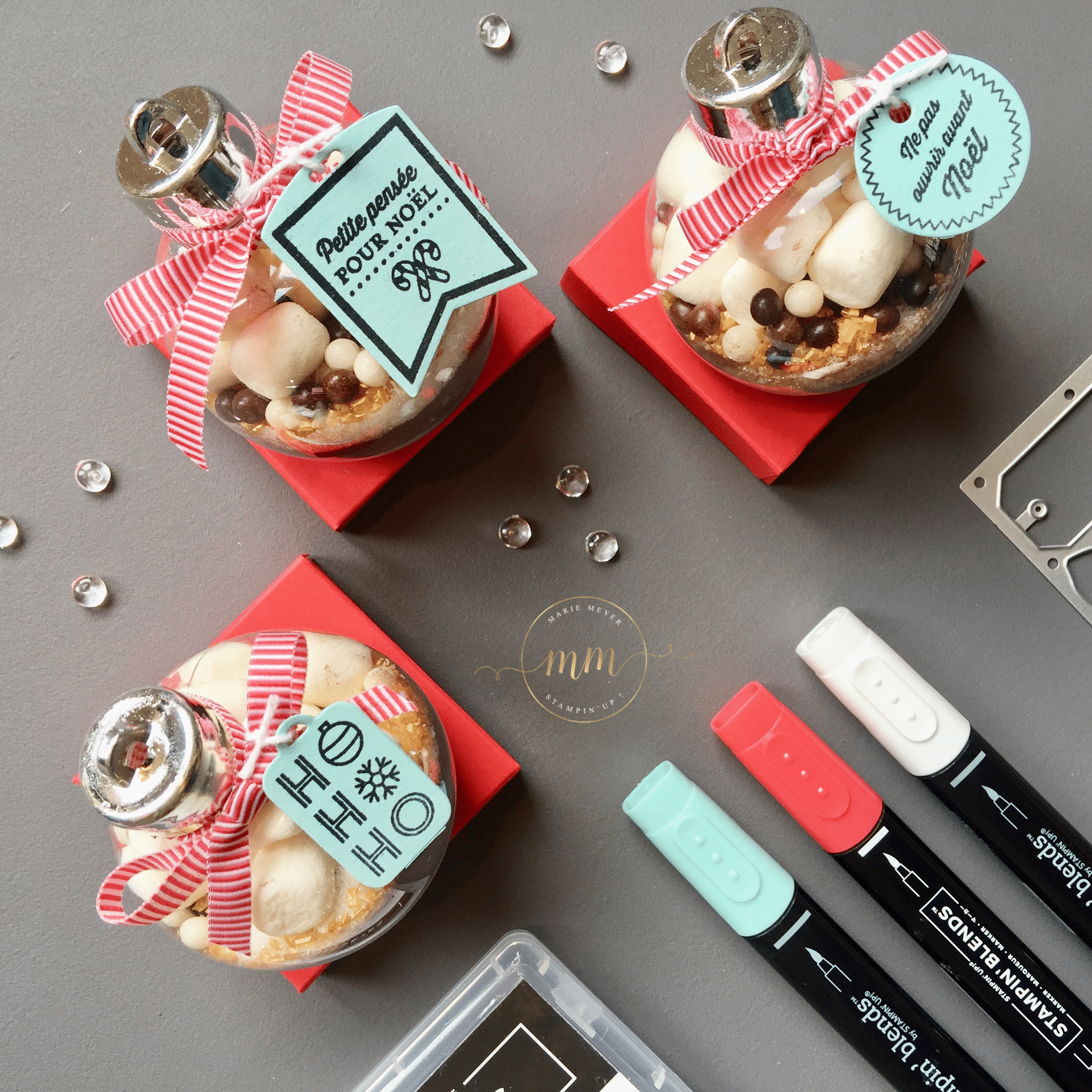 Pour se faire, j’ai acheté sur le commerce, C… j’adoreeeee (pour ne pas le cité), des boules en plastique de 6 cm de diamètre et j’ai utilisé la recette du chocolat chaud de chez Au pays de Candice. Pour la partie scrapbooking, j’ai utilisé le set de tampon Etiquettes des fêtes avec son Thinlits Etiquettes de Noël dans des teintes Caliquot coquelicot et Piscine party.
