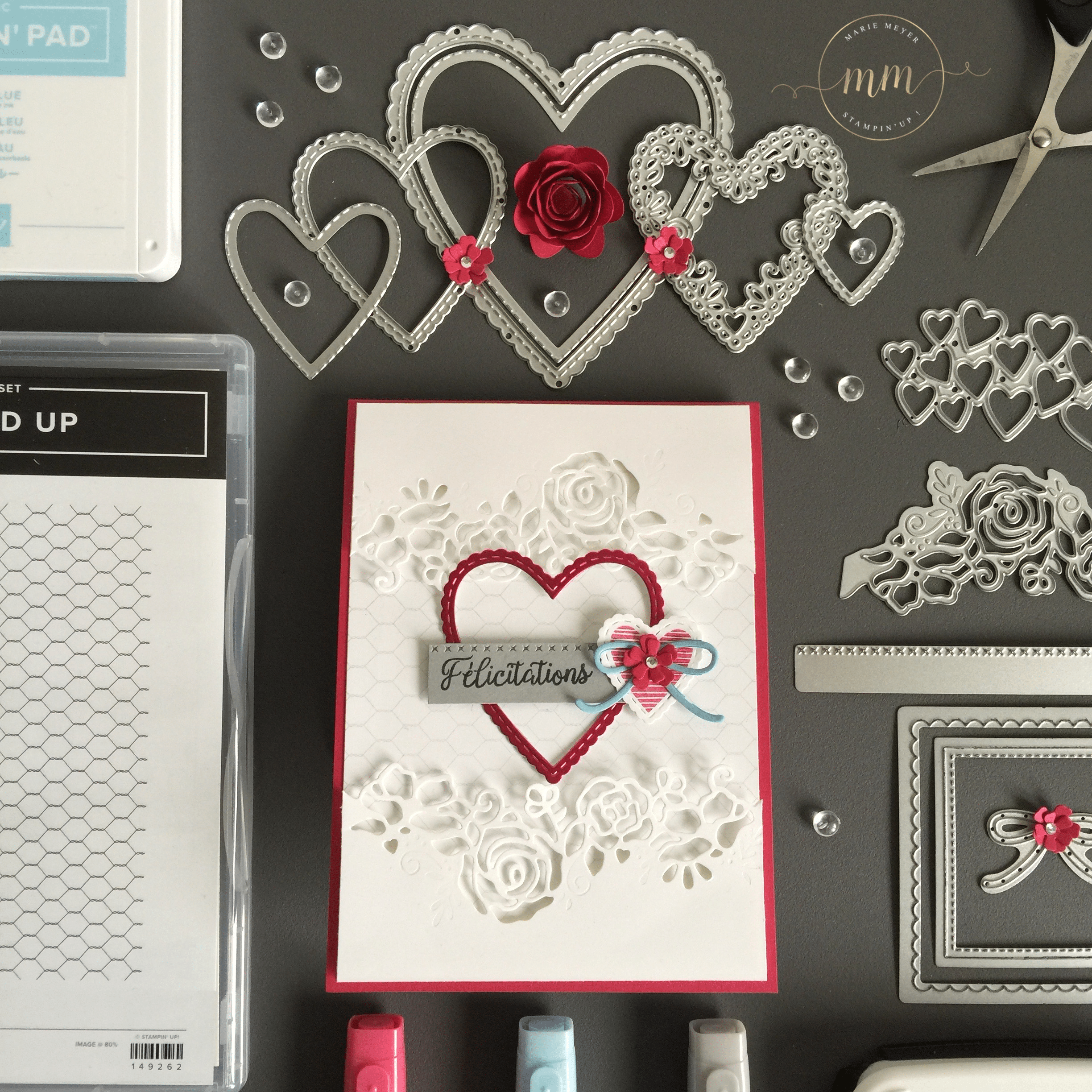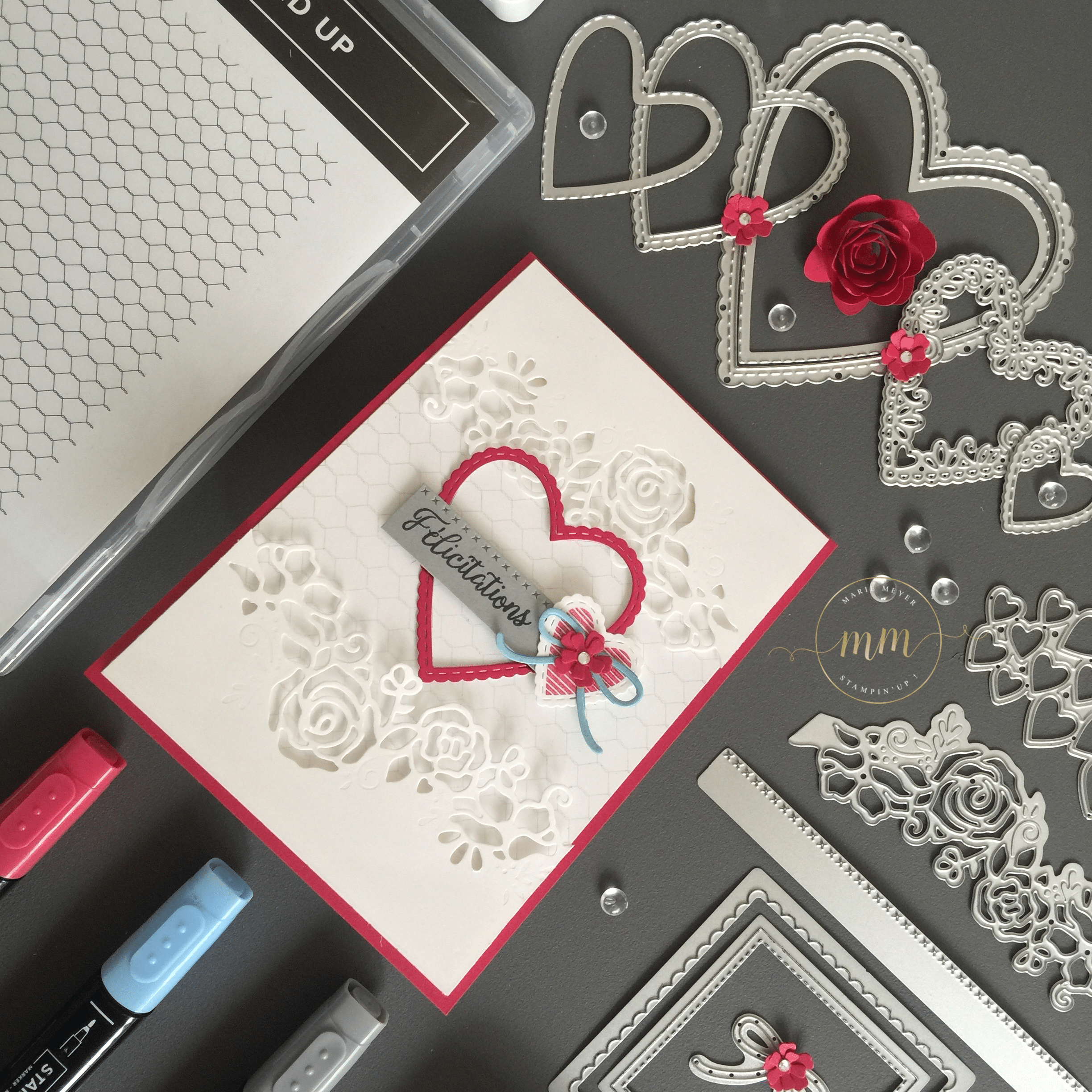 Pour cette carte, j’ai choisi les couleurs Murmure blanc, Lèvres vermeilles, Béguin bleu et Ardoise bourgeoise. Côtés tamponnages, j’ai utilisé le Set de tampons Ravissant bouquet, le Set de tampons C’était écrit ainsi que le Set de tampon de fond All Wired up. Et enfin, j’ai usé des découpes provenant des Framelits Pyramide de carrés, Framelits Formes à coudre, Framelits Couture Offre-moi ton coeur, Framelits Etiquettes à coudre, Edgelits Fleurs charmantes et des anciens Thinlits Mini sac à sucreries.