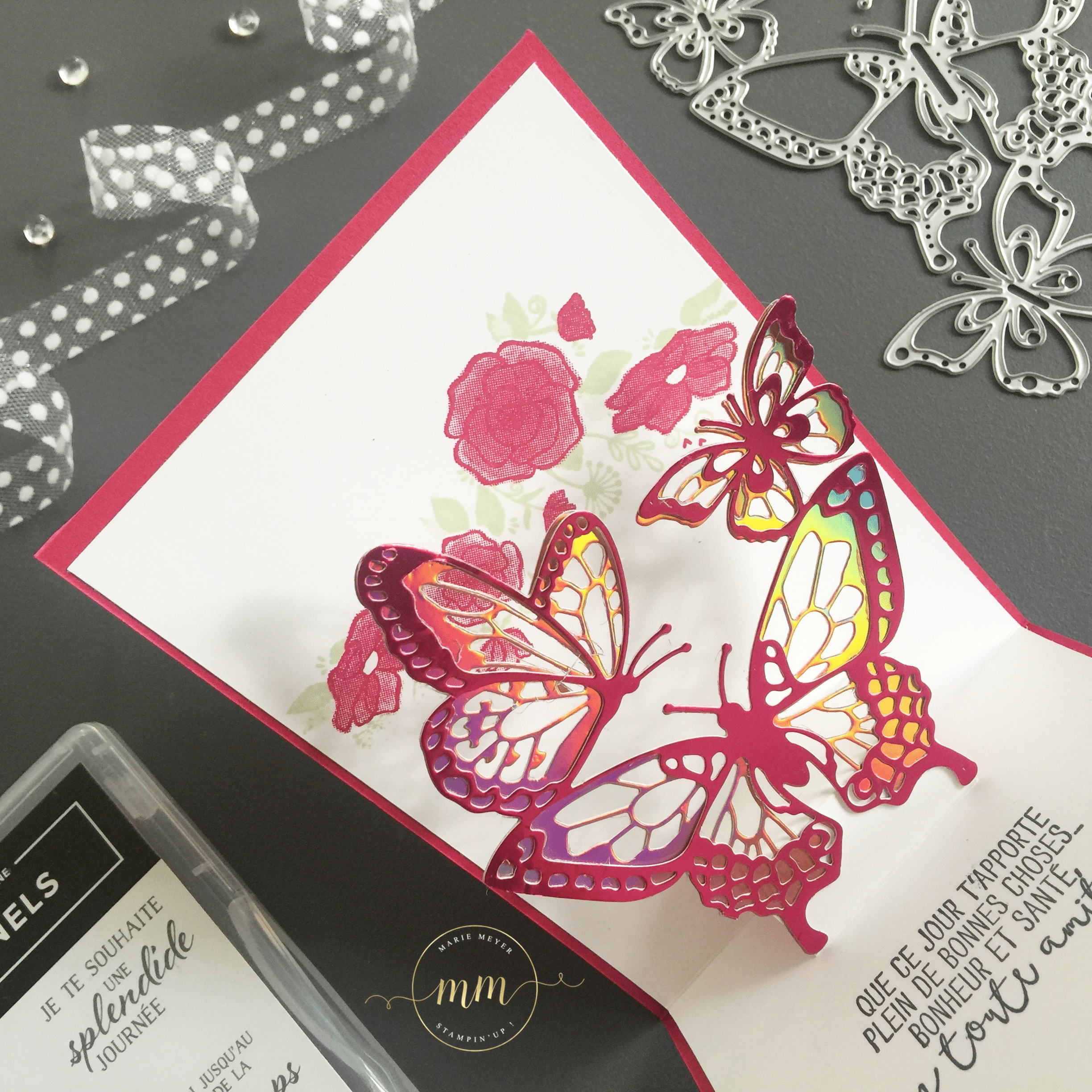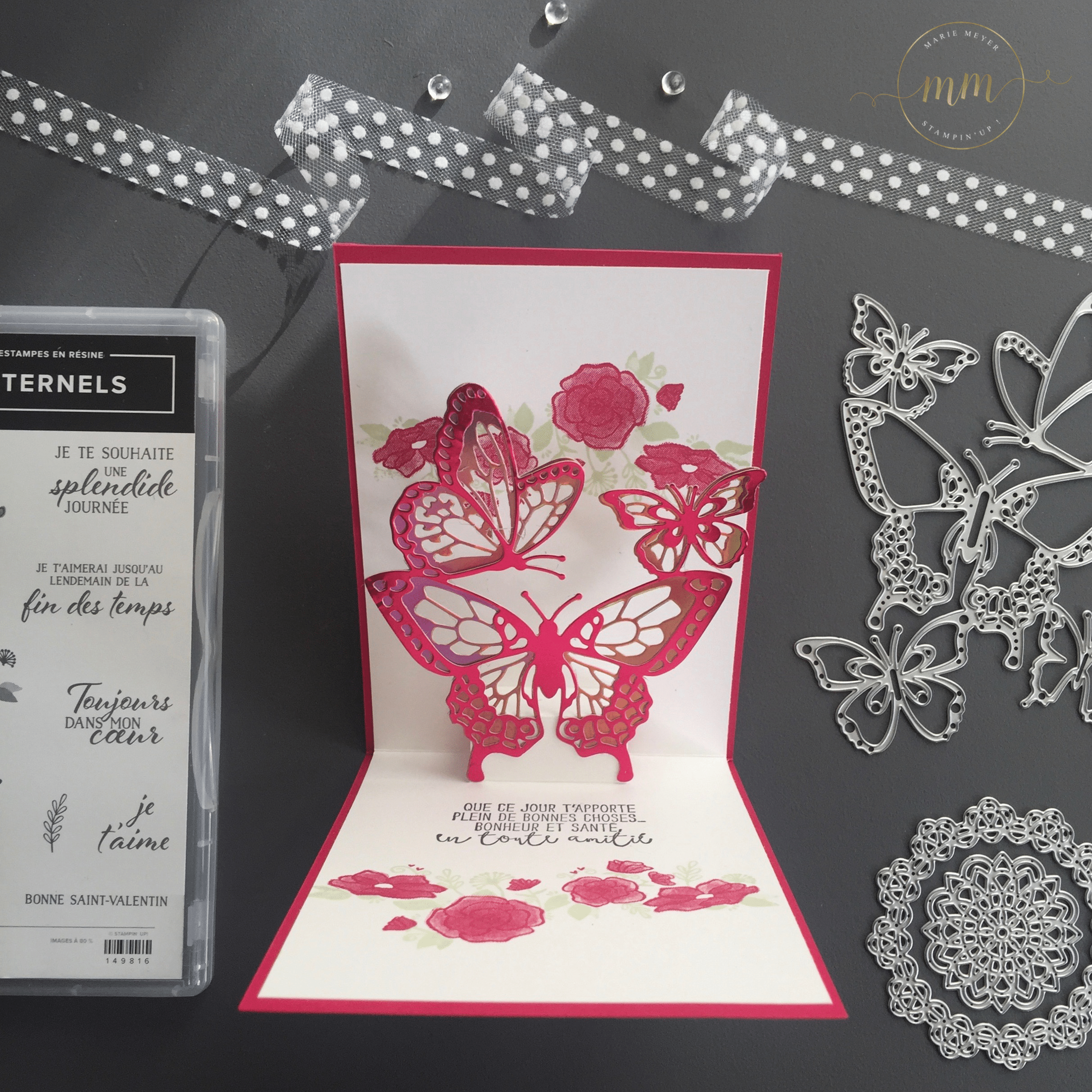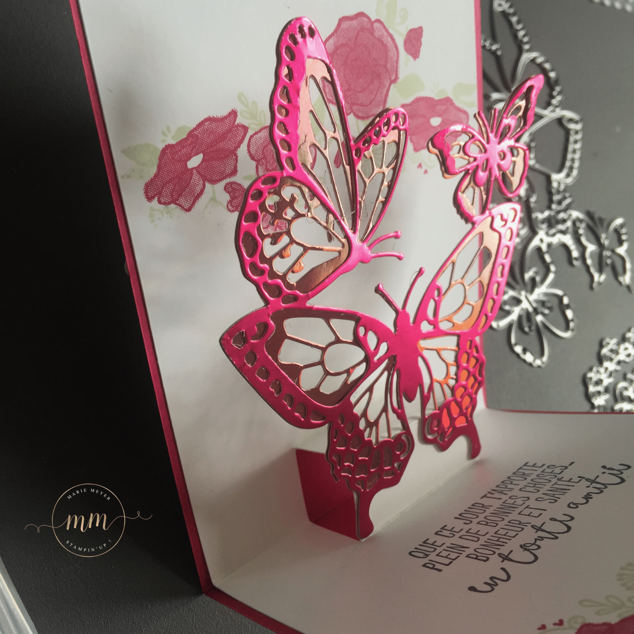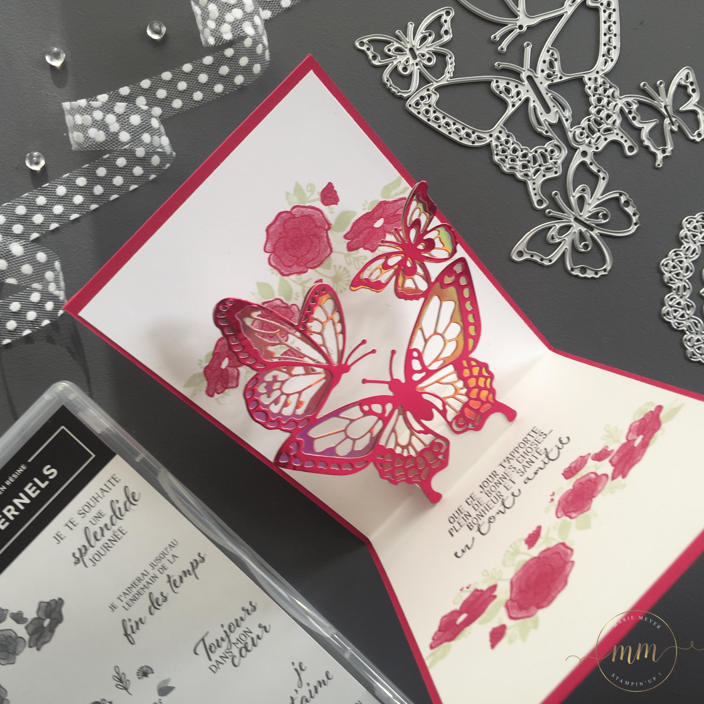 A l’intérieur de la carte, vous découvrez notre magnifique Thinlits Beaux papillons mis en relief par l’effet pop up.