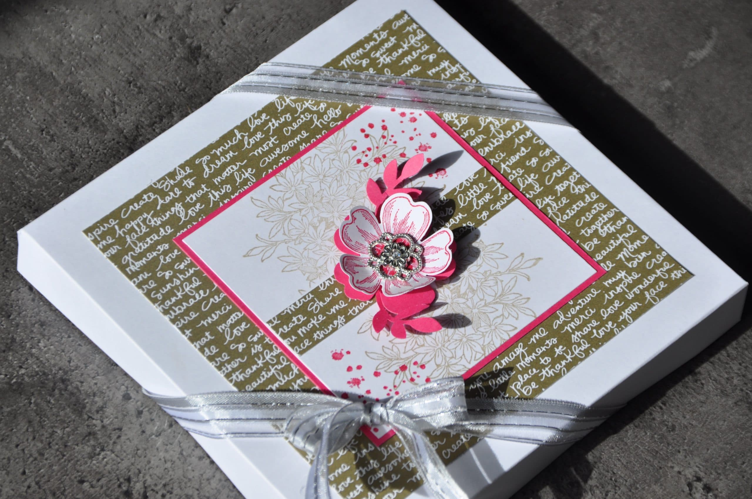 Il s’agit d’une carte d’anniversaire dans un écrin dans des teintes or et melon mambo. J’ai adoré faire ce projet, dont j’ai trouvé le pas à pas du couvercle chez Julie Kettelwell, et la carte chez The Craft Spa. En effet, le papier que j’ai utilisé est absolument magnifique et provient du bloc de papier de la série design Neutre. Il a la particularité d’avoir de l’encre métallisée dans les feuilles or et argent. Dans notre catalogue le rendu n’est malheureusement pas visuel, mais je vous promets que cette série est simplement superbe !