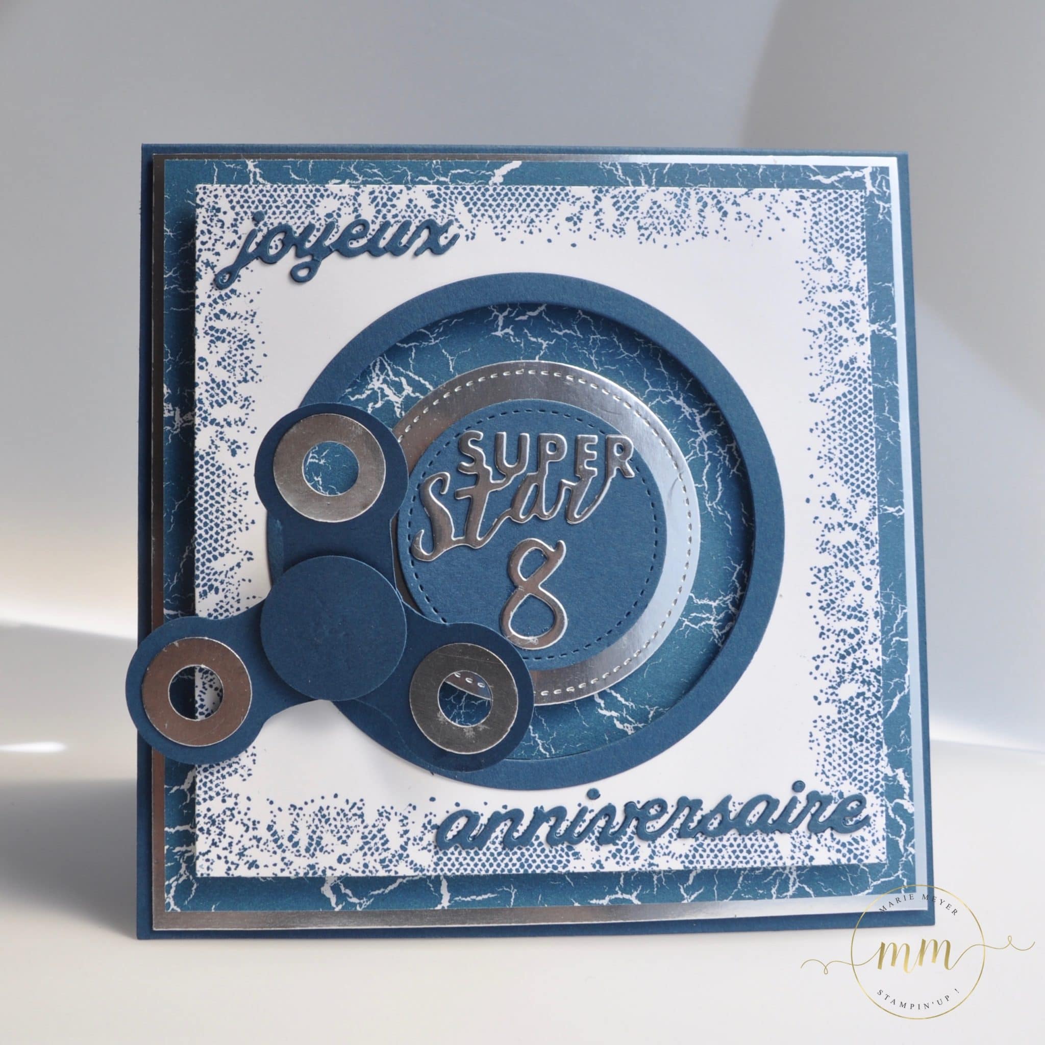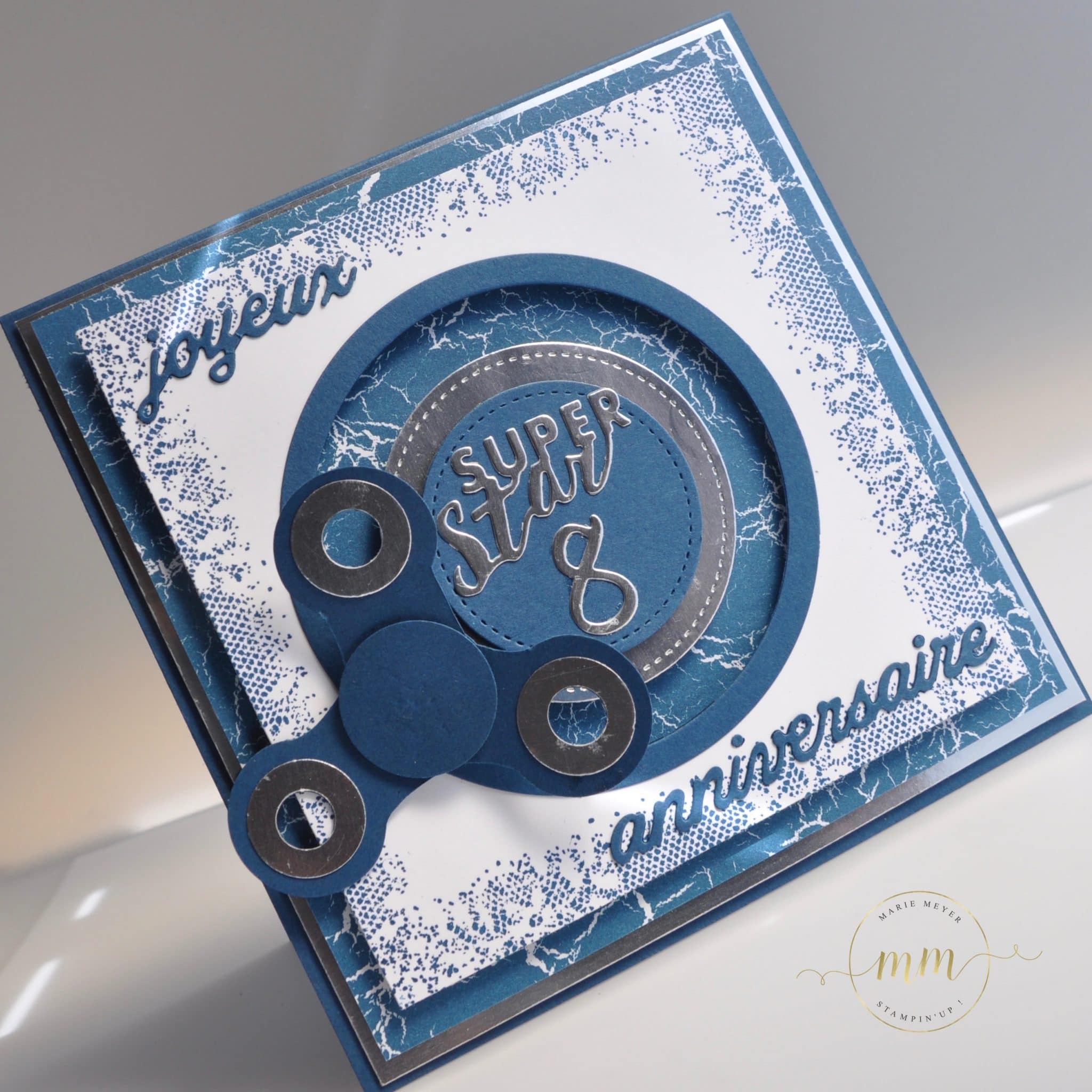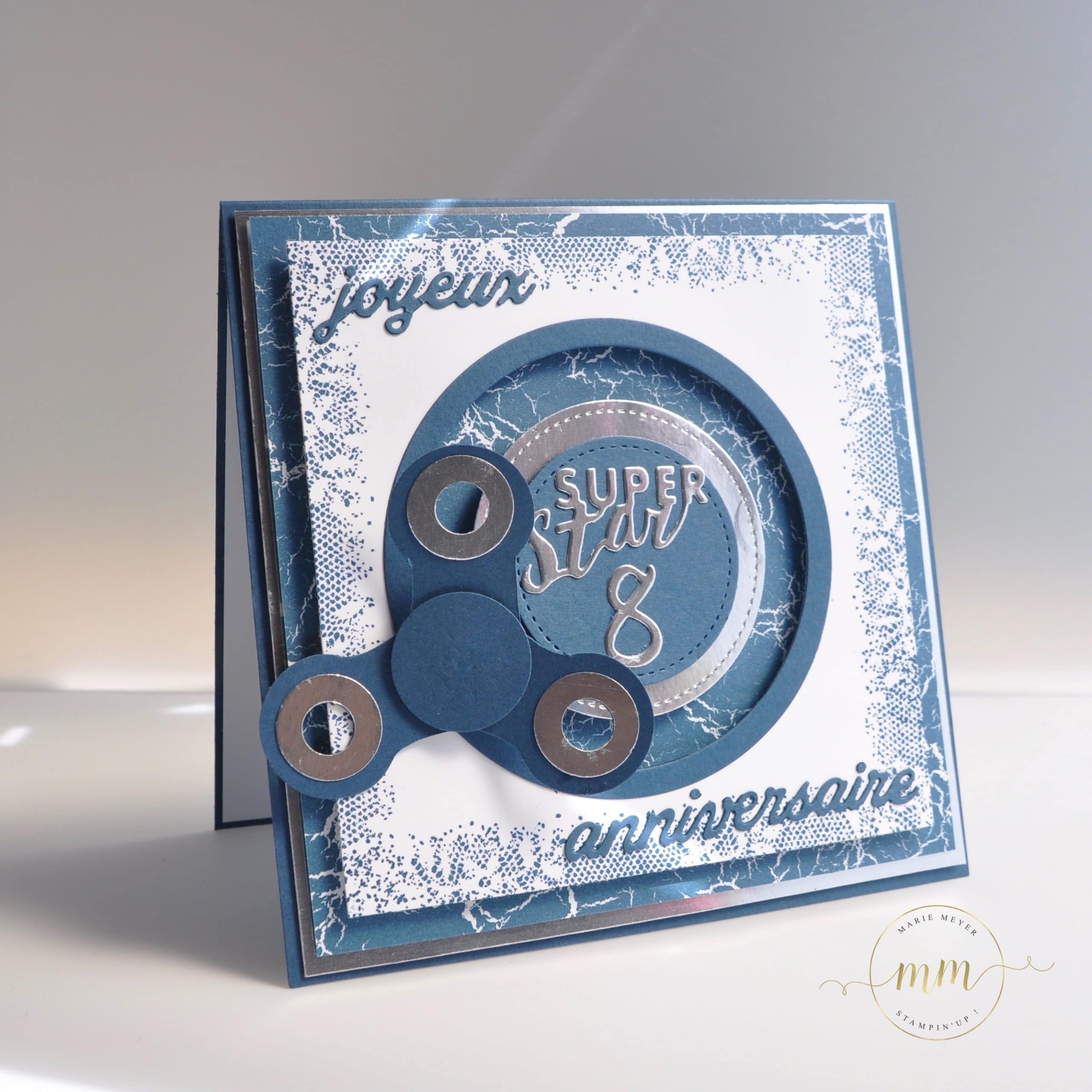 Revenons donc sur la carte d’anniversaire Hand Spinner que je lui ai offerte. Comme pour les cartes d’invitations, j’ai utilisé le magnifique papier design de la série Théorie de Couleur ainsi que le set de tampons Touches of texture dans des teintes denim dandy et argent.