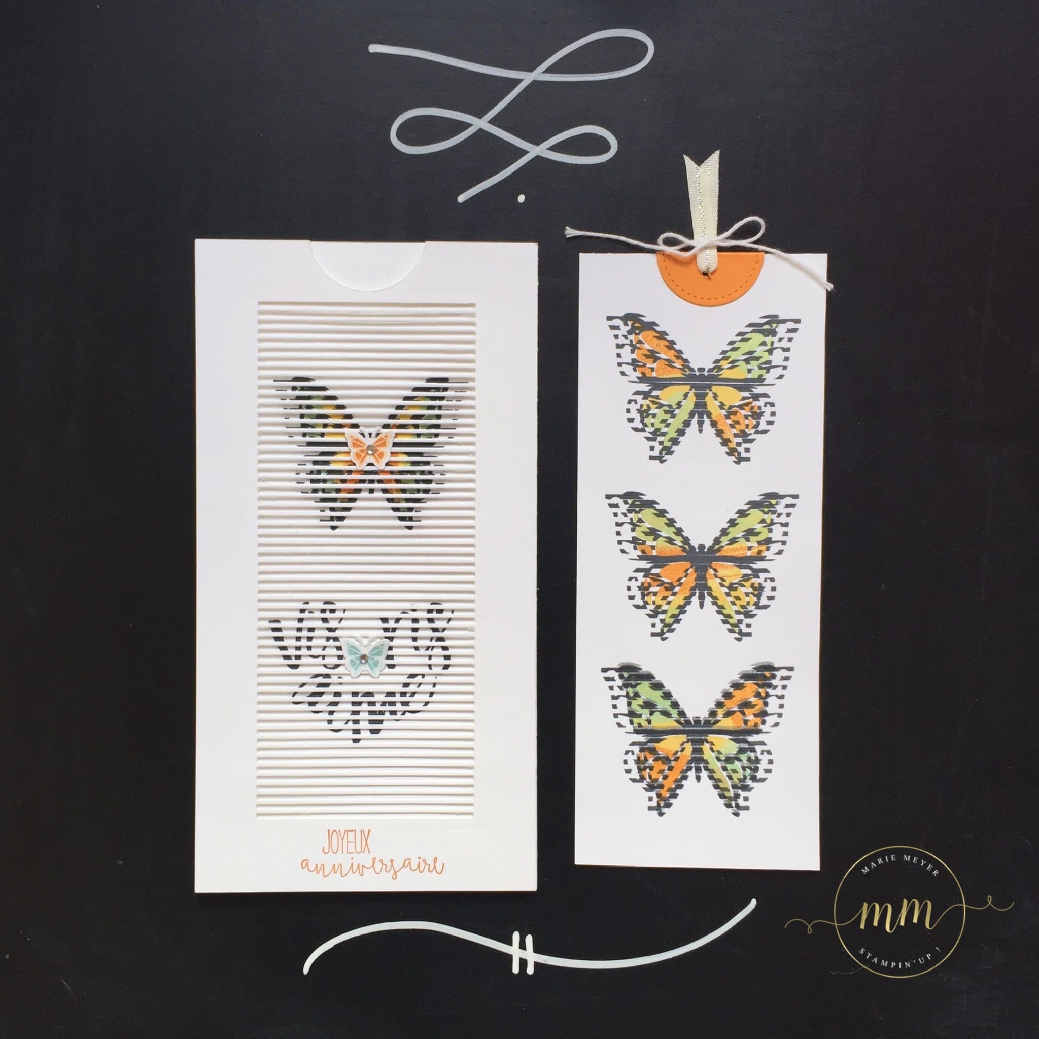 Pour colorier mes papillons j’ai utilisé la technique du rock and roll dans des teintes cari moulu, tarte au potiron et piscine party. J’ai également utilisé deux sets de tampons que j’adore, le set de tampons Bonne couche d’amour et Célébrations spéciales.