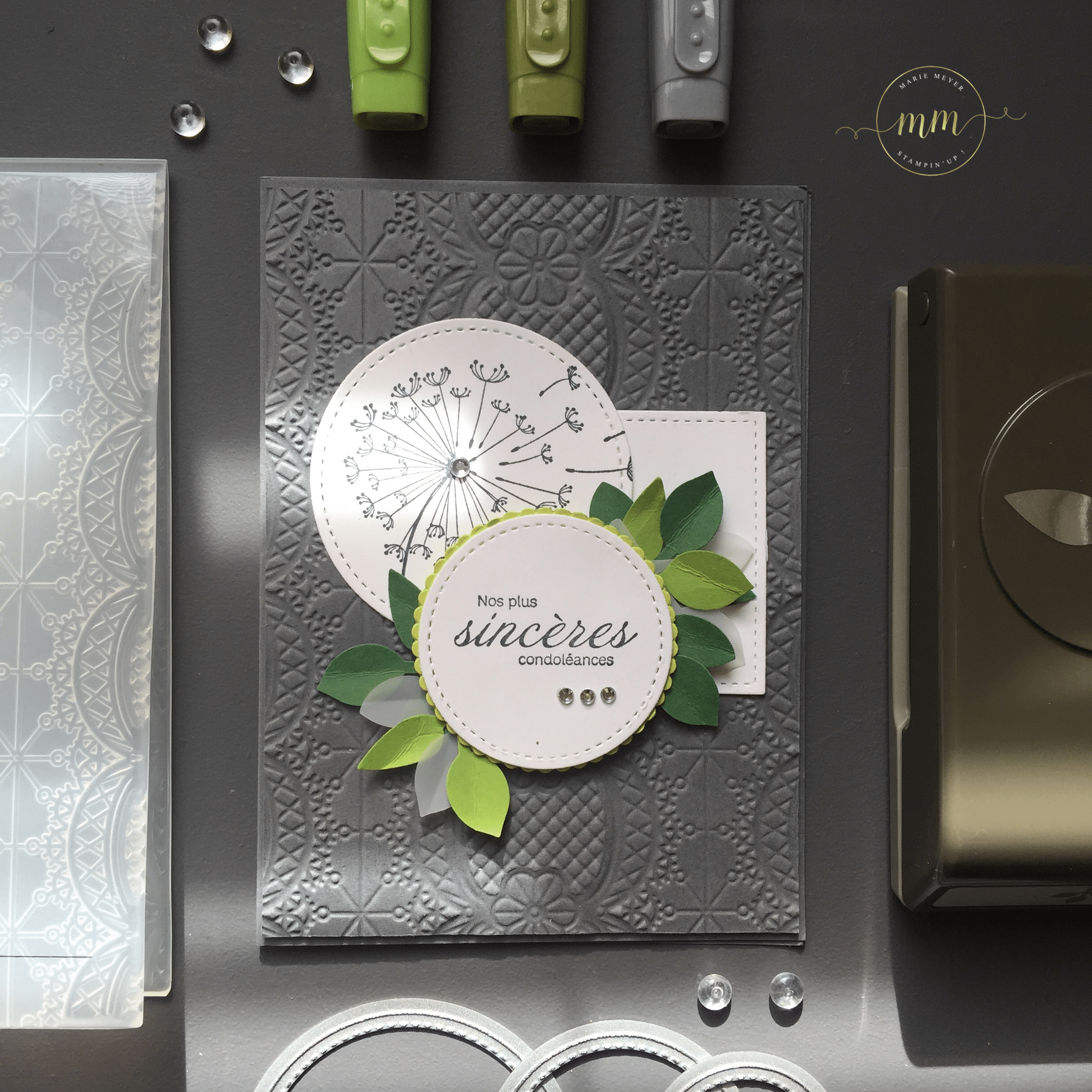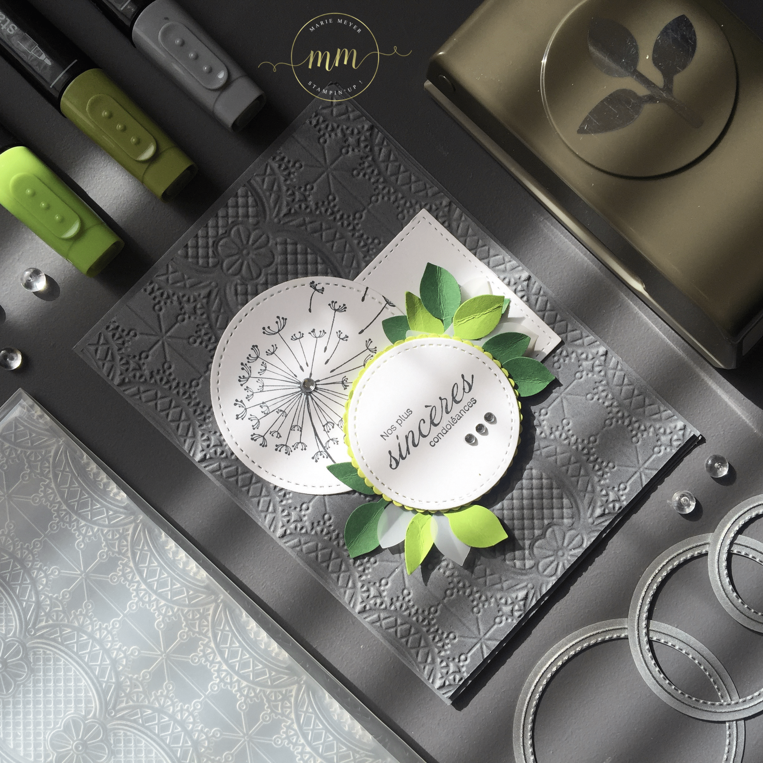 Pour réaliser cette carte, mon choix s’est porté sur le set de tampons Dandelion Wishes dont vous avez déjà pu découvrir des créations ici. Côté couleurs, je suis restée sobre en utilisant les teintes Gris souris, Limonade à la limette, Grenouille guillerette et Vert jardin. En arrière fond de ma carte, j’ai utilisé un plioir à gaufrage Dentelle issu de notre catalogue printemps été, qui, je trouve donne de la douceur à ma carte.