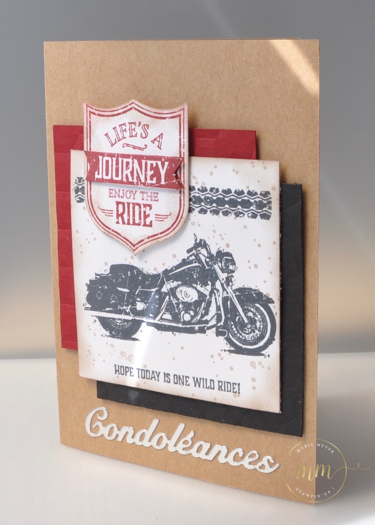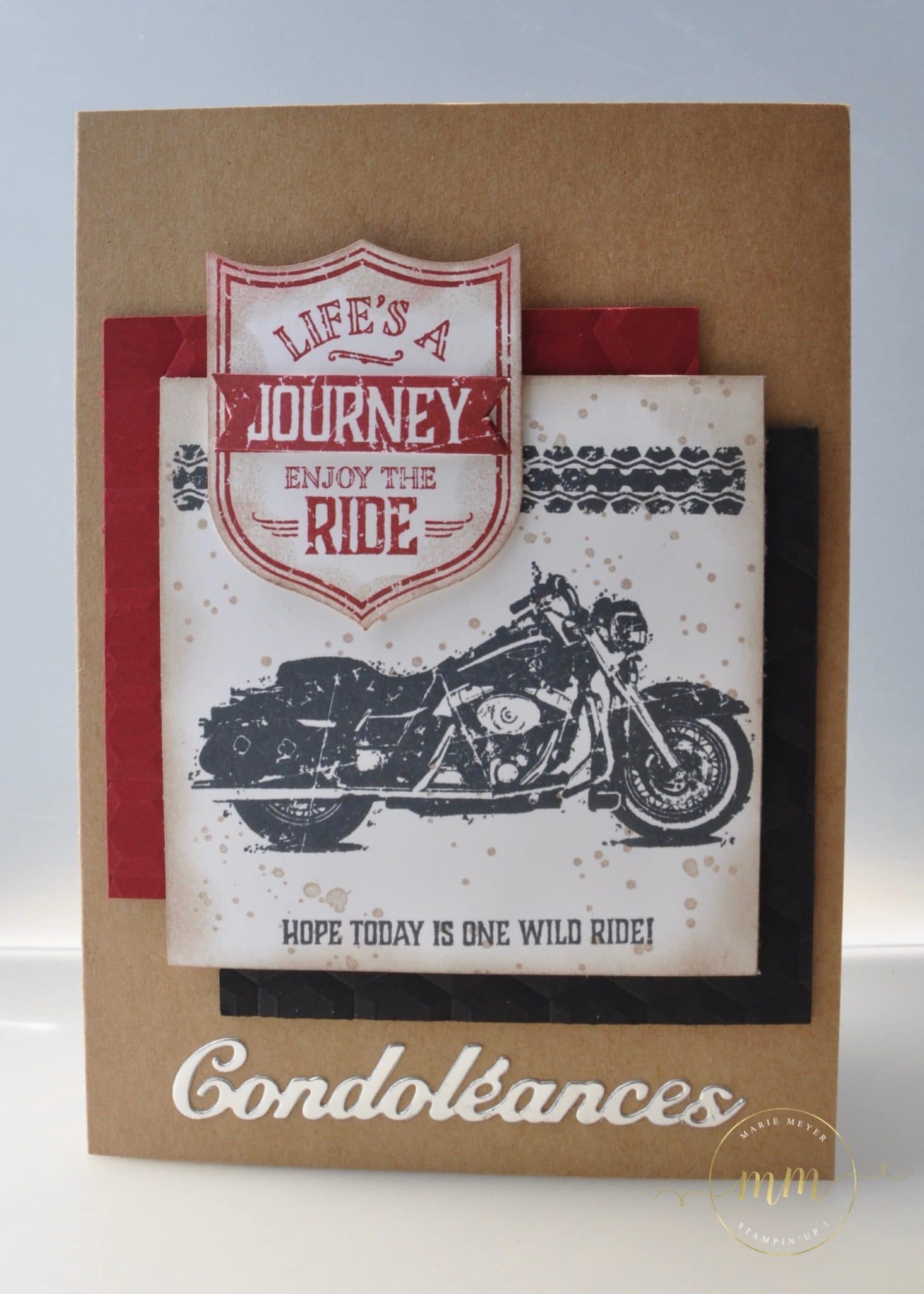 J’ai souhaité lui faire mes adieux à ma manière en créant une carte de condoléances, rien que pour lui, sur le thème de la moto puisque c’était l’une de ses passions. En général, je ne suis pas inspirée pour les cartes de condoléances, si bien que je vais les acheter sur le commerce… Voici donc la carte que j’ai déposé dans l’urne avant de rentrer dans l’église :