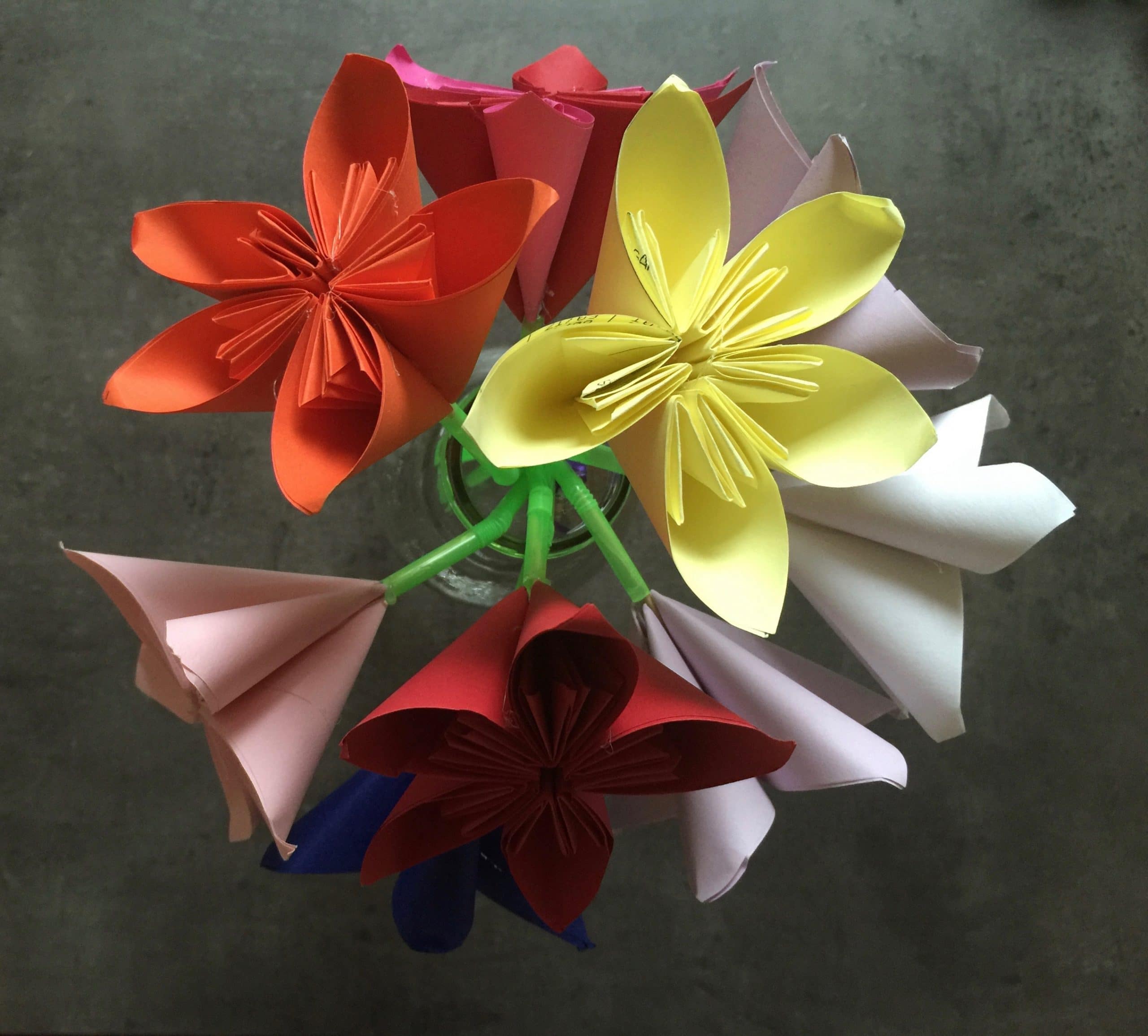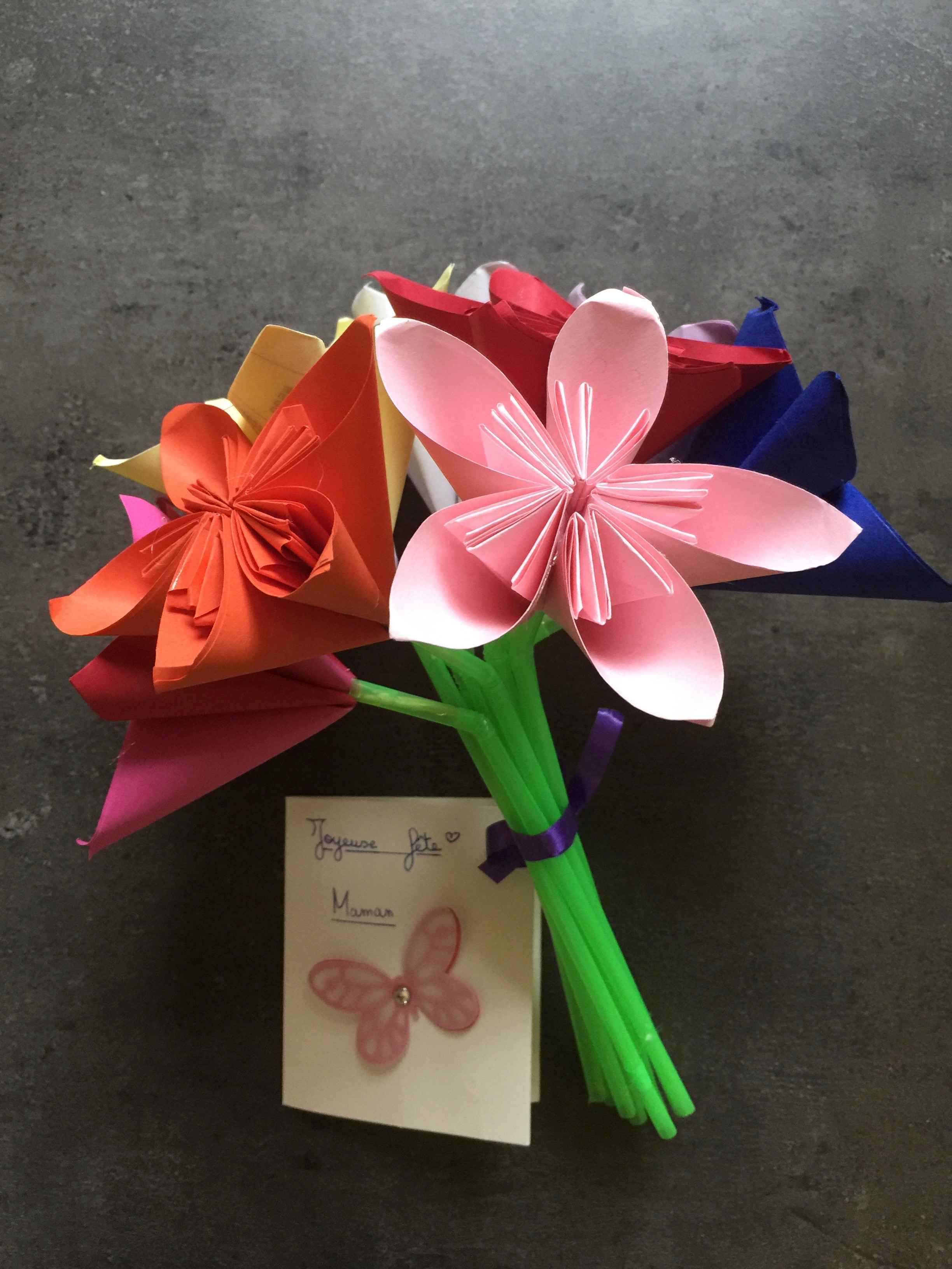 Ce jour était également le mien, puisque je suis maman de 2 enfants, qui m’ont gâtés comme une reine ! Tout d’abord de la part d’Alice, un très joli bouquet de fleurs en origami accompagnée d’une carte (remarquez elle est allée, en douce dans ma scraproom, me piquer le papillon, la chipie !!!!). Il n’a pas d’odeur, mais à l’avantage de ne jamais faner ;-).