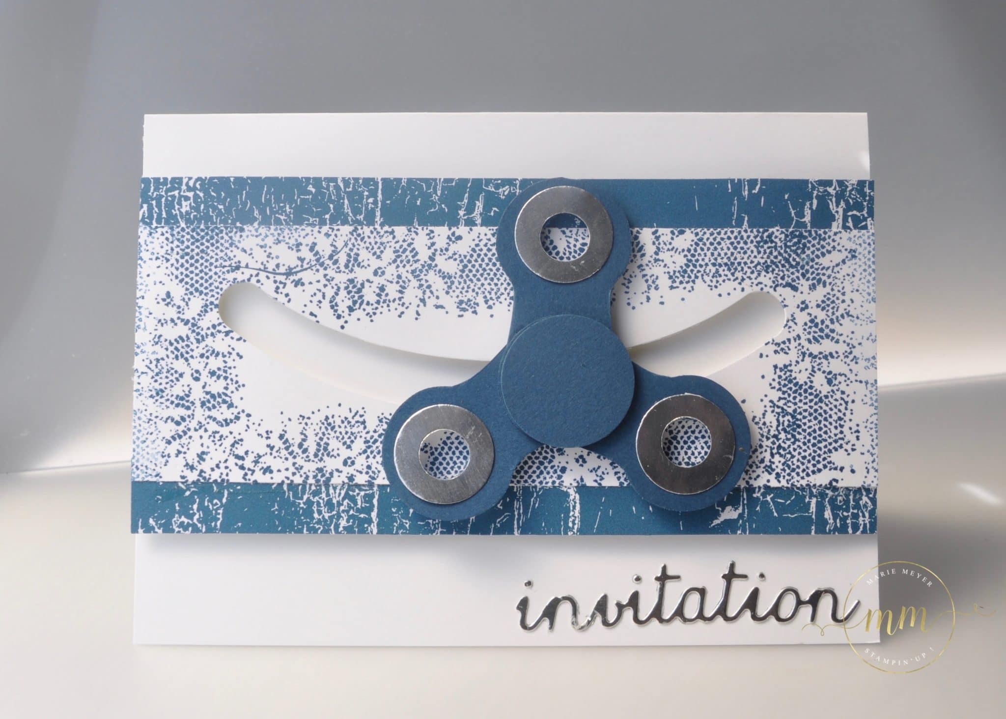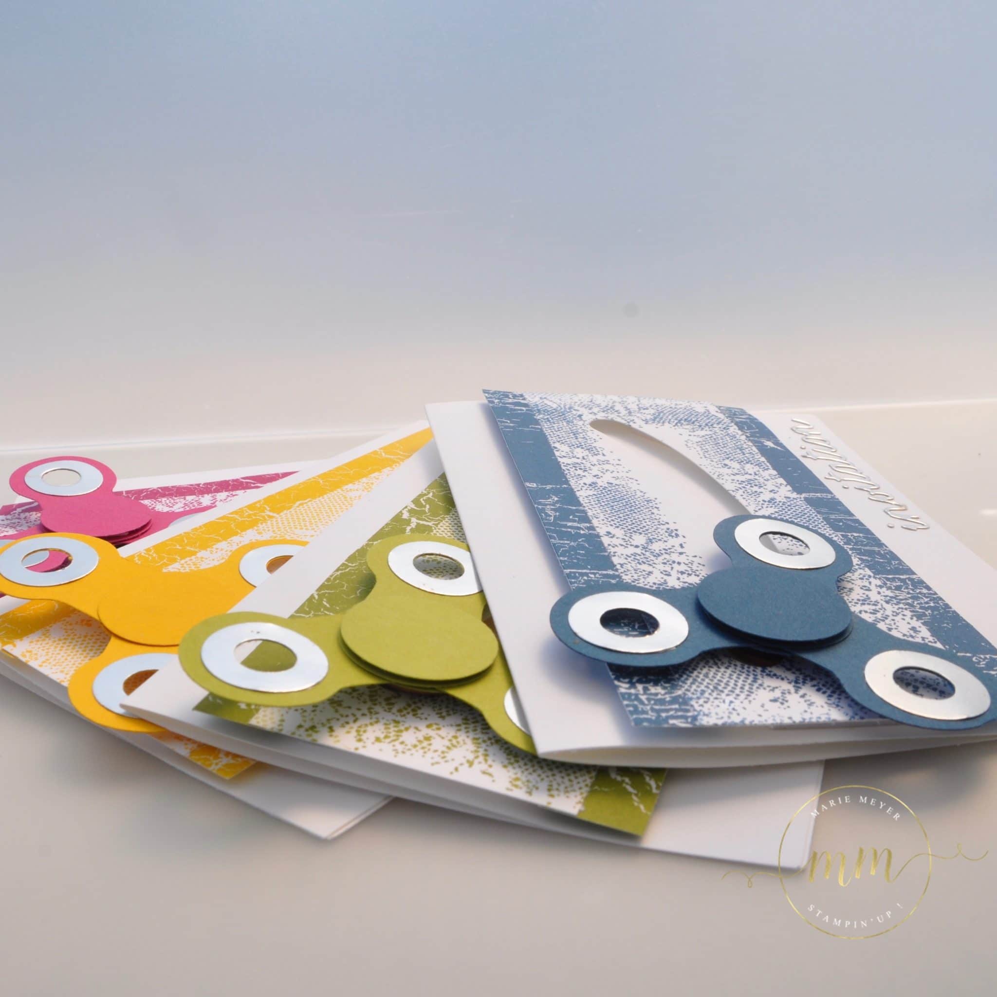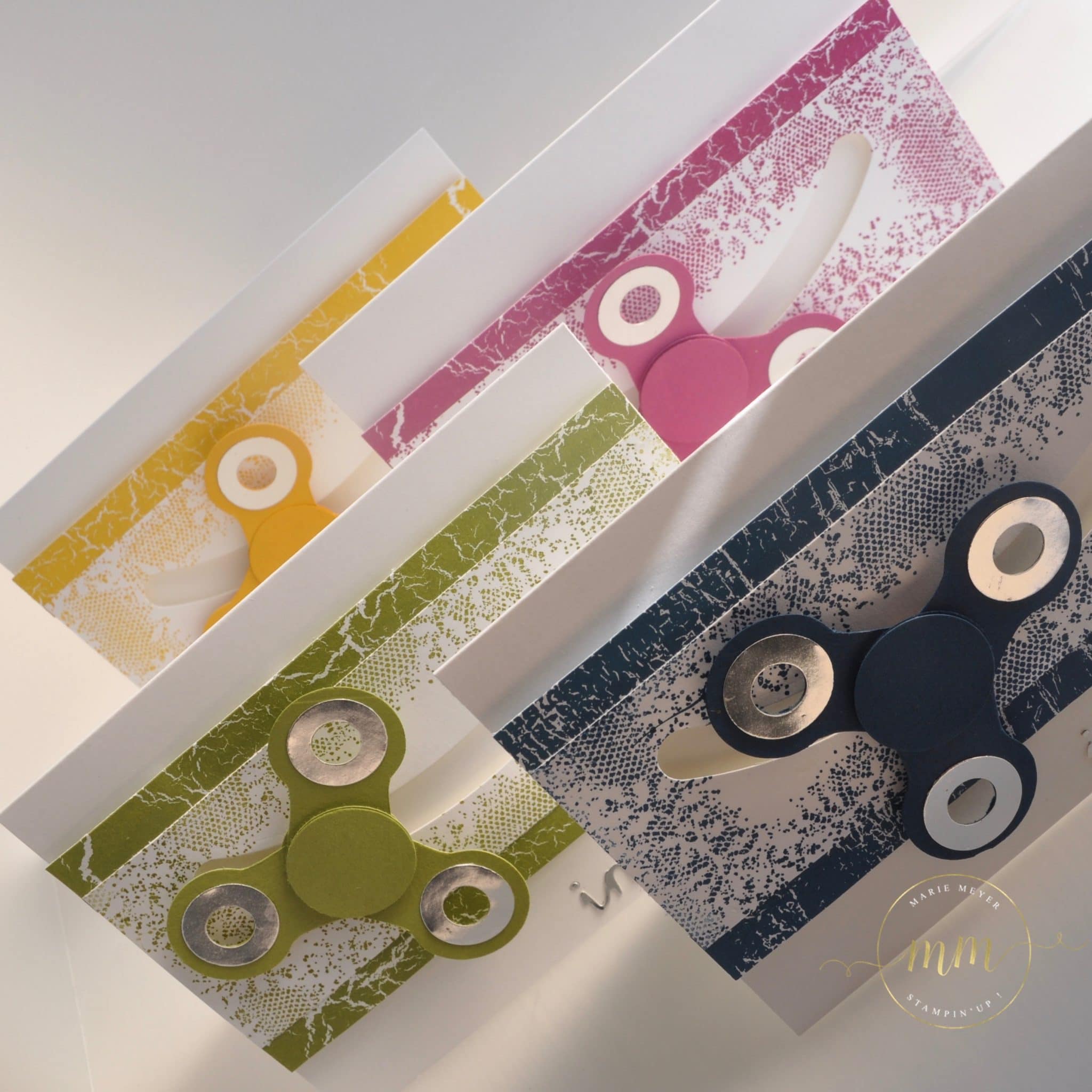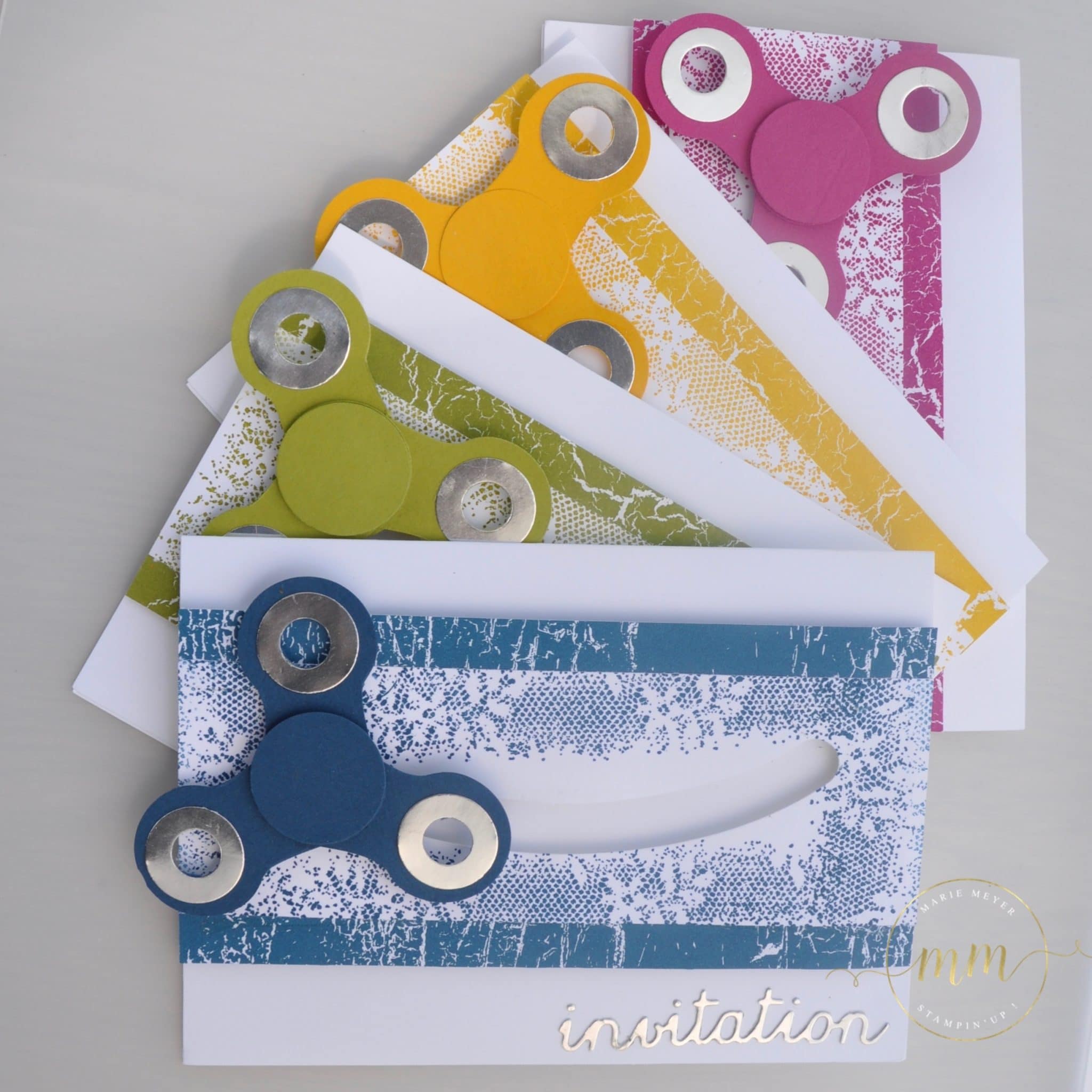 J’ai donc réalisé plusieurs projets sous ce thème et pour commencer, je vous propose de découvrir les cartes d’invitations hand spinner et son tutoriel. Pour se faire, j’ai utilisé le magnifique papier design de la série Théorie de Couleur ainsi que le set de tampons Touches of texture dans des teintes cari moulu, explosion de baies, denim dandy et vert olive.