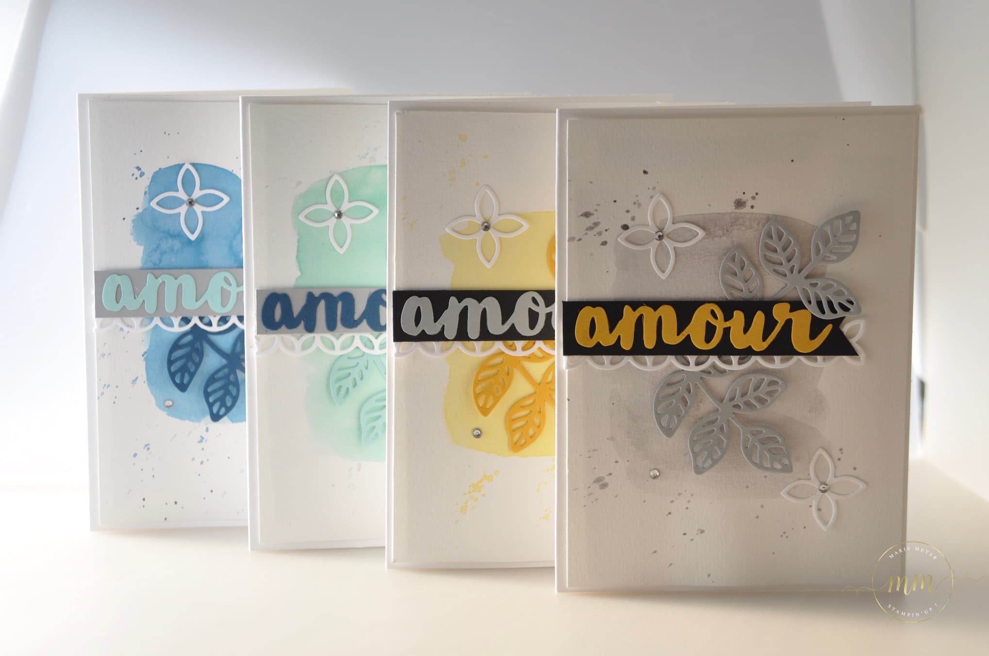 Avec le texte « bonheur » (qui n’est pas un dies de chez Stampin up 🙁 ), j’ai décliné mes cartes dans des teintes plus douces fleur de cerisier, sorbet aux prunes, fraîcheur pastèque et macaron à la menthe :
