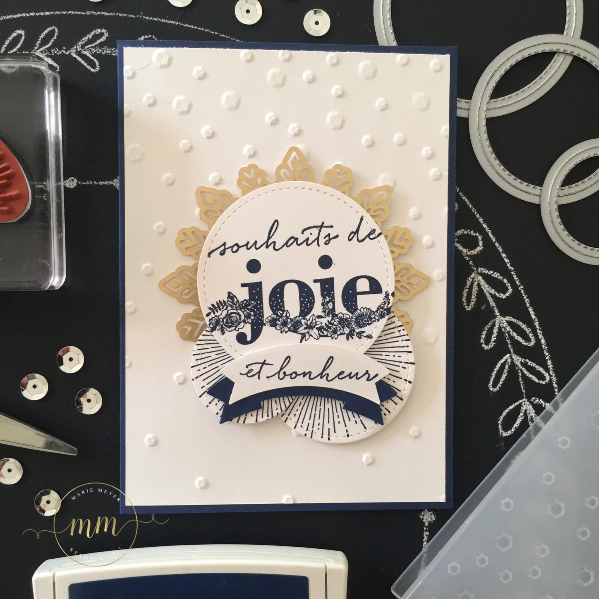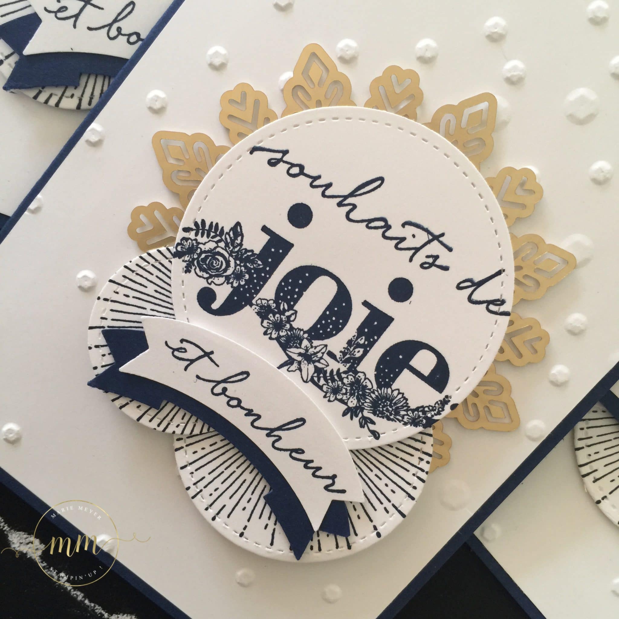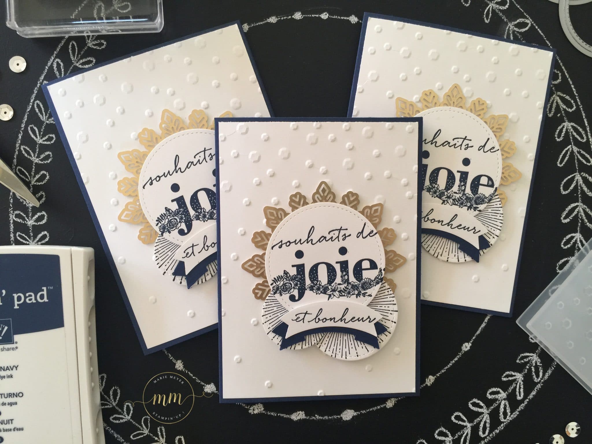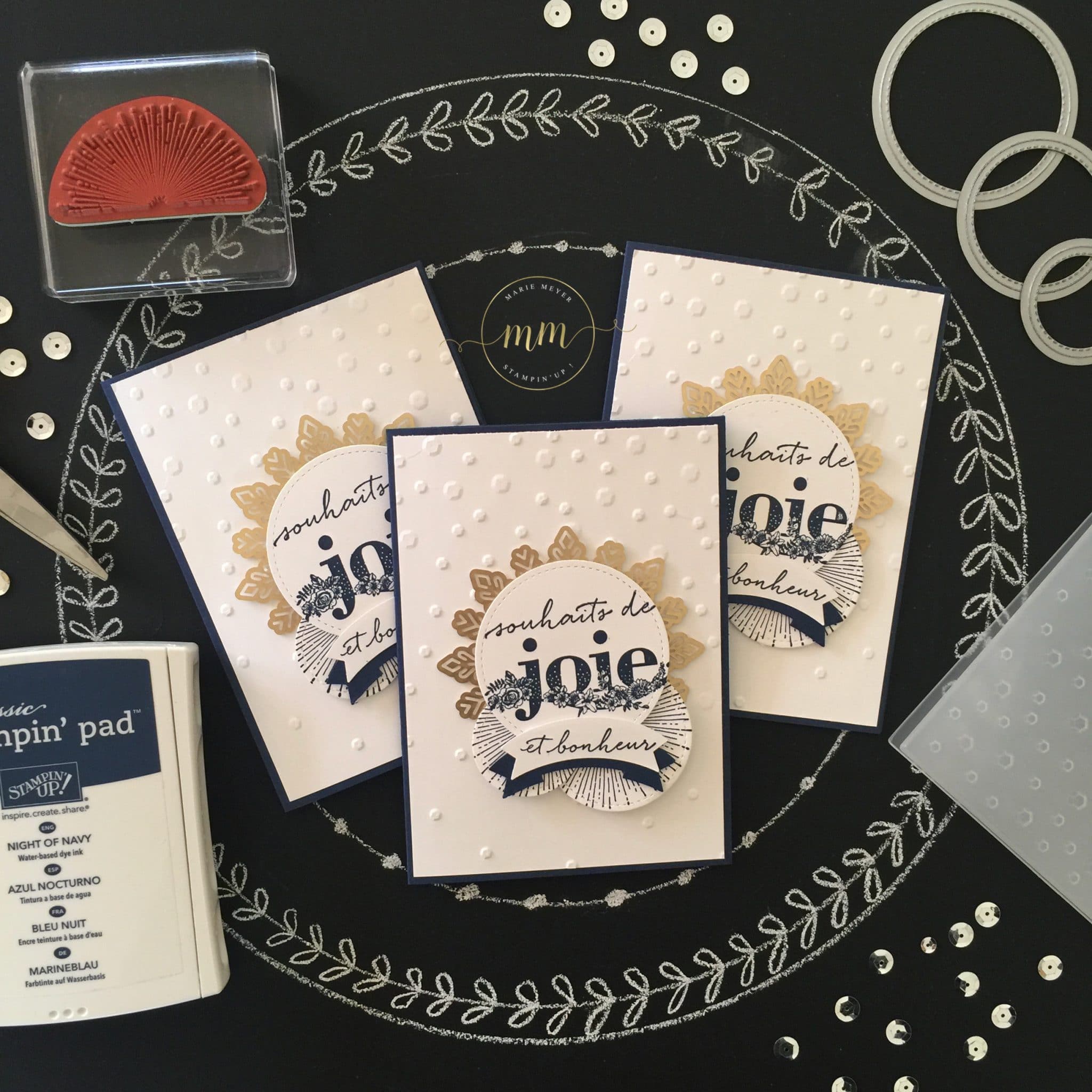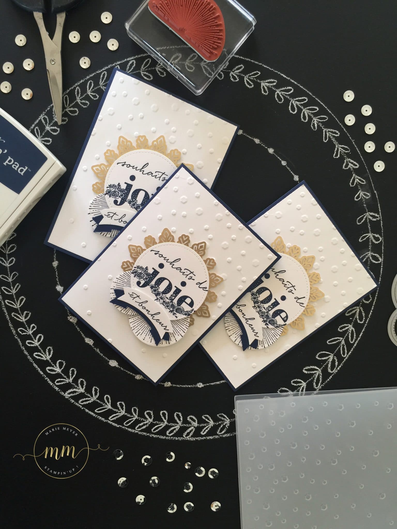 Ces cartes sont dans des teintes bleu nuit, or et blanc. Les deux sets de tampons que j’ai utilisés « Simplement formidable » et « Souhaits sympas » proviennent de notre catalogue Sale a bration qui vous sont offert par tranche de 60 € d’achat. Avec ce set de tampons « Souhaits sympas« , vous n’aurez plus aucunes excuses pour ne pas trouver le souhait qui conviendra à votre carte et surtout quelque soit la période de l’année. Mes cartes étaient destinées aux voeux pour la nouvelle année, mais elles pourraient très bien s’adapter pour d’autres occasions : anniversaire, fête, mariage, naissance….