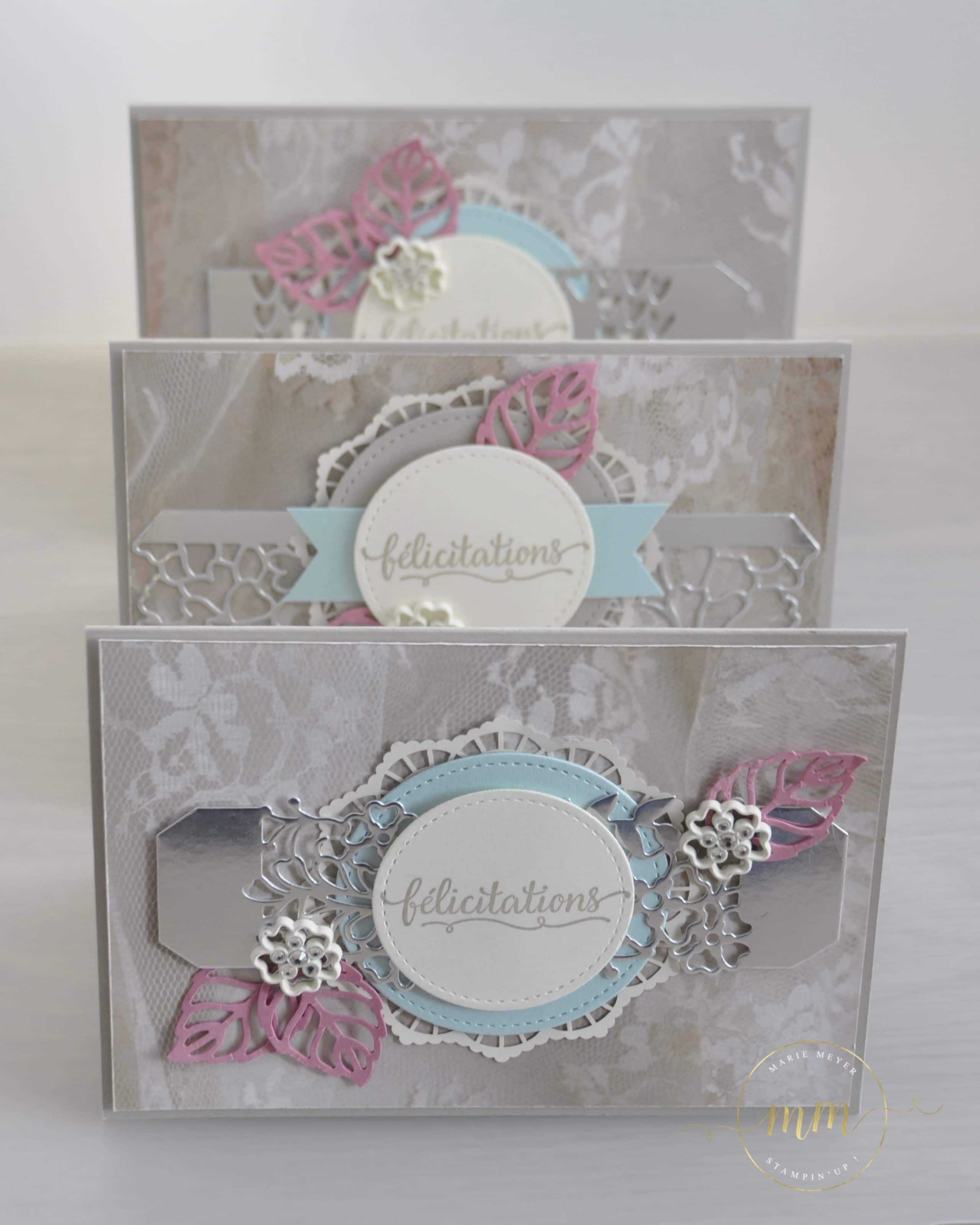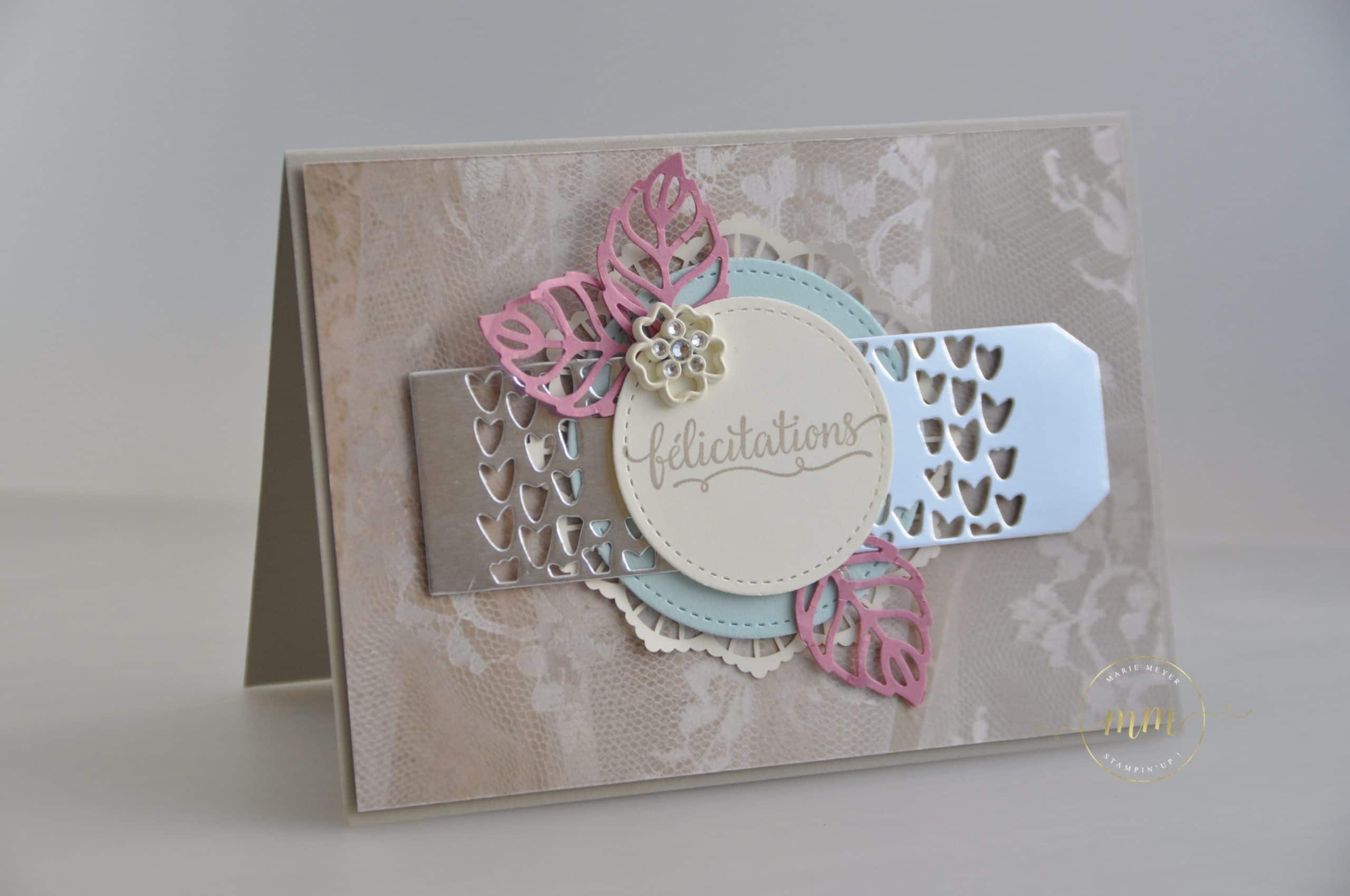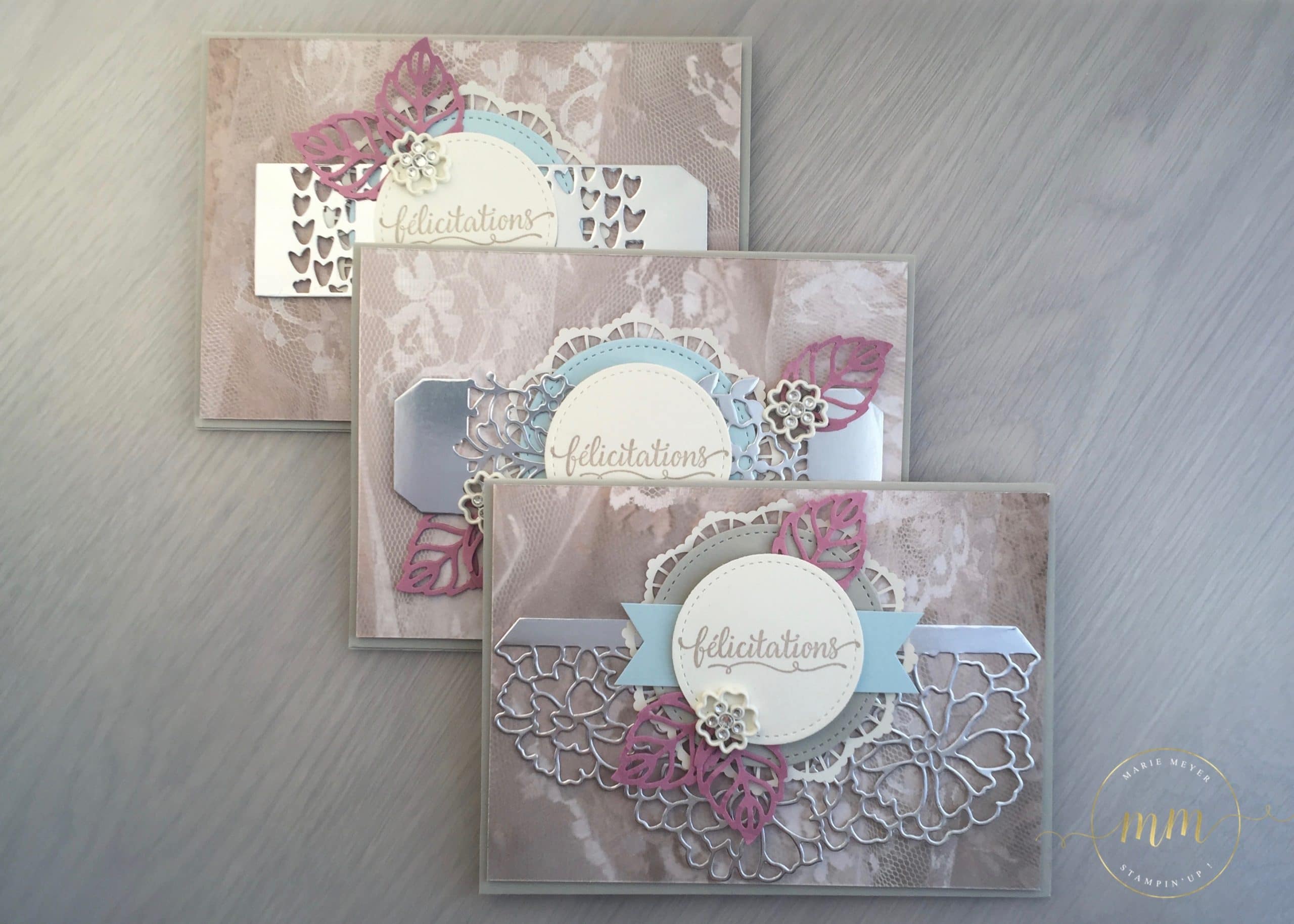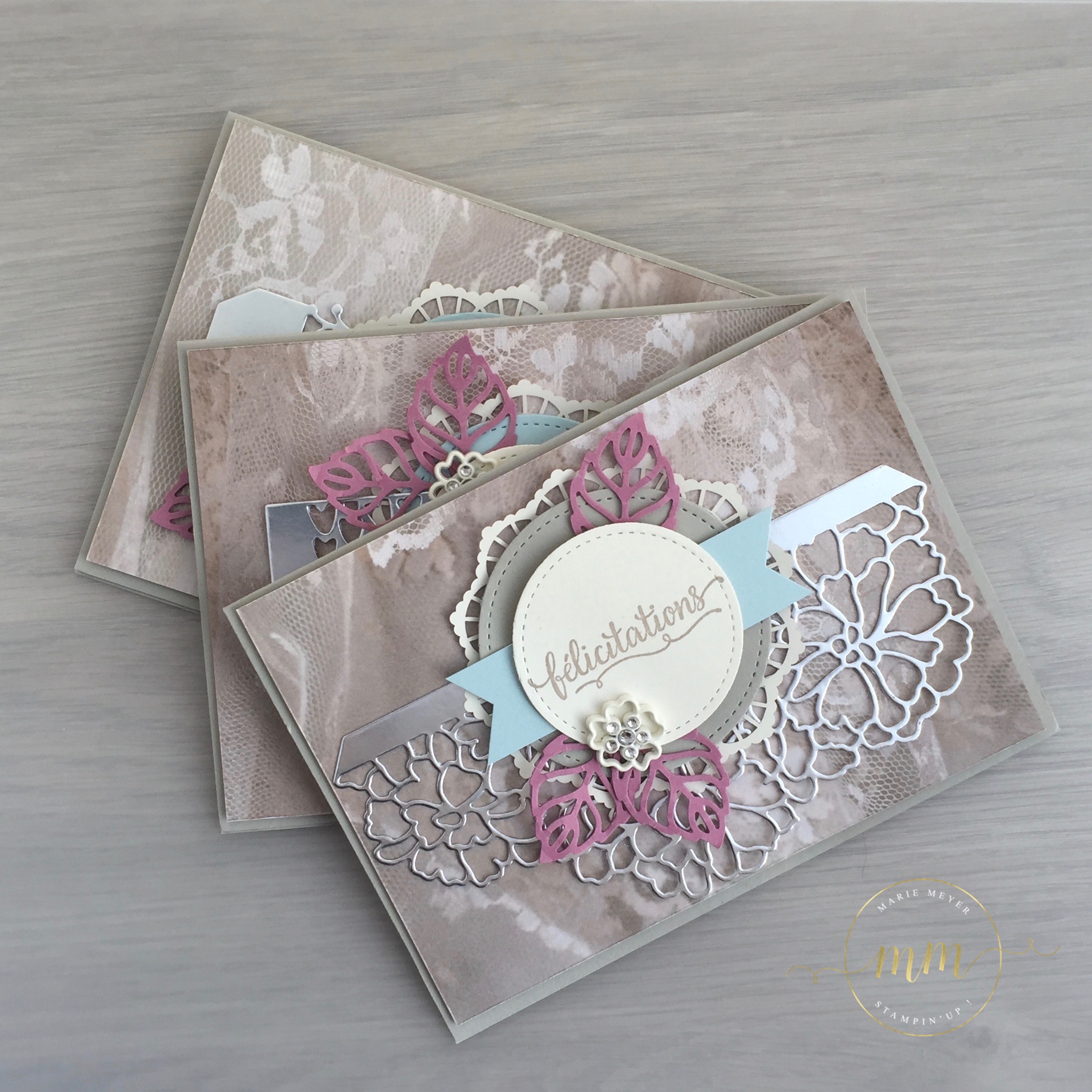 Si vous avez adoré mon post précédent, celui-ci vous plaira également ! Je vous propose de découvrir une autre série de cartes de félicitations de mariage toujours avec le Thinlits En détails ainsi que le papier de la série Design Amour naissant de notre Catalogue Printemps Eté. Ces produits sont juste superbes et classes ! Je suis trop fan !