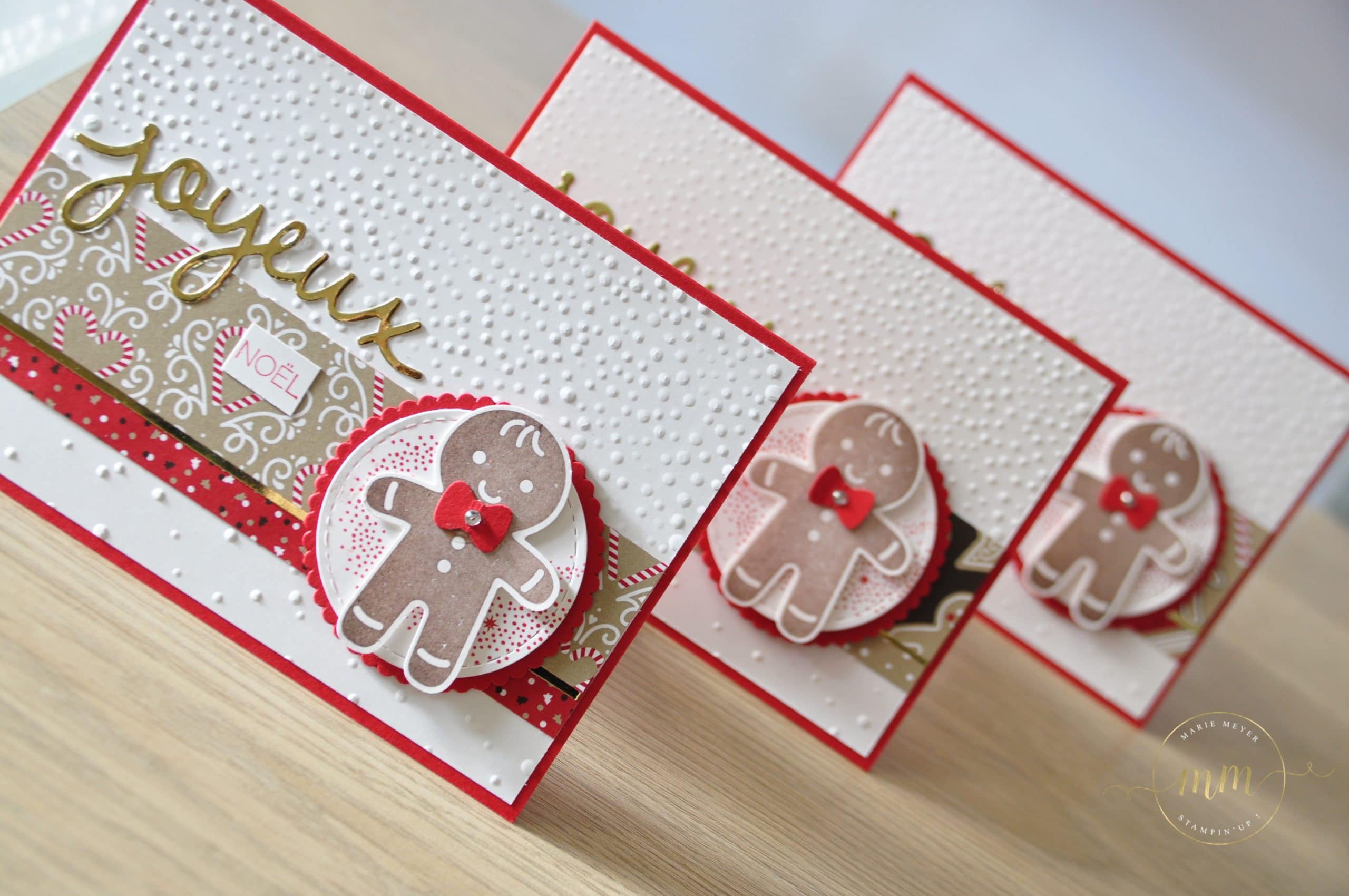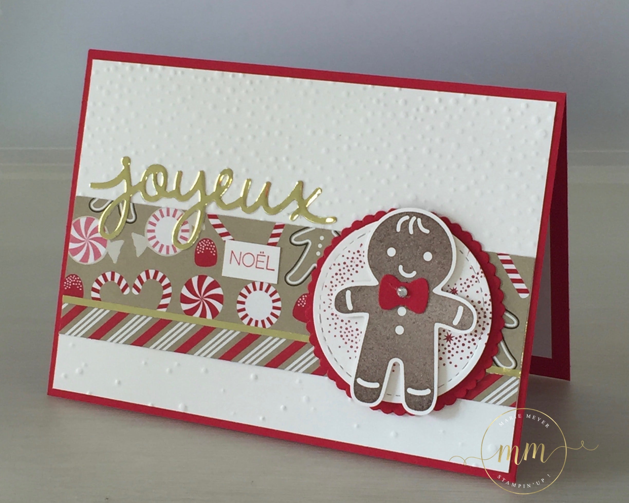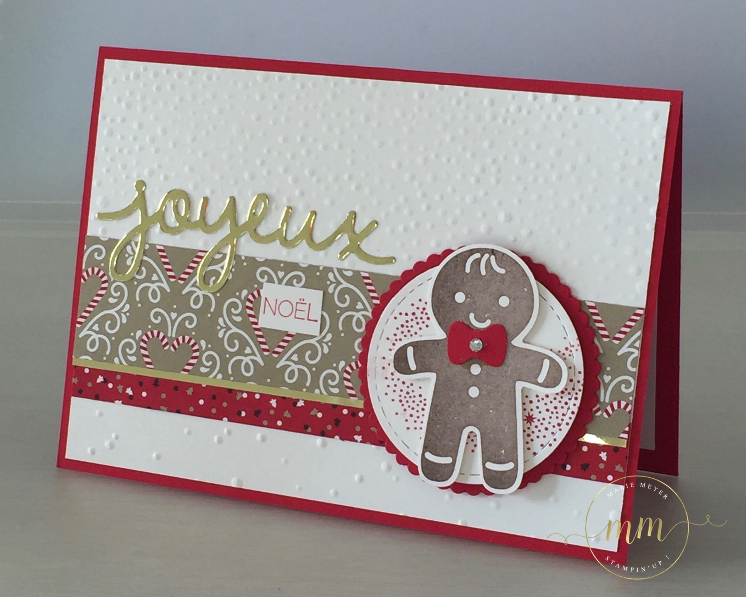 Pour l’heure, je vous présente des cartes de Noël que j’avais envoyé à toutes mes clientes proches ou lointaines géographiquement pour les remercier de leur fidélité en me passant commande sur ma boutique en ligne mais également à quelques amies qui me sont chers. Pour ces cartes j’avais utilisé le papier Canne de Noël qui est absolument magnifique ainsi que le set de tampons Emporte pièce.