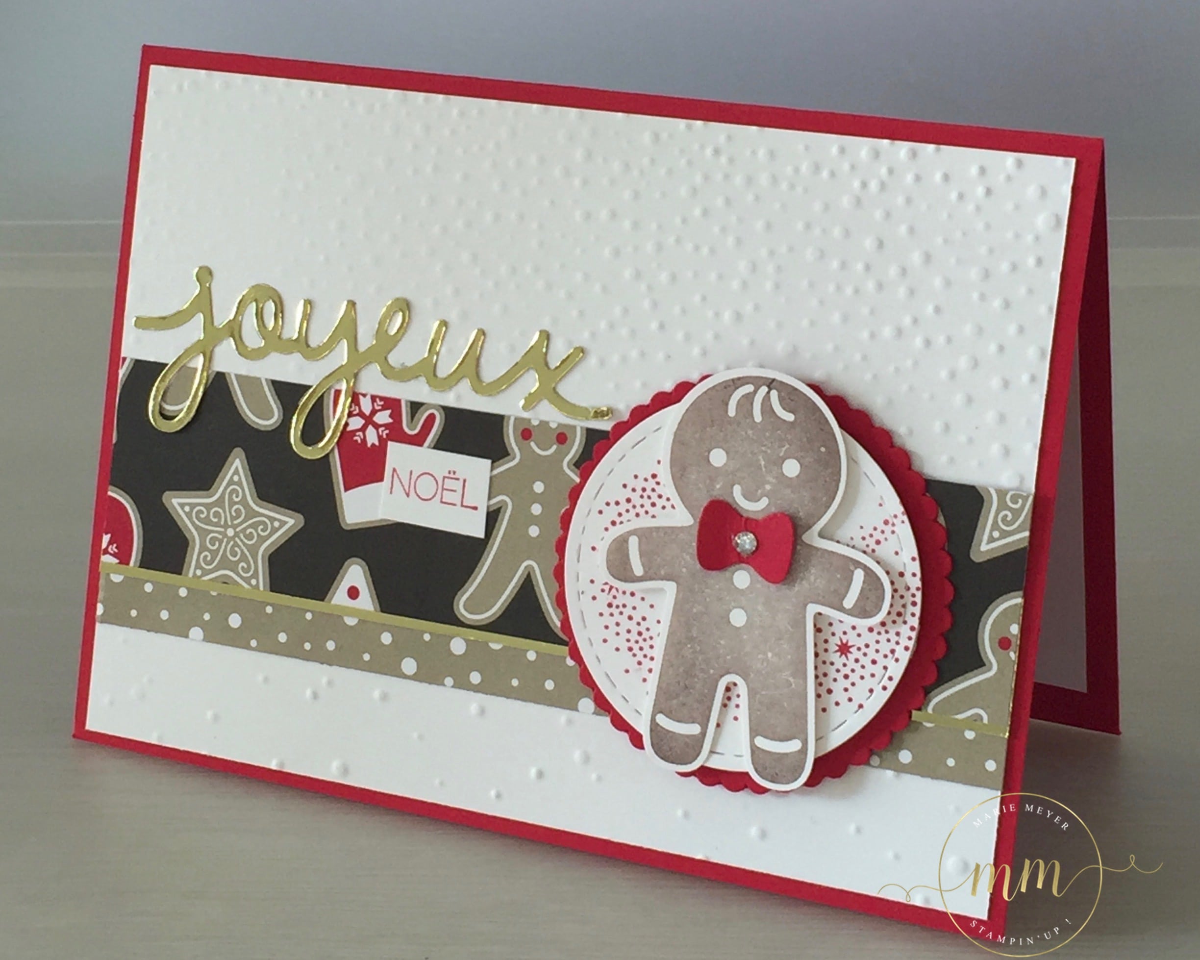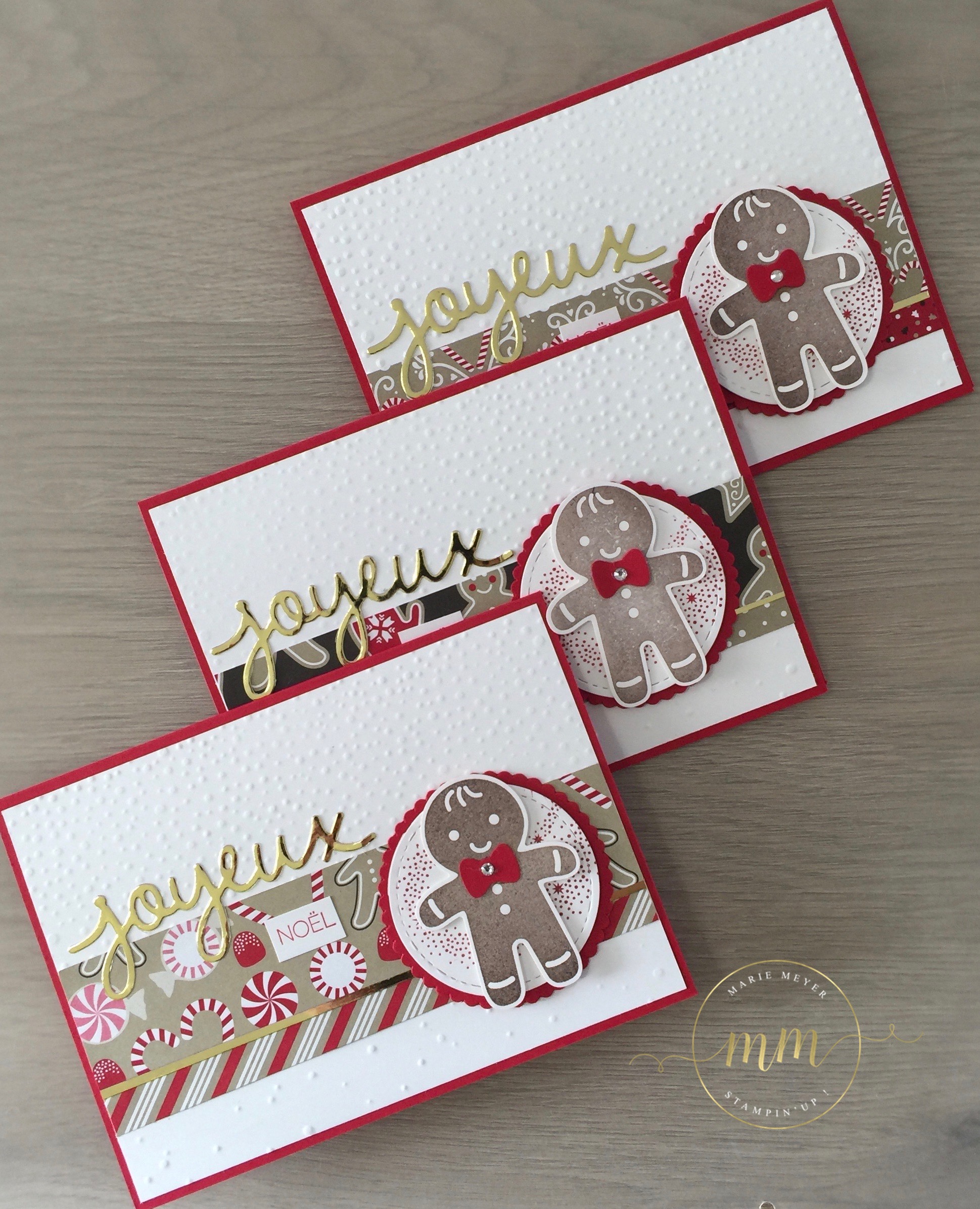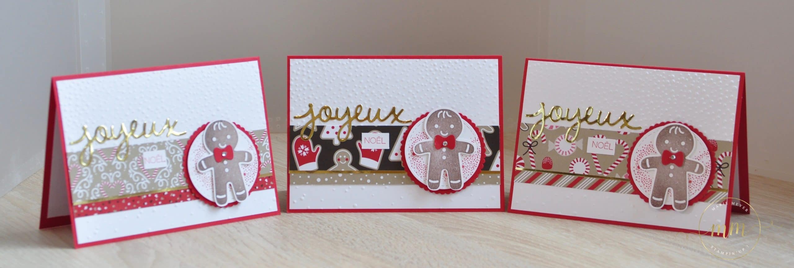 Pour l’heure, je vous présente des cartes de Noël que j’avais envoyé à toutes mes clientes proches ou lointaines géographiquement pour les remercier de leur fidélité en me passant commande sur ma boutique en ligne mais également à quelques amies qui me sont chers. Pour ces cartes j’avais utilisé le papier Canne de Noël qui est absolument magnifique ainsi que le set de tampons Emporte pièce.
