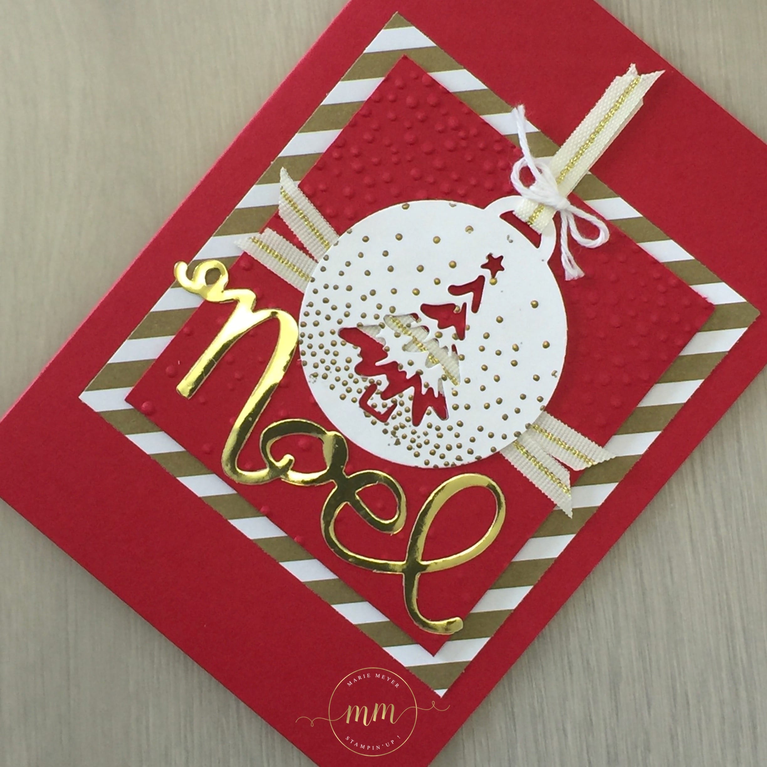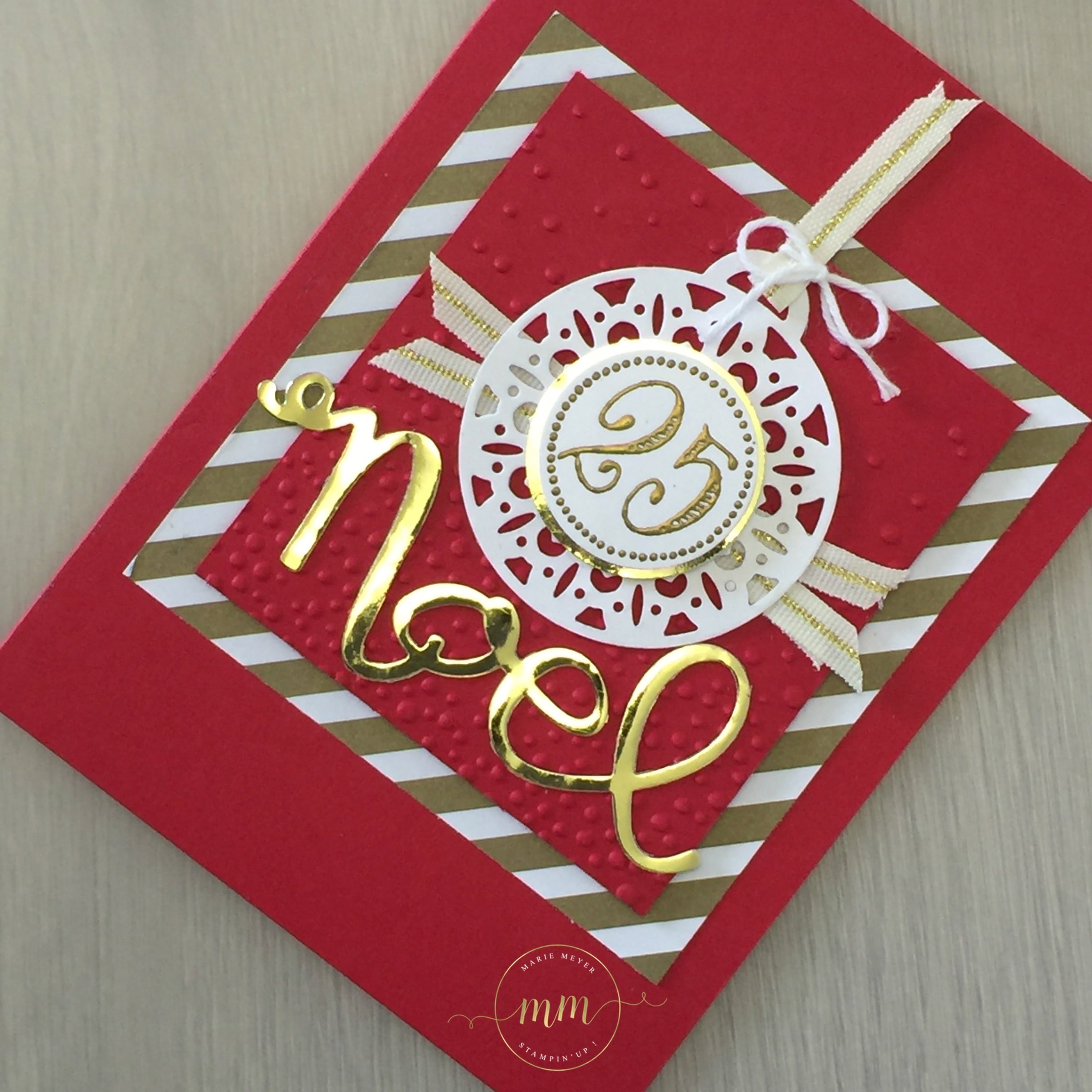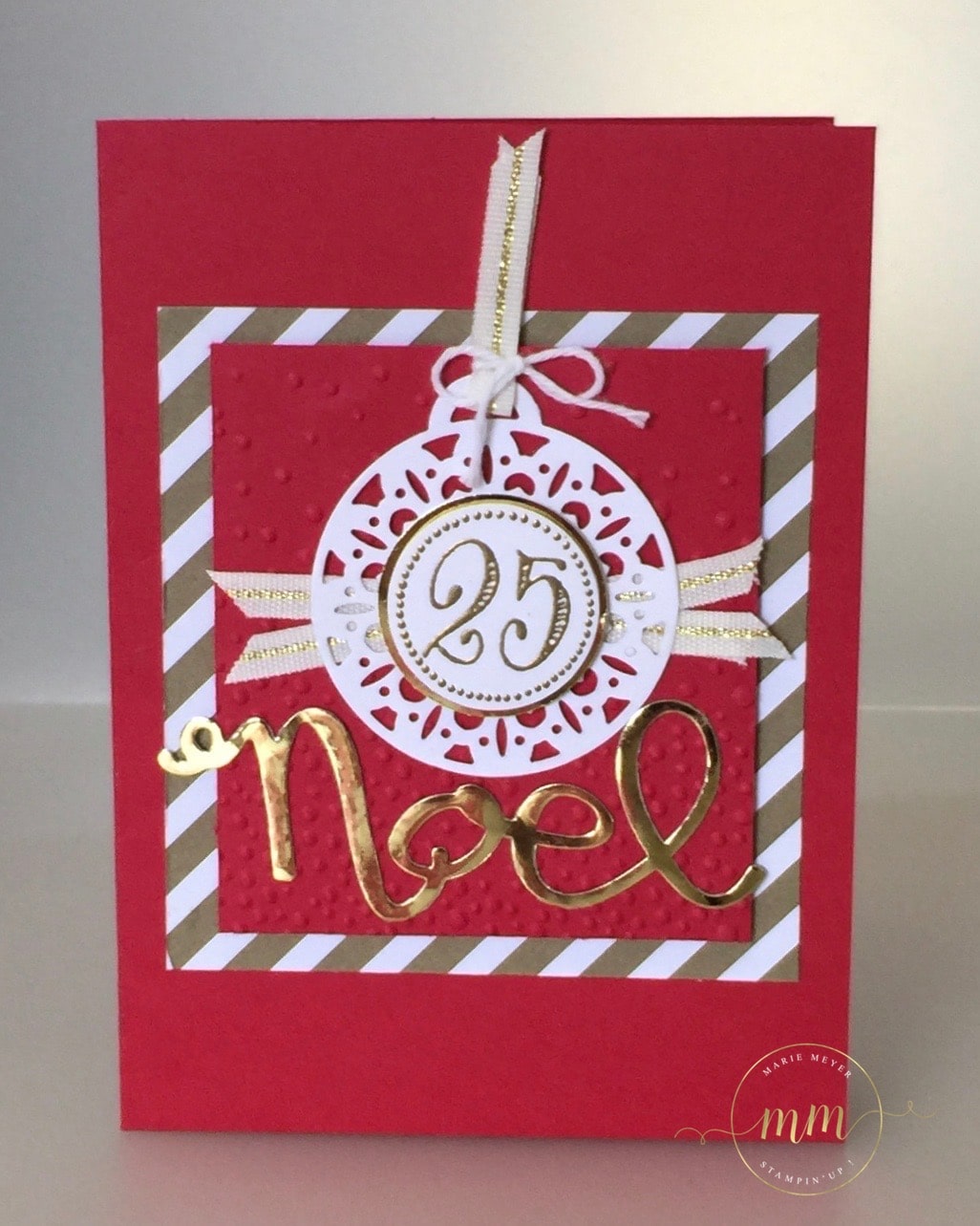 J’ai utilisé le Framelits Joyeuses Etiquettes et le Framelits Pour couronner Noël dans les couleurs rouges et or, que voici :