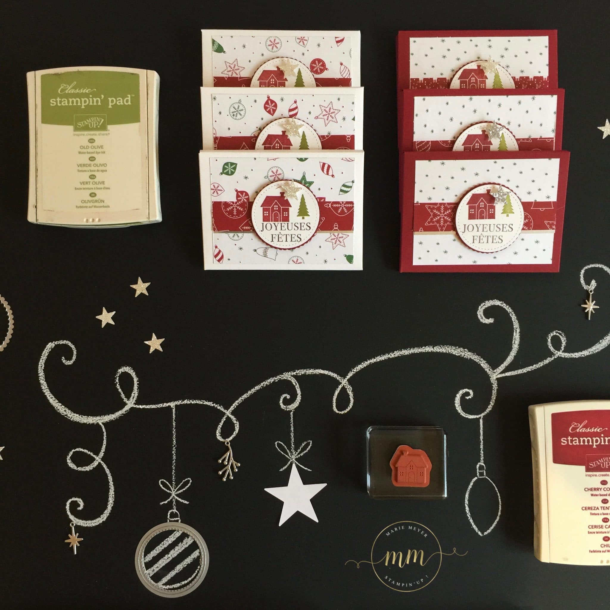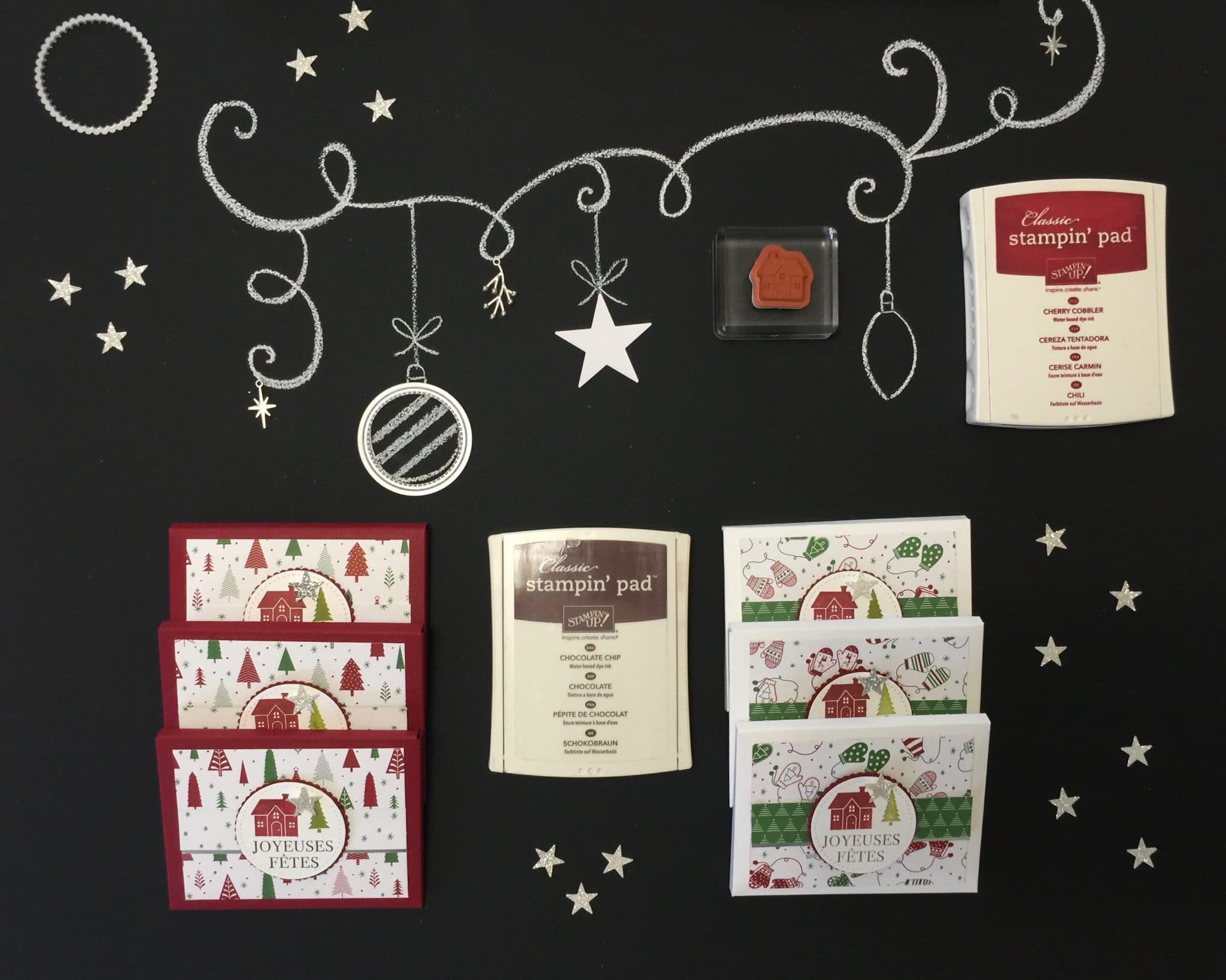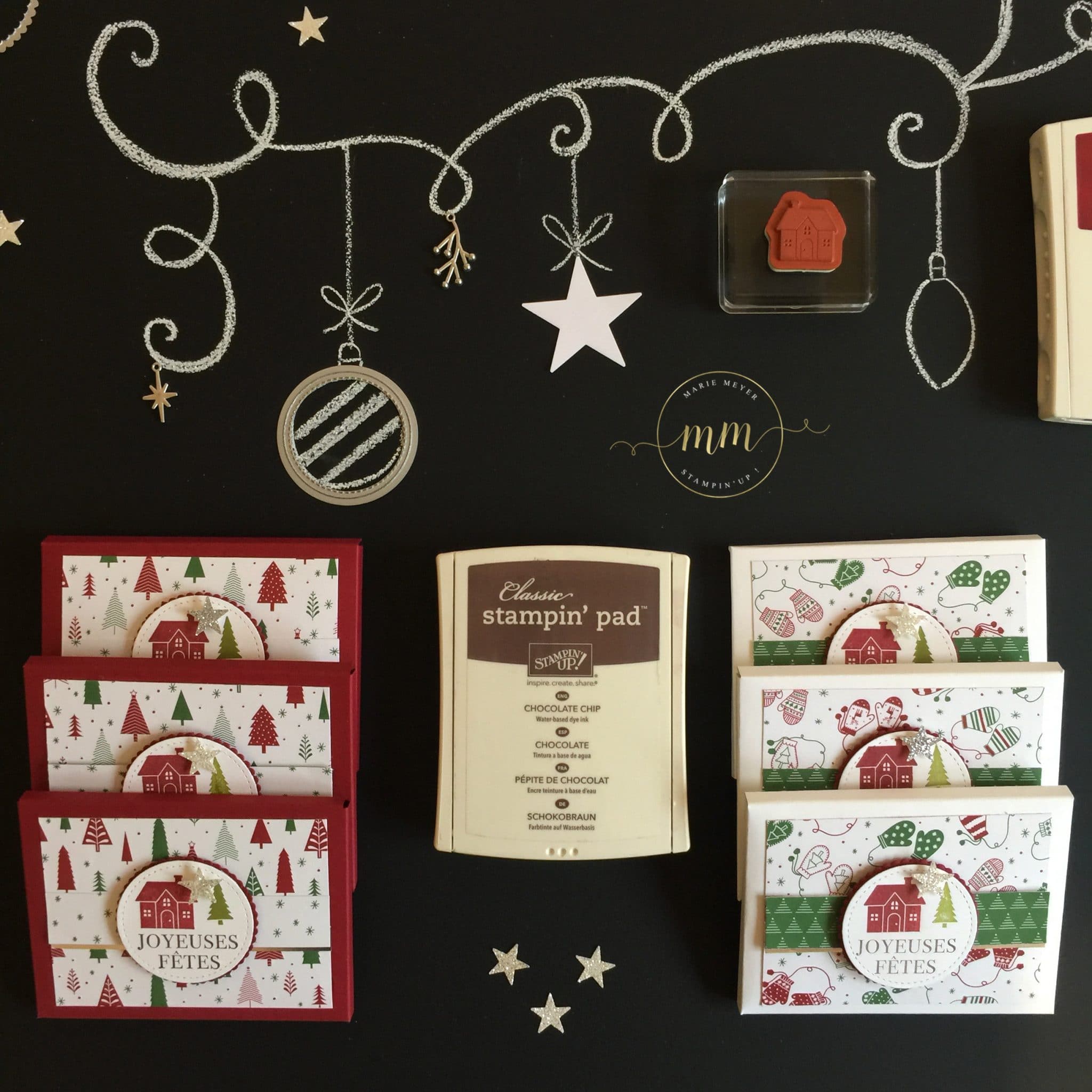 Je n’allais pas les offrir de cette façon alors j’ai pensé que je pouvais utiliser ma planche insta enveloppe pour les emballer, et les décorer avec le papier de la série Design Soyons joyeux. J’ai assorti mes minis calendriers de poche dans des teintes rouge et vert olive. Côté tamponnage, j’ai utilisé le magnifique set de tampons Ensemble à Noël !