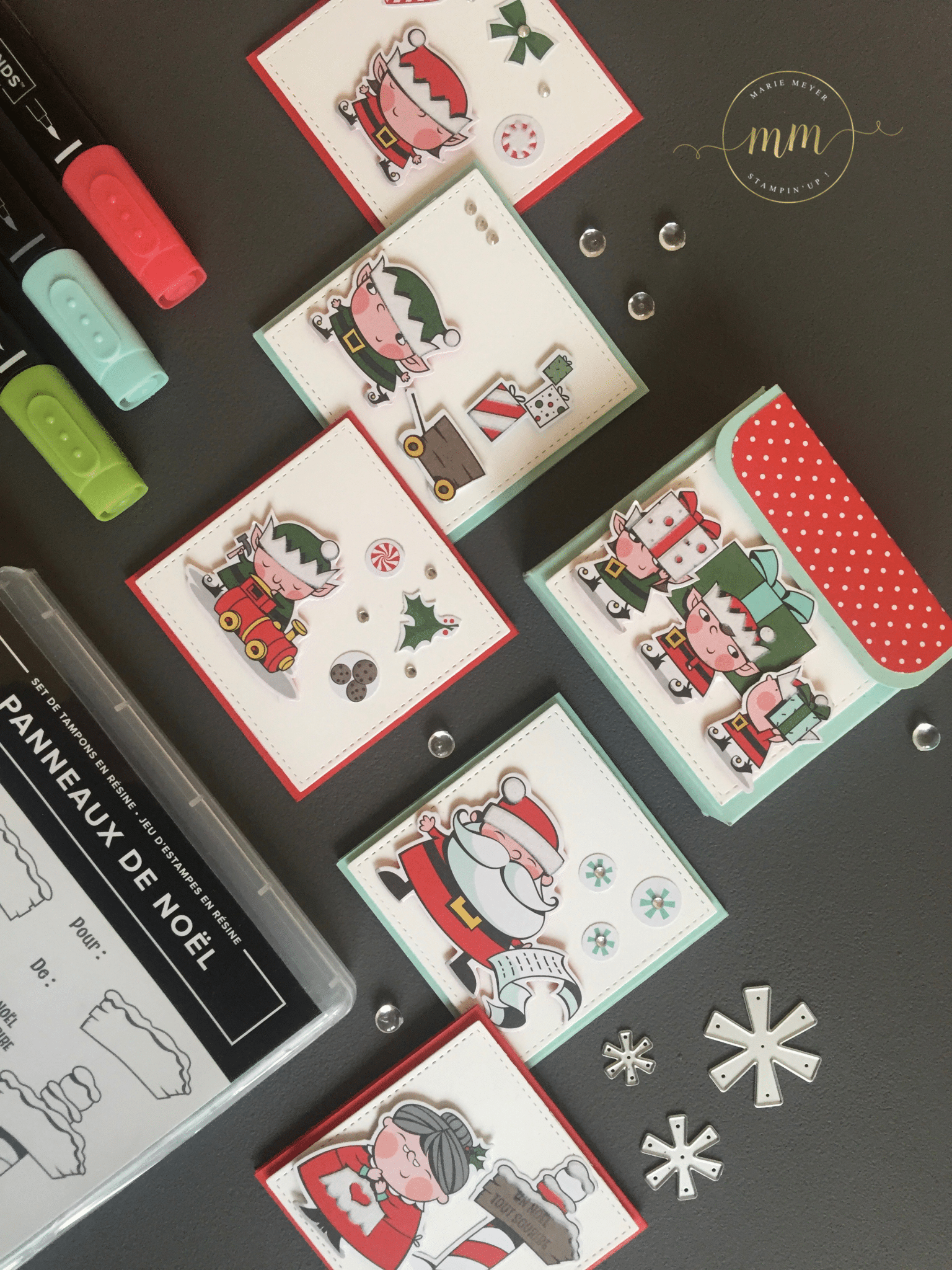 Me voici de retour après une semaine ultra chargée, pour vous présenter des Minis cartes L’Atelier du Père Noël avec sa boîte et son tutoriel, que j’ai proposé au cours de mes derniers ateliers.