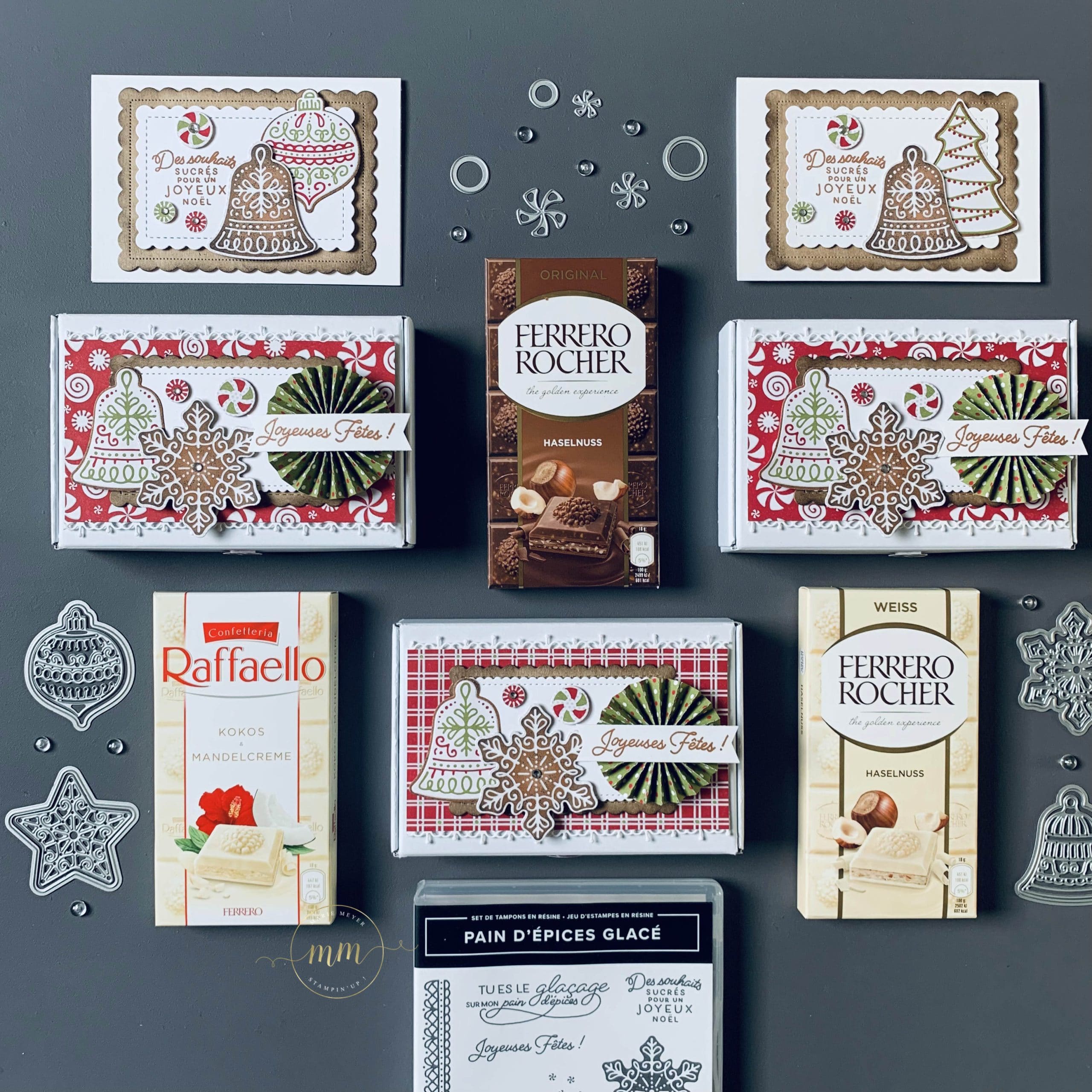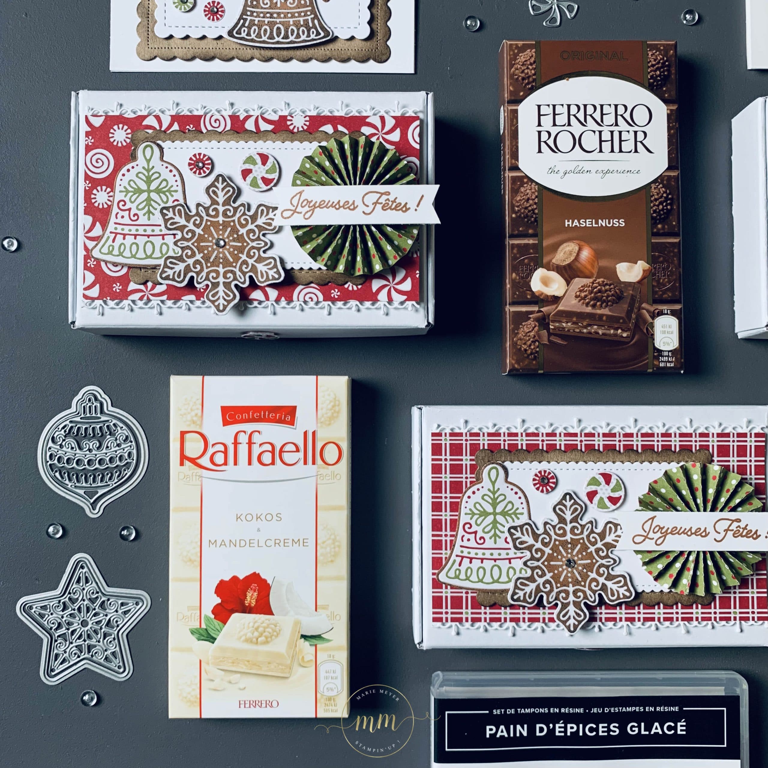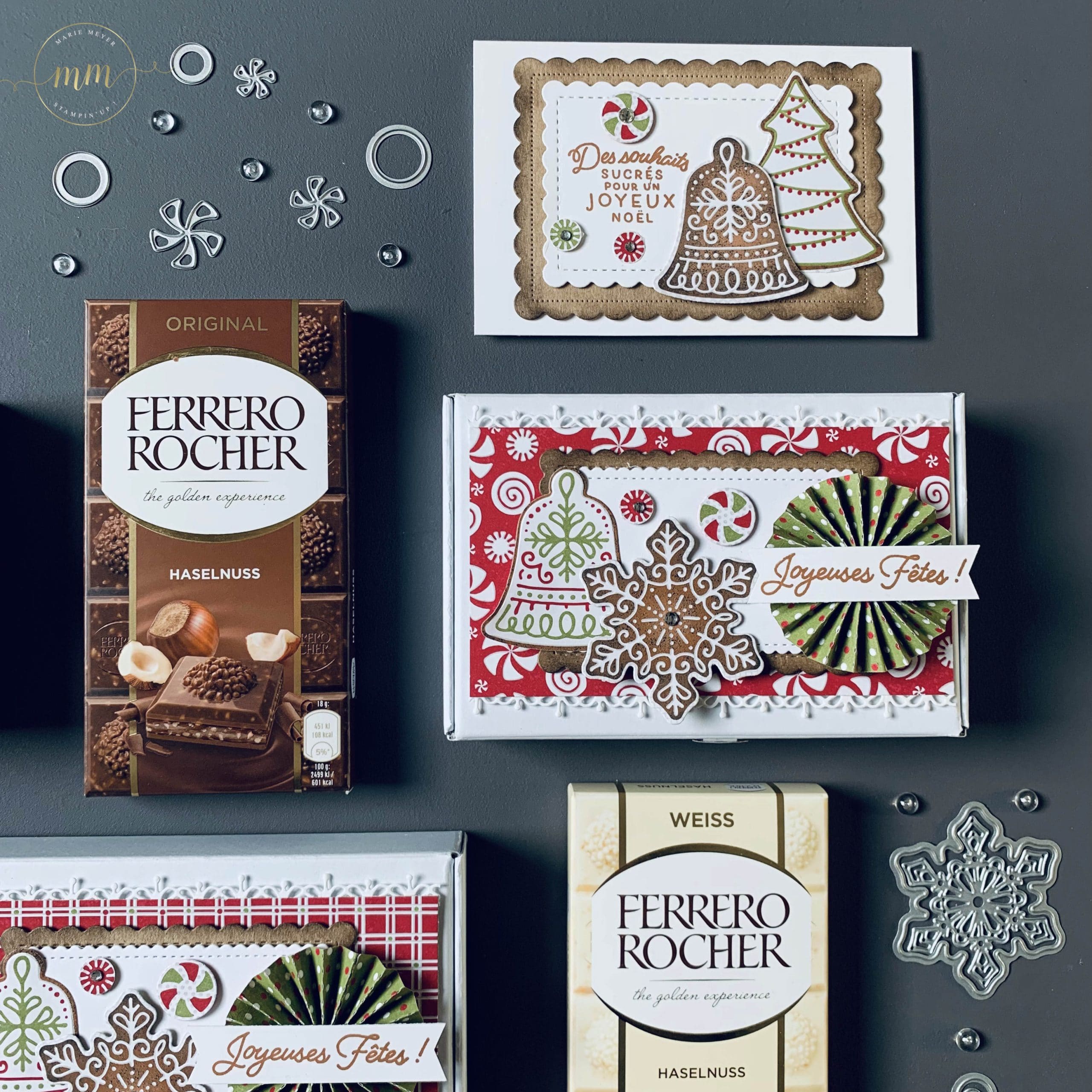 Pour réaliser mes Tablette Ferrero Rocher dans sa boîte gourmande, j’ai utilisé le Papier de la série Design Pain d’épices et bonbon et le Lot pain d’épices glacé (Set de tampons Pain d’épices glacé et Poinçons Pain d’épices).