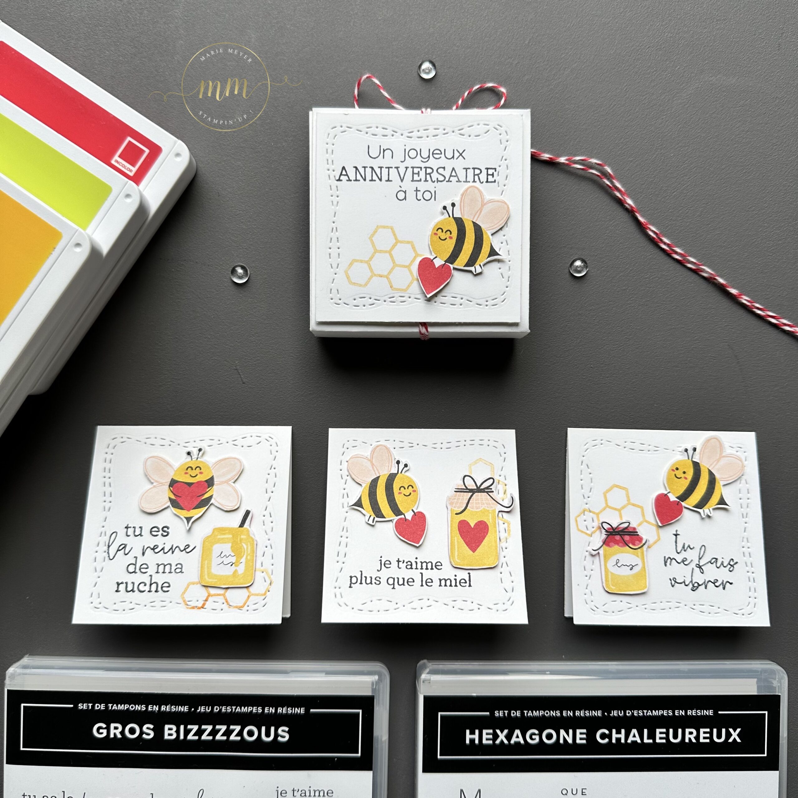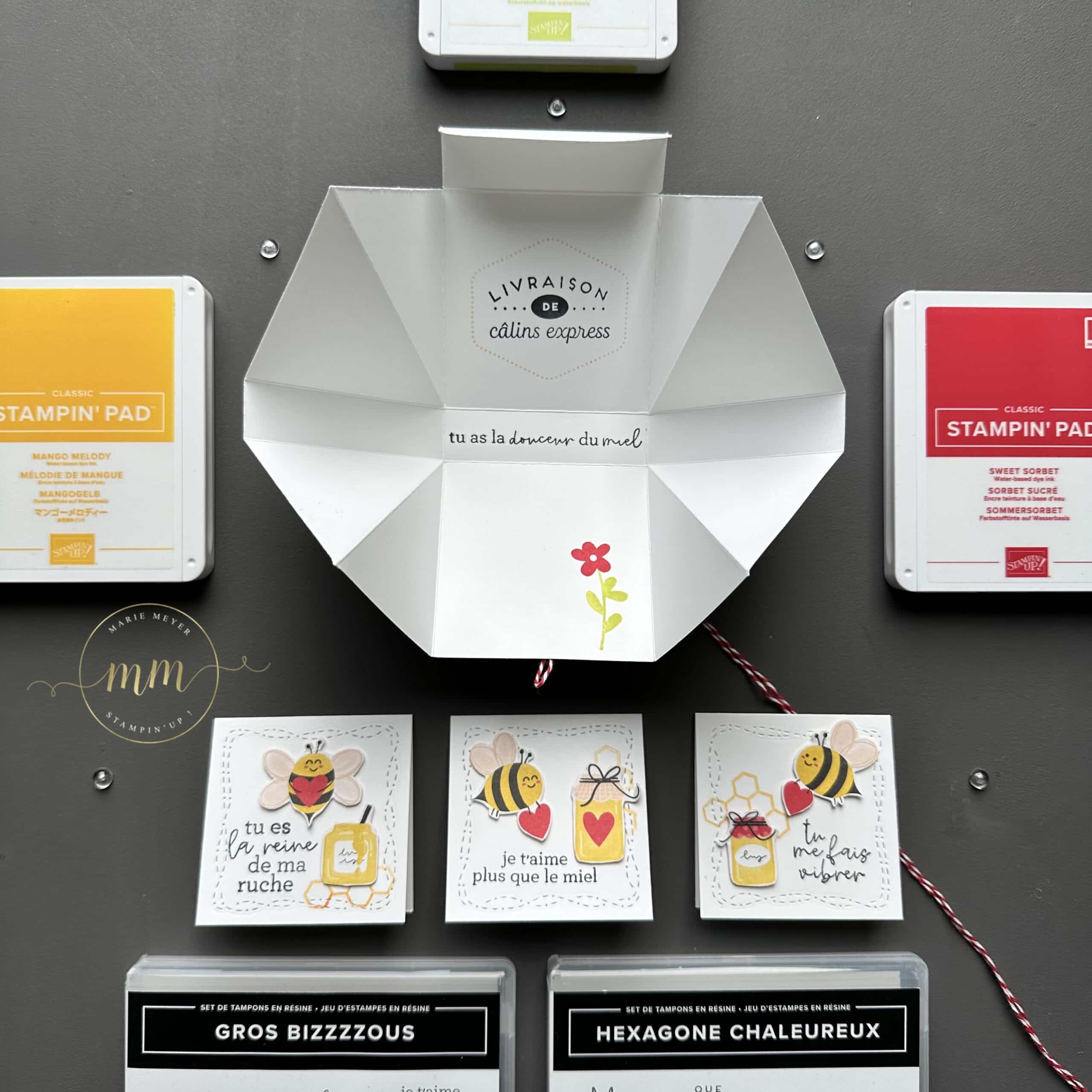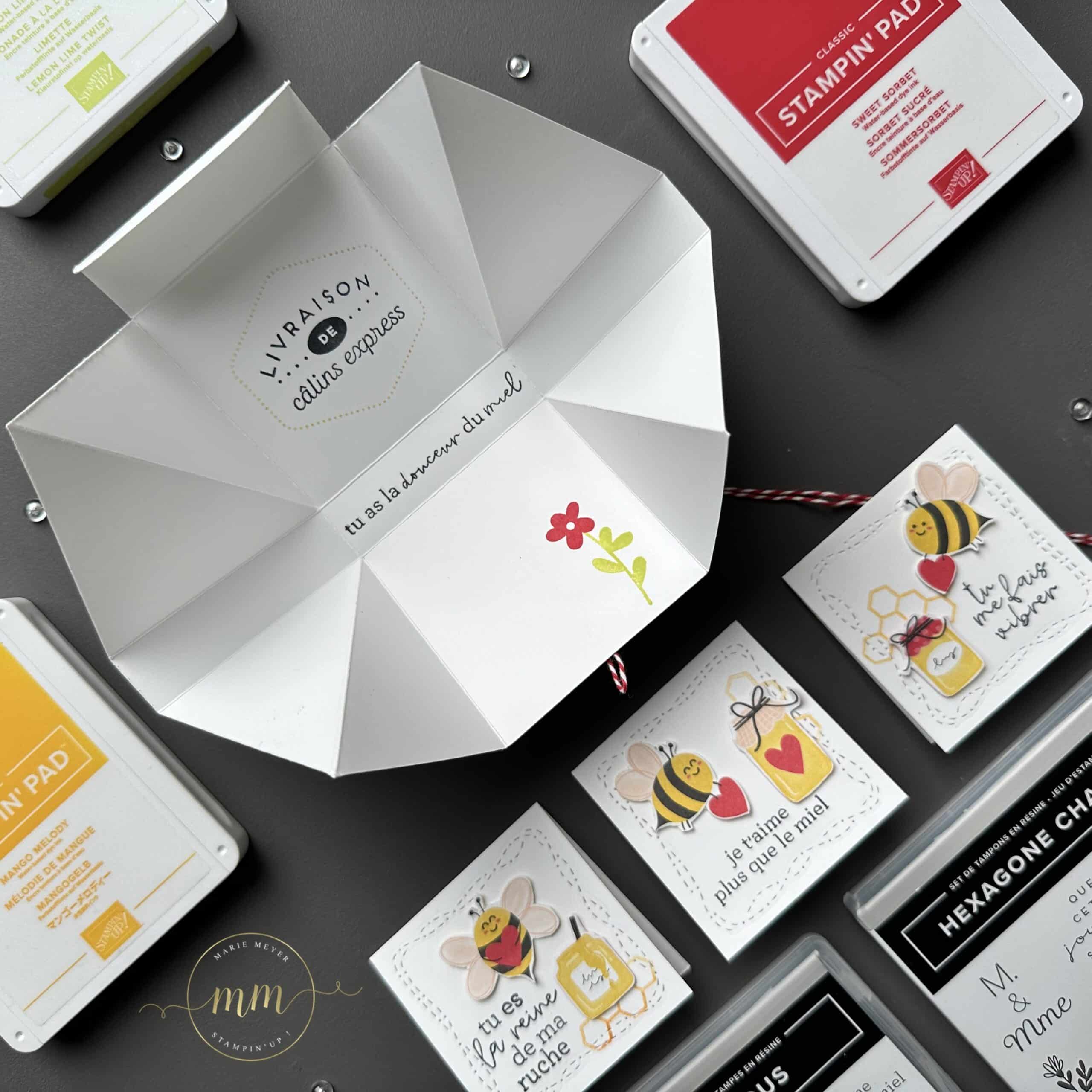 Pour réaliser ce projet, j’ai utilisé la Collection Petite abeille chérie issue du Mini catalogue Printemps Eté 2024 avec le Papier Design Petite Abeille chérie, le Set de tampons Gros bizzzzous et Perforatrice Mon abeille, le Set de tampons Hexagone chaleureux et le Set de tampons Surprise en fête.