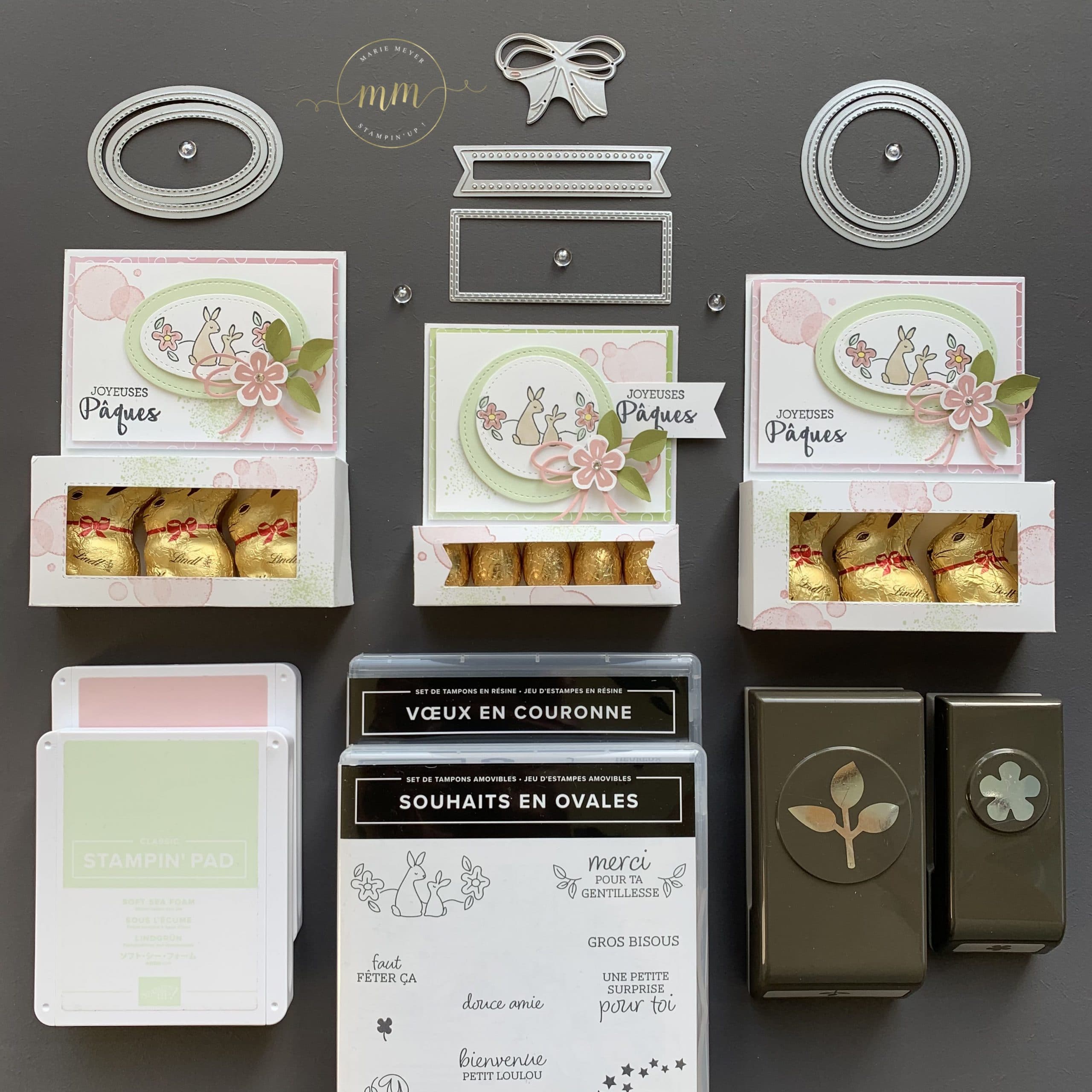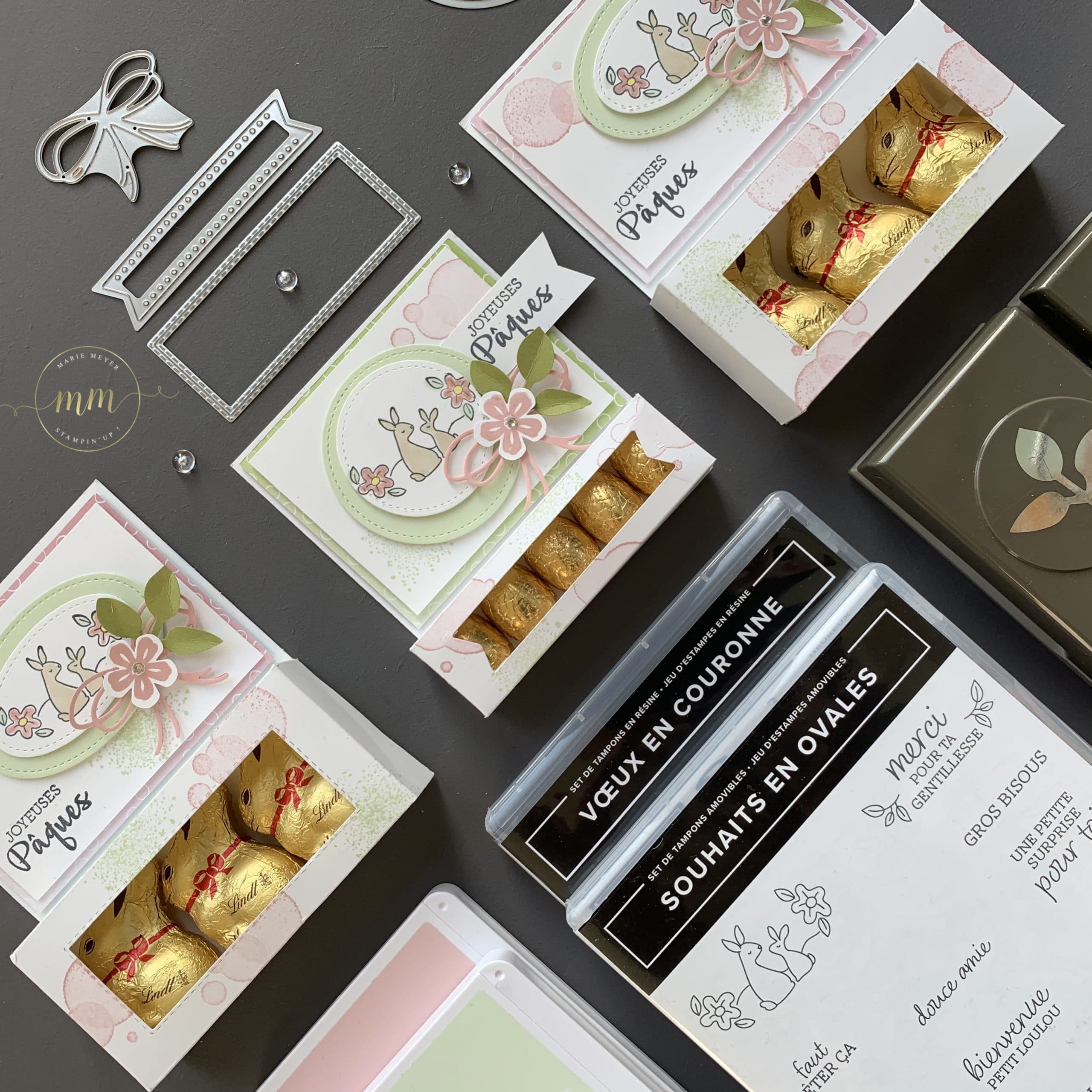 J’ai le plaisir de vous présenter, un adorable projet de Pâques que j’ai proposé récemment en atelier avec le Tutoriel Boîtes à chocolats de Pâques Version Mini Lapin Lindt !!!! Ces jolies boîtes sont destinées à être envoyées ou données à vos enfants, petits-enfants ou amis ! Comme les Fêtes de Pâques seront plus ou moins compromises cette année…. je me suis dis que vous apprécierez d’envoyer quelques Lapins de Pâques ou des oeufs Pâques dans une enveloppe à bulles…. Vous pourrez également, les déposer sur votre superbe table de Pâques ! Jugez plutôt !
