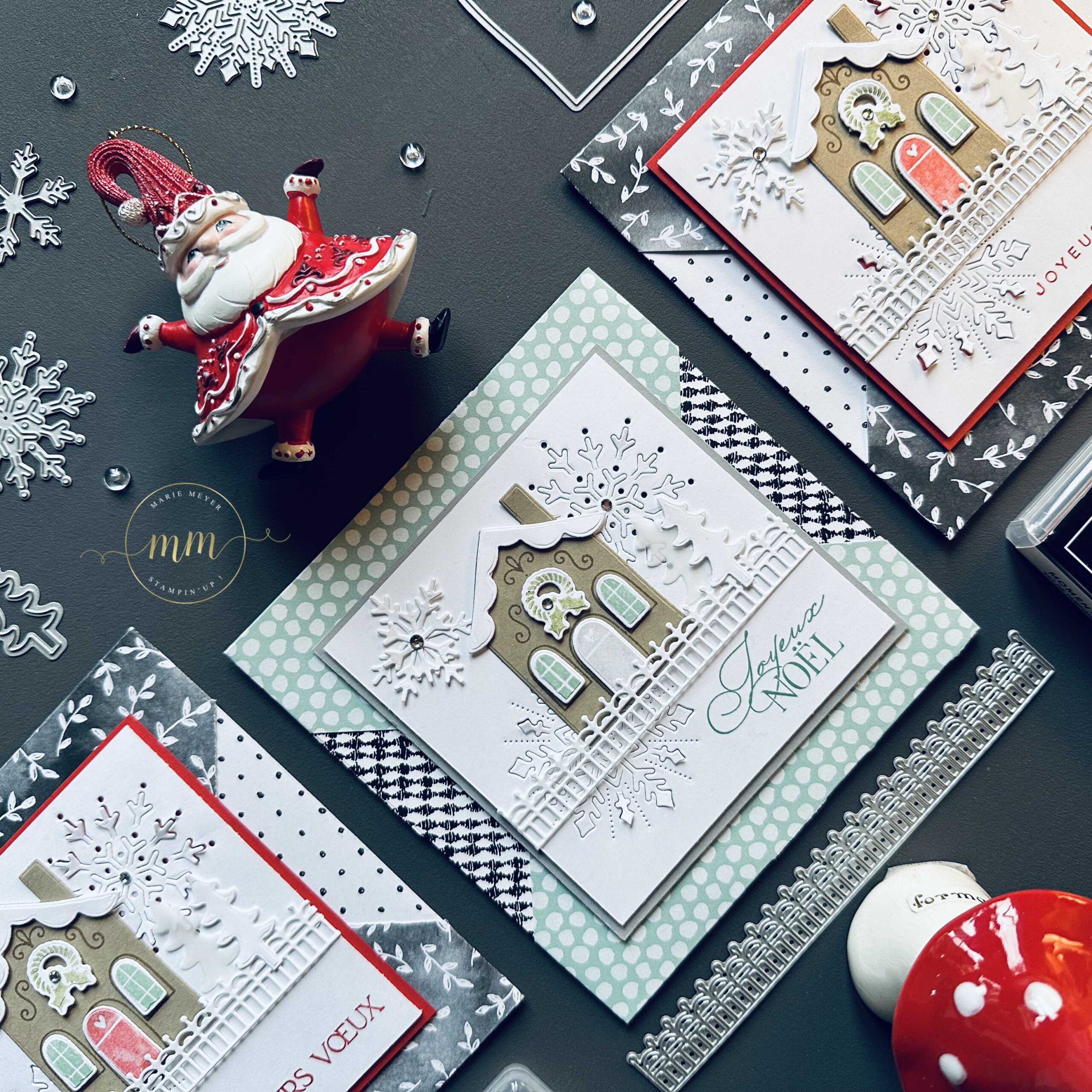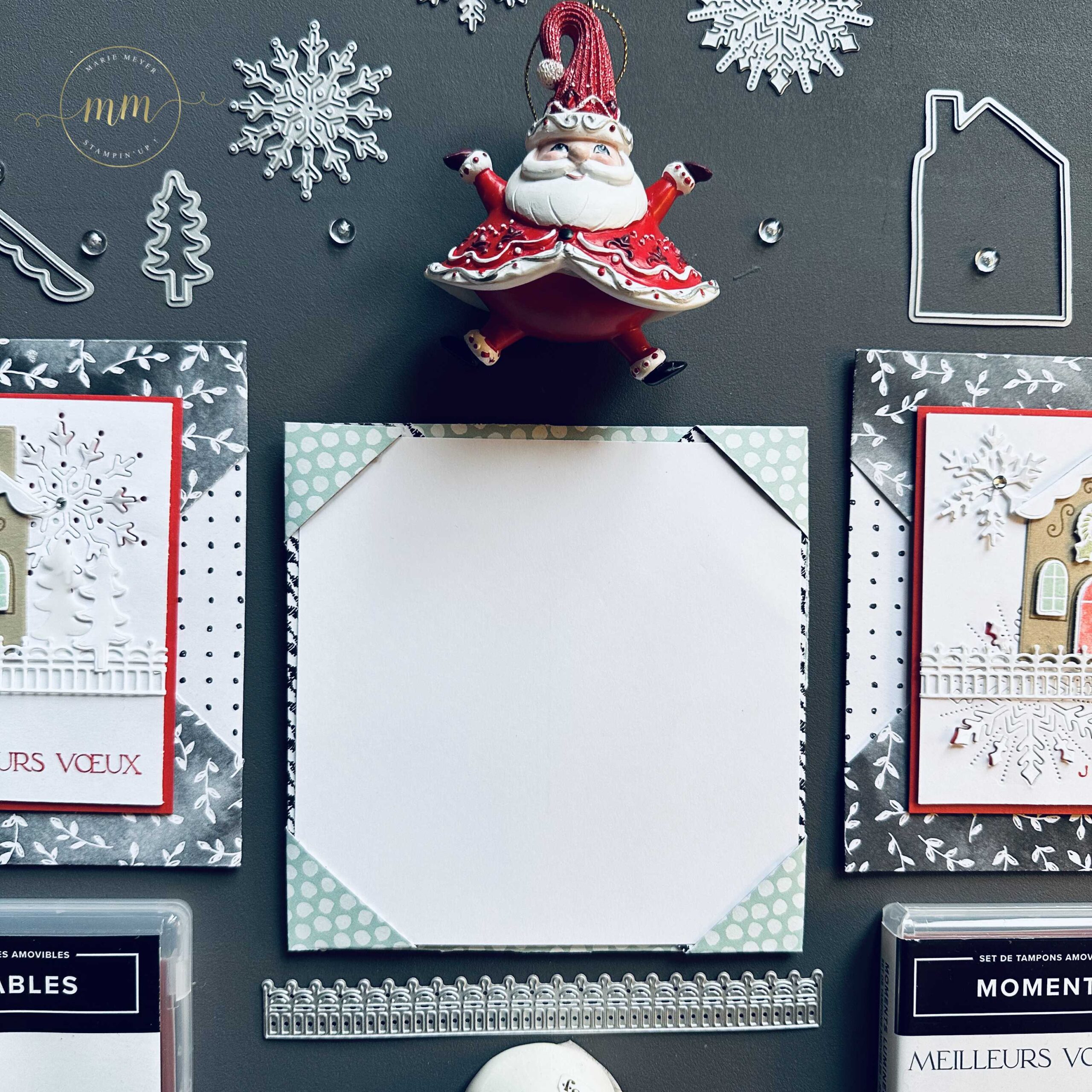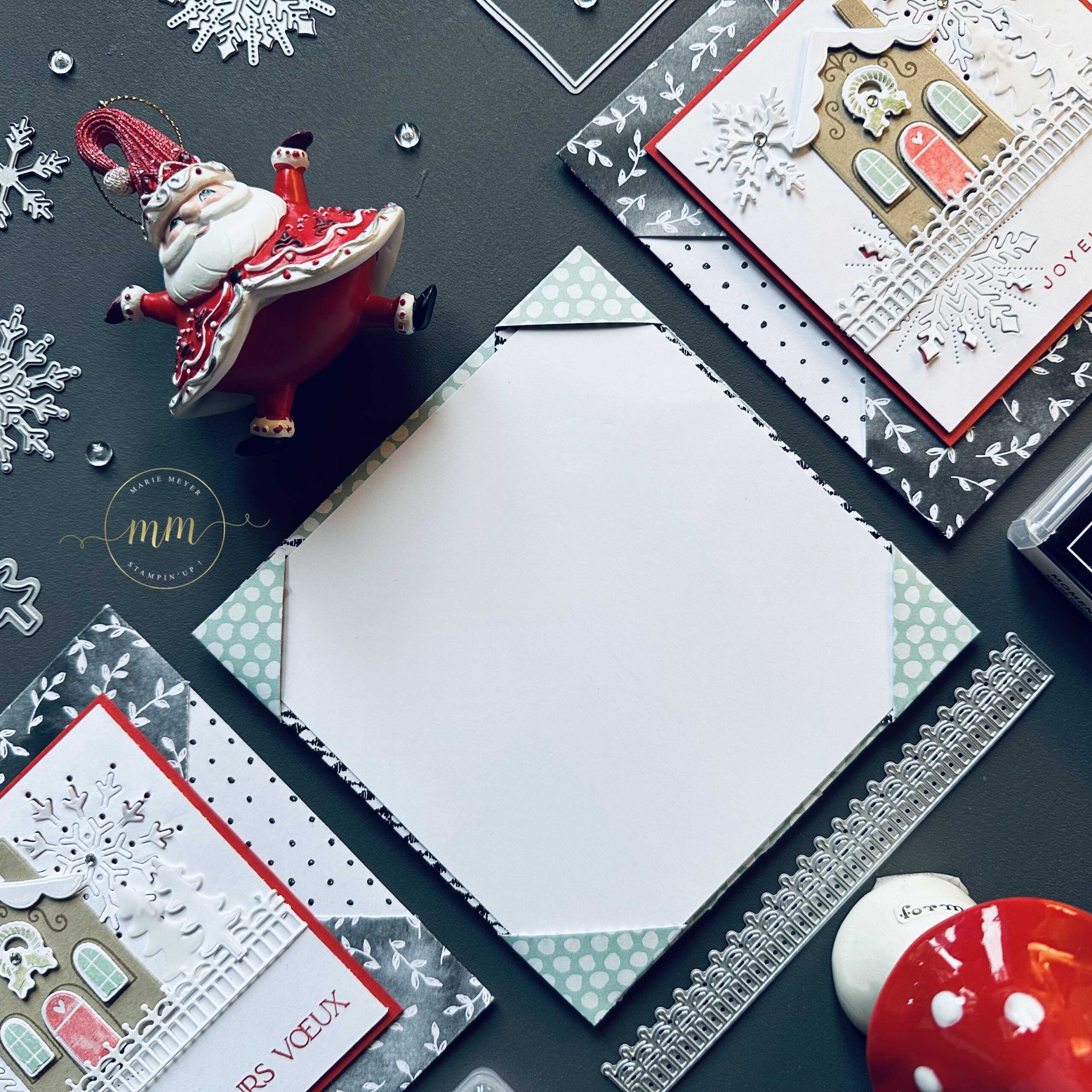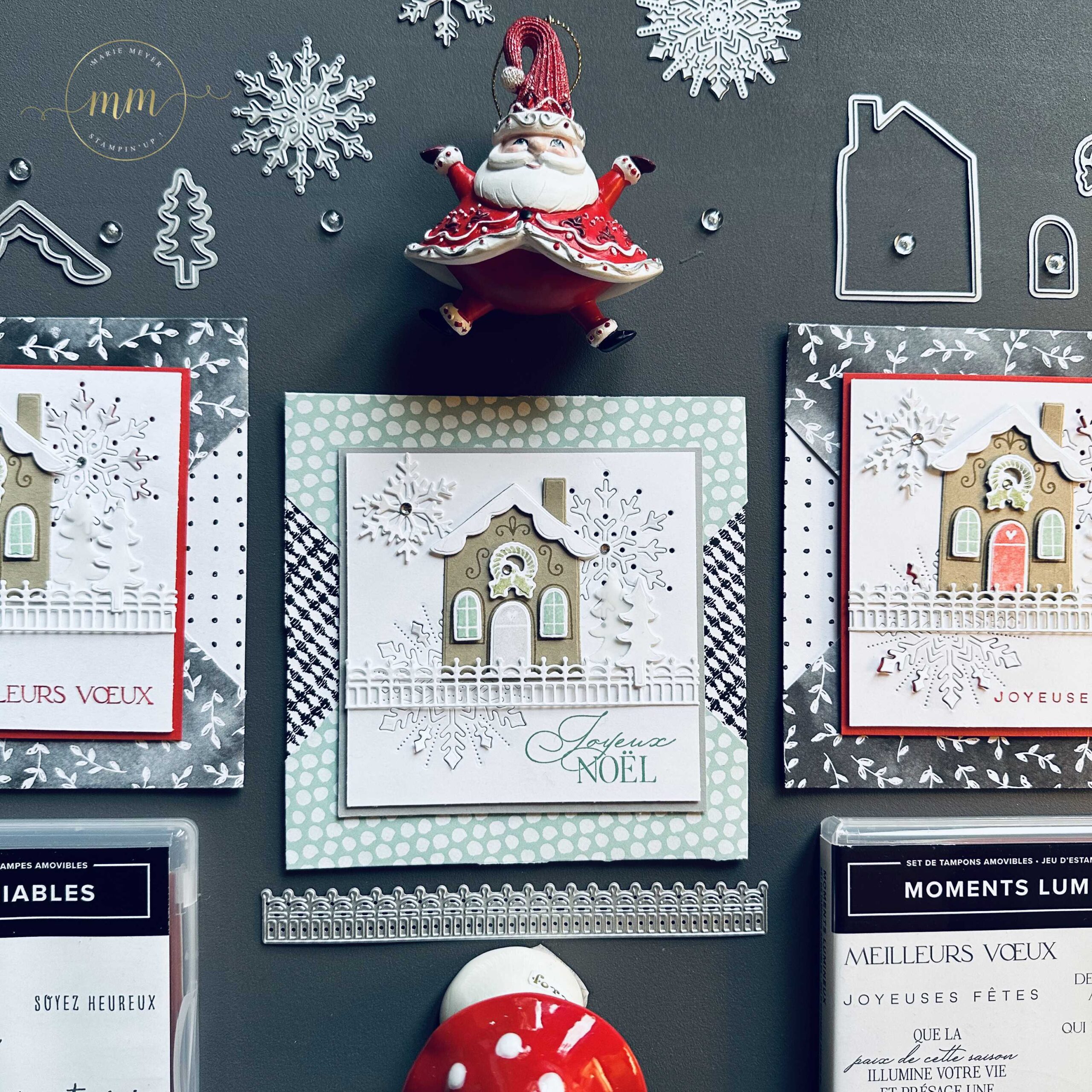 Tout se passe dans le pliage ! Voici l’ avant de la carte que j’ai réalisé avec le Set de tampons Sûrement vôtre que j’adore avec les Poinçons Maison en pains d’épices. En arrière plan, j’ai utilisé les Poinçons Flocons givrés. Quand au papier, je n’ai pas honte d’utiliser des papiers issus d’anciens catalogues, à savoir le Papier de la Série Design Motifs en fêtes et Papier de la Série Design Lavis en Gris. Si vous êtes comme moi, vous en possédez certainement un wagon et cela n’altère en rien la beauté du projet 😉 ! Et pour souhaitez les voeux, n’oublions pas le Set de tampons Moments Lumineux.