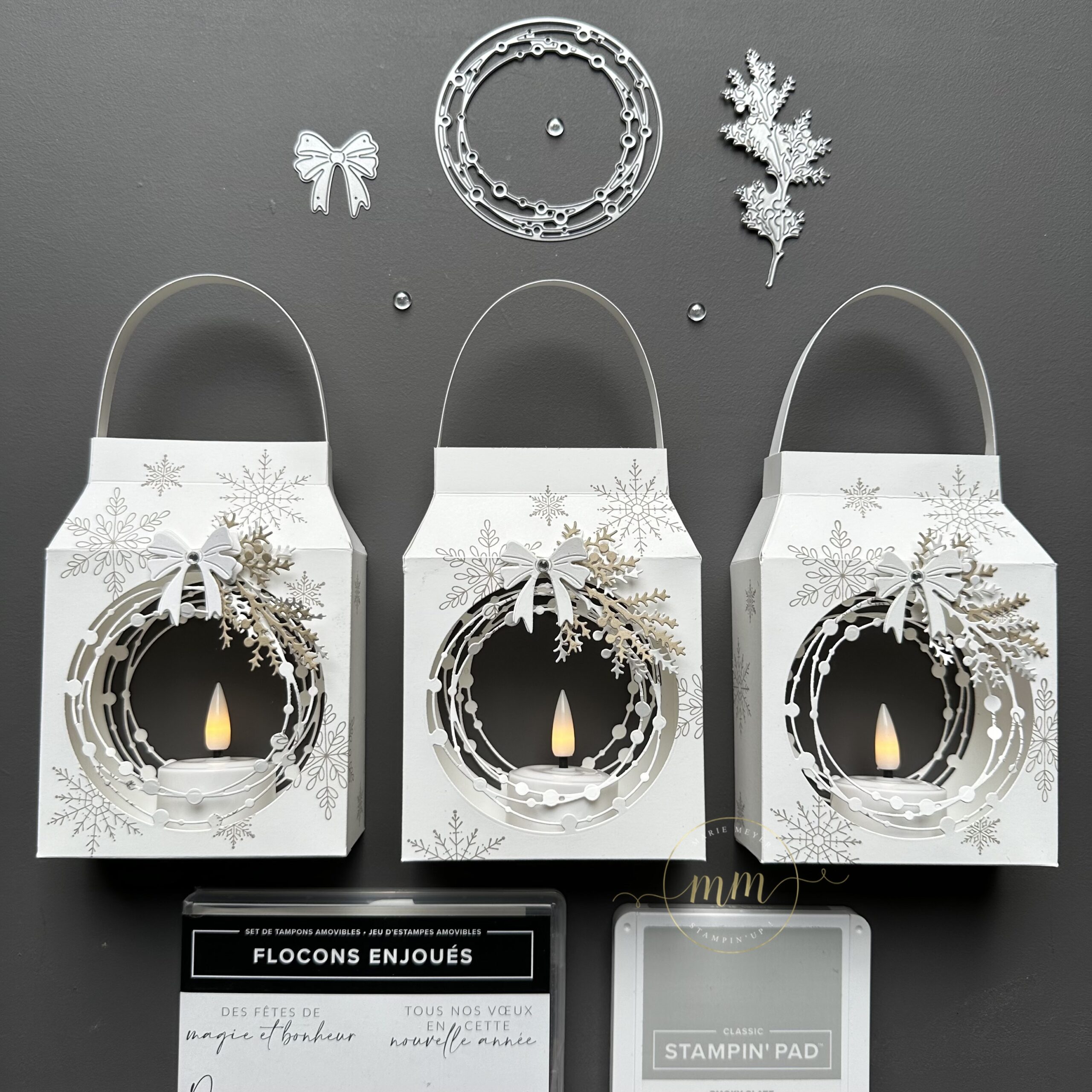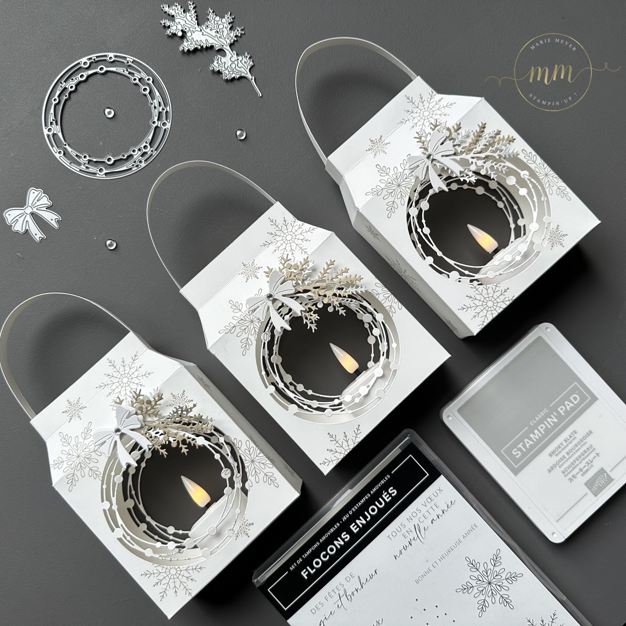 Et pour réaliser mes Lanternes de Noël, j’ai utilisé les Poinçons Lisière merveilleuse et Couronnes Champêtre ainsi que les Poinçons Fleurs irrésistibles et le Set de tampons Flocons Enjoués (qui ne sont plus dans nos catalogues), dans les coloris Murmure blanc, Brune dune et Ardoise bourgeoise.