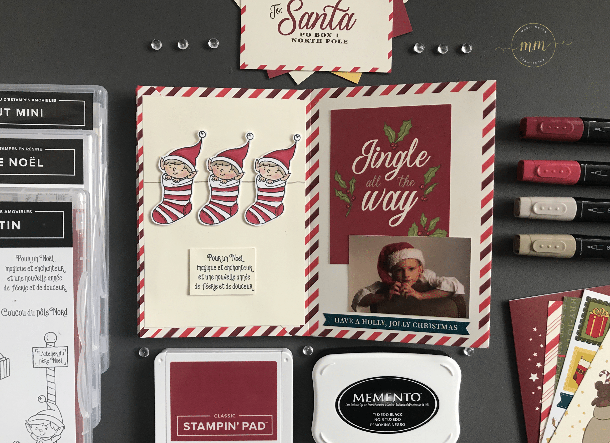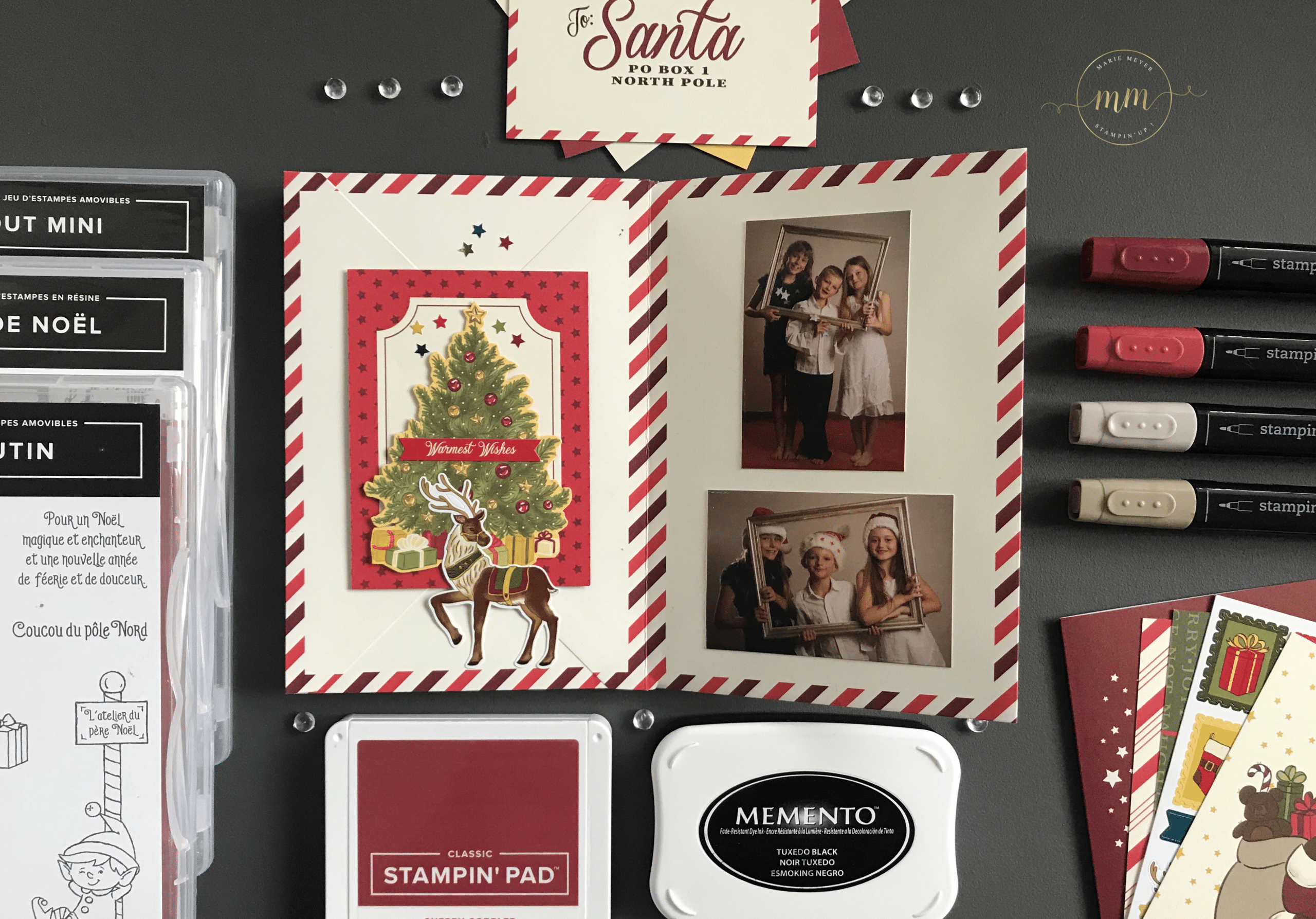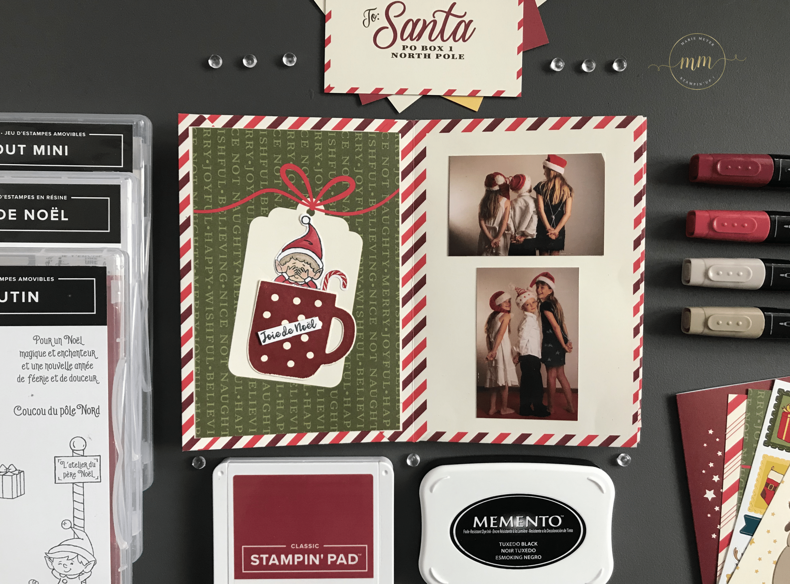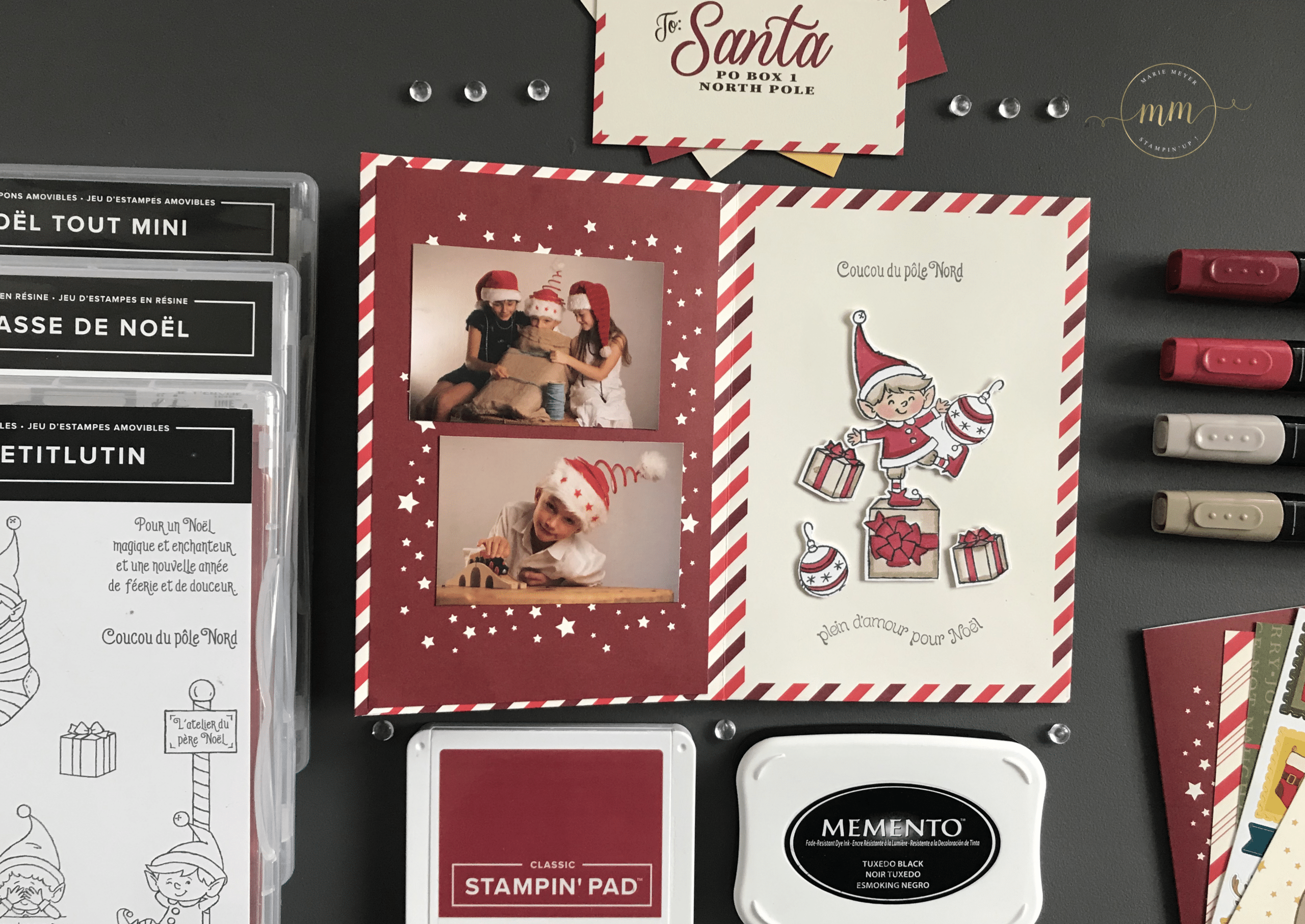 Les photos de mes enfants ont été prisent par mon Amie Karine Leroux, photographe professionnelle du magasin Kalephostudio à Bollwiller, que je remercie au passage du fond du coeur ! Elles dates déjà…. d’un mois d’août, il y a 3 ans….. mais sont juste parfaite pour mon mini !!!! Pour le tamponnage, j’ai utilisé le Set de tampons #Monpetitlutin, le Set de tampons Ùne tasse de Noël et également le Set de tampons Noël Tout mini colorisé avec les Stampin’Blends Cerise carmin et Brune dune.