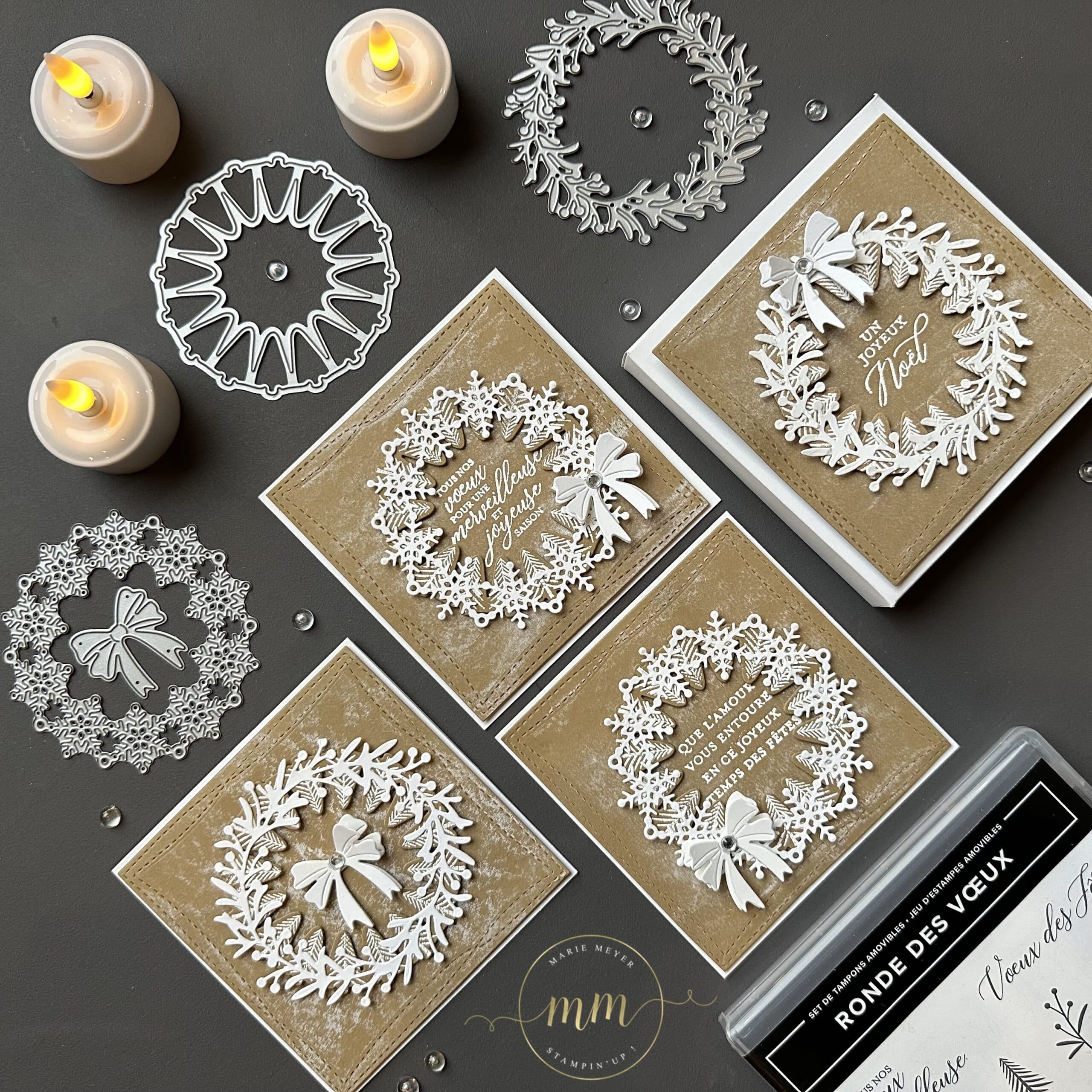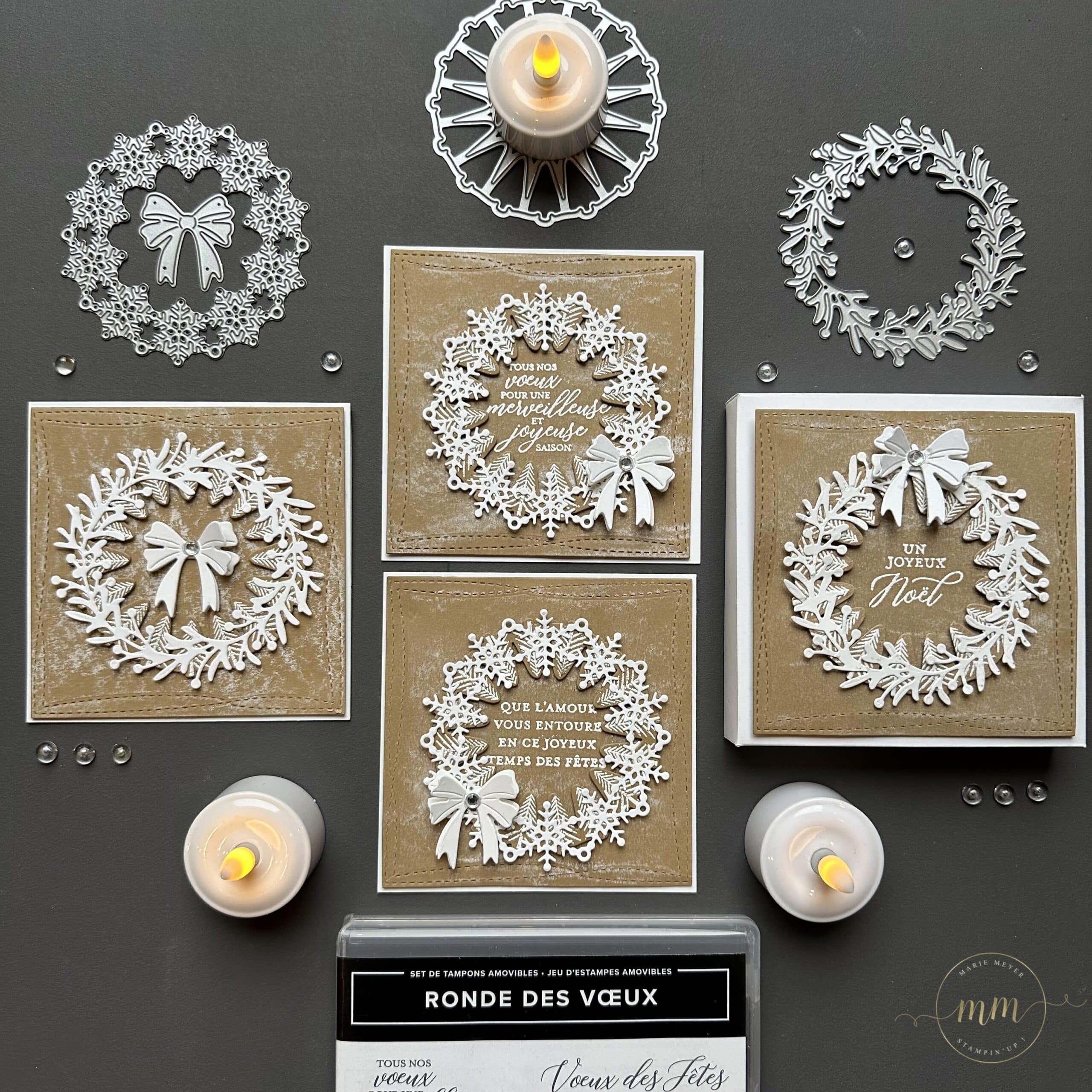 Pour se faire, j’ai utilisé le Lot Ronde des Voeux comprenant le Set de tampons Ronde des Voeux et les Poinçons Rondes des voeux et le petit noeuds des Poinçons Couronnes Champêtres.